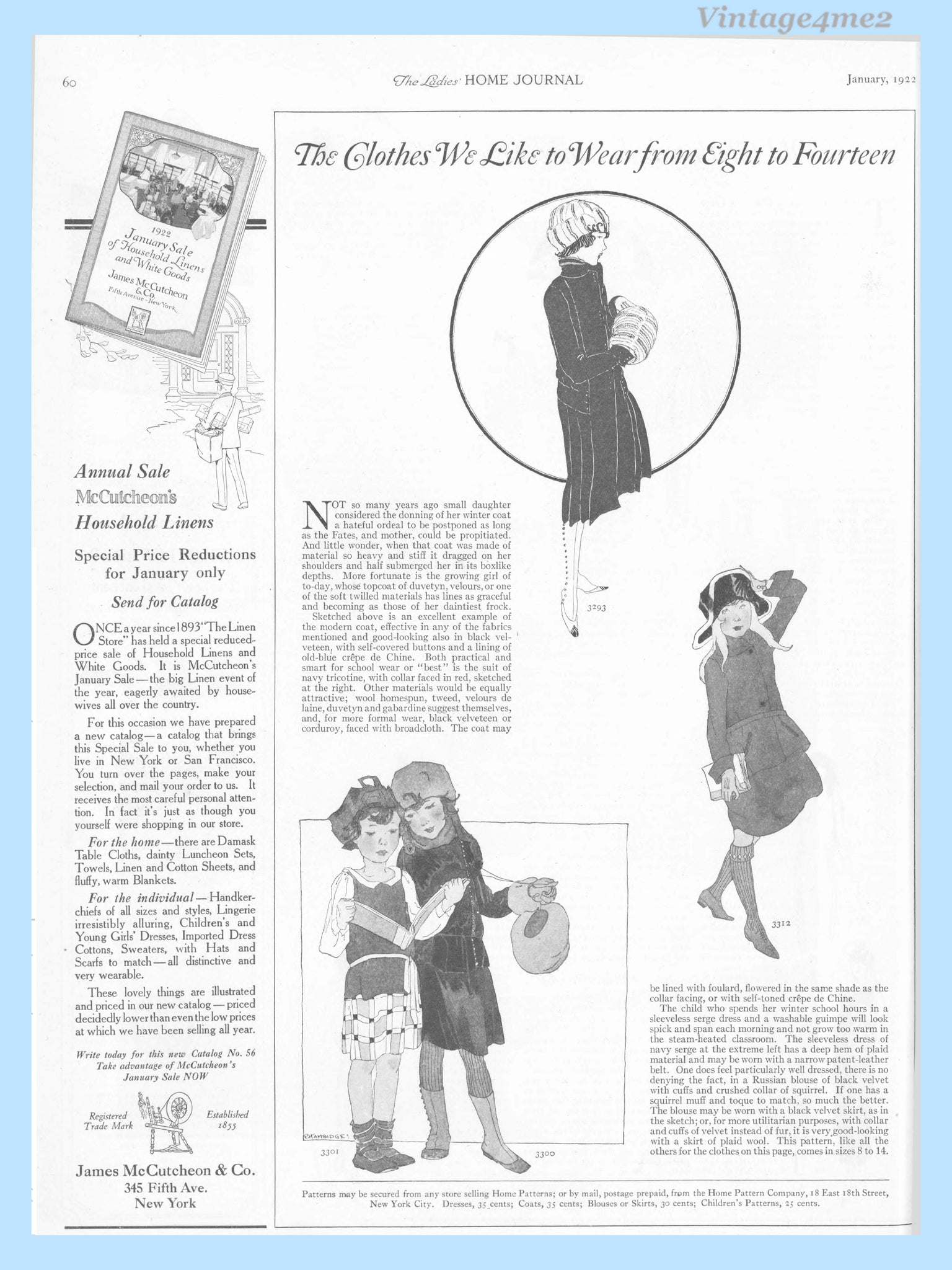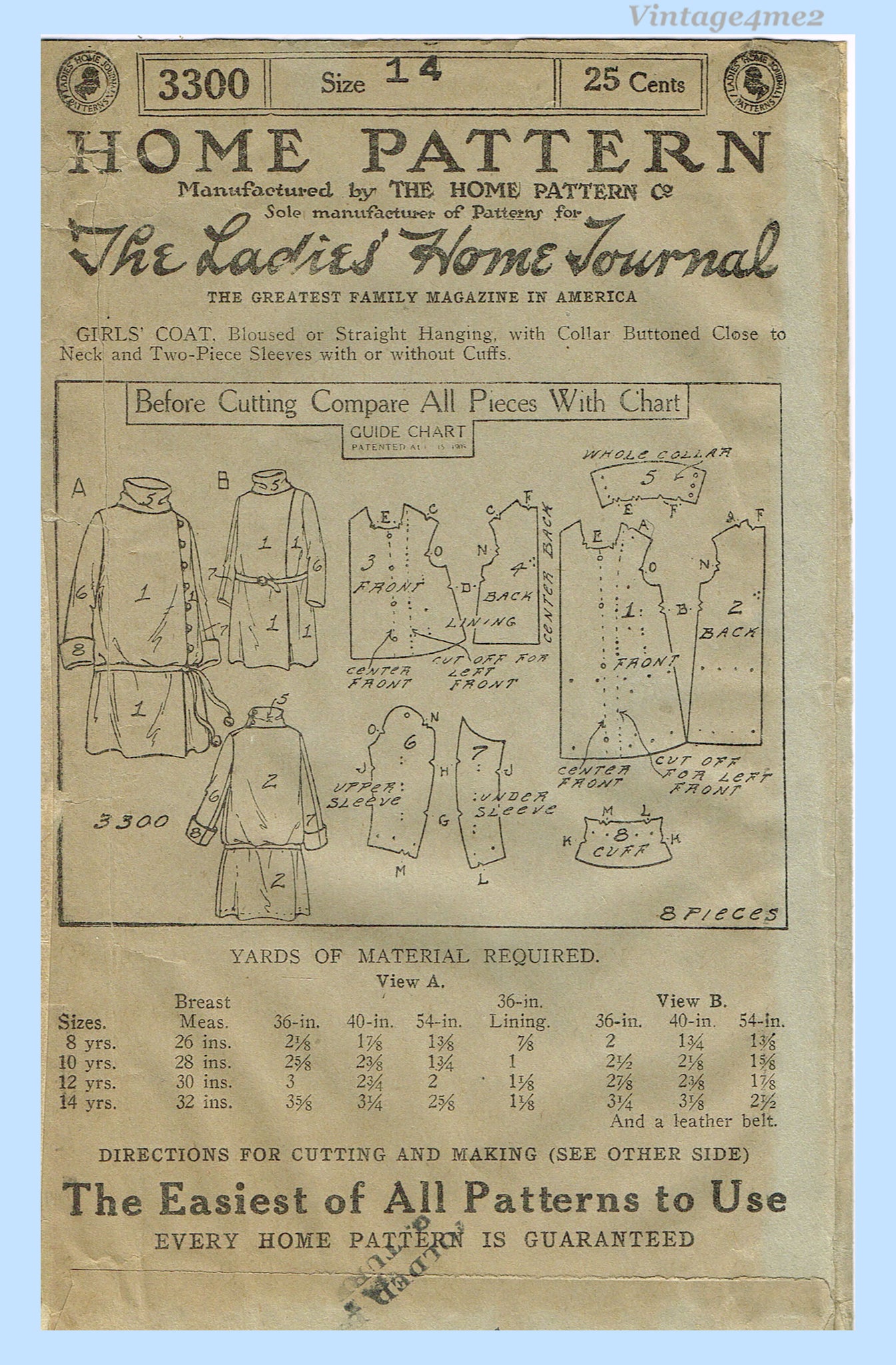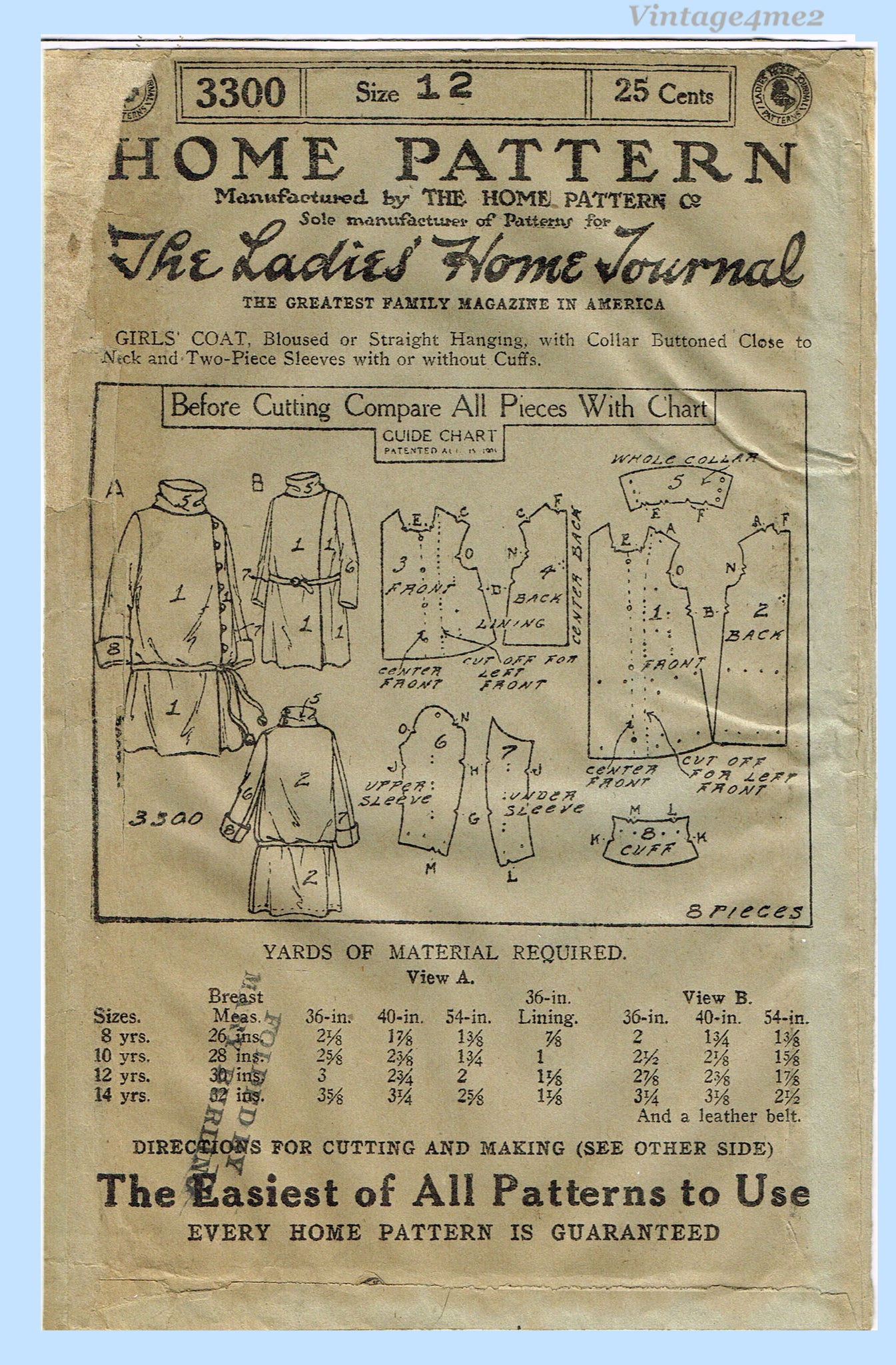 Ladies Home Journal 3300: 1920s Uncut Girls Winter Coat Vintage Sewing Pattern