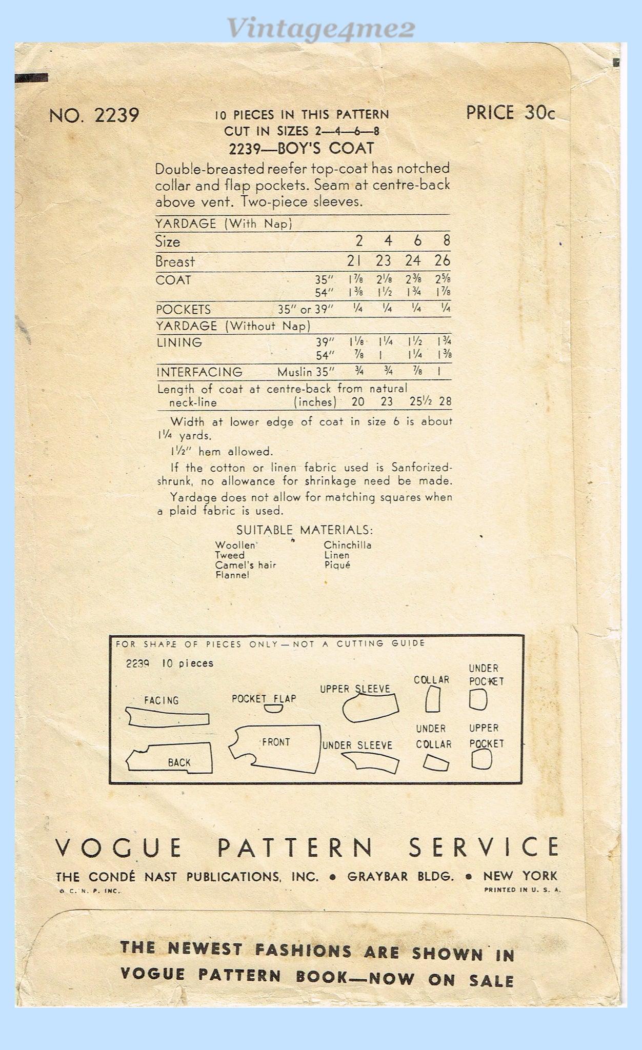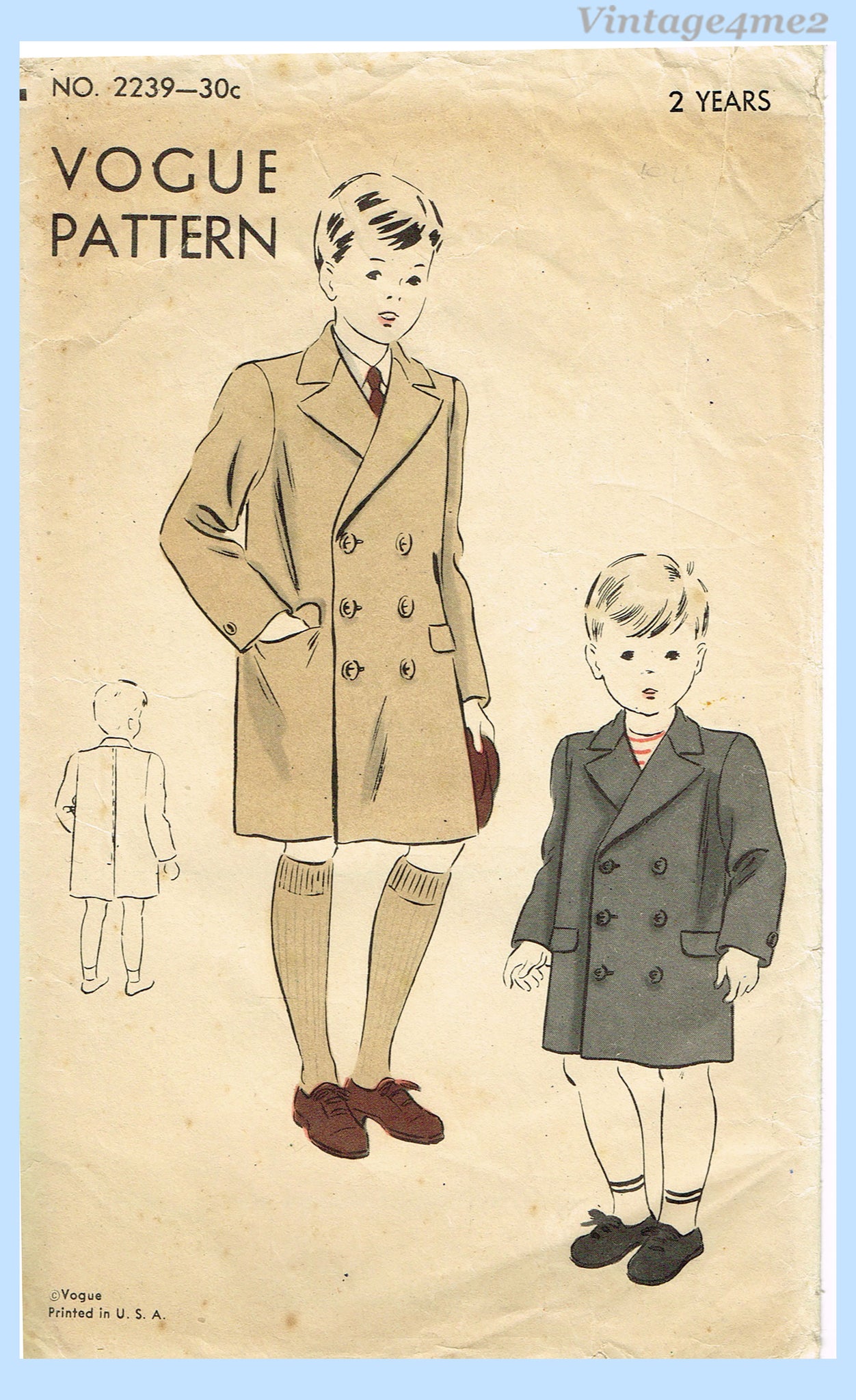 1940s Vintage Vogue Sewing Pattern 2239 Classic WWII Baby Boys Coat Sz 2