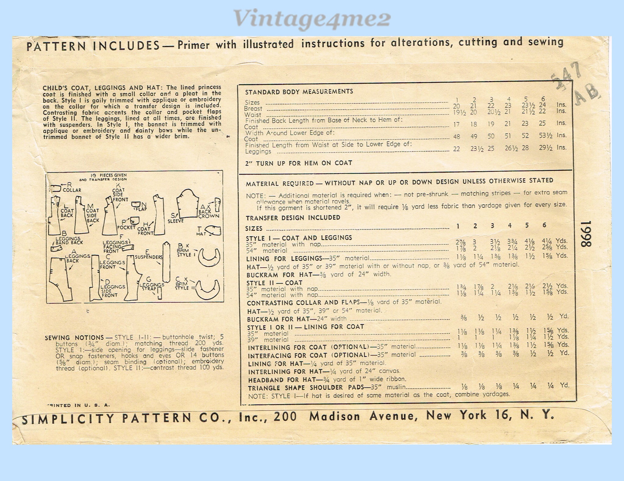 Simplicity 1998: 1940s Cute Toddler Girls Coat & Hat Sz 1 Vintage Sewing Pattern