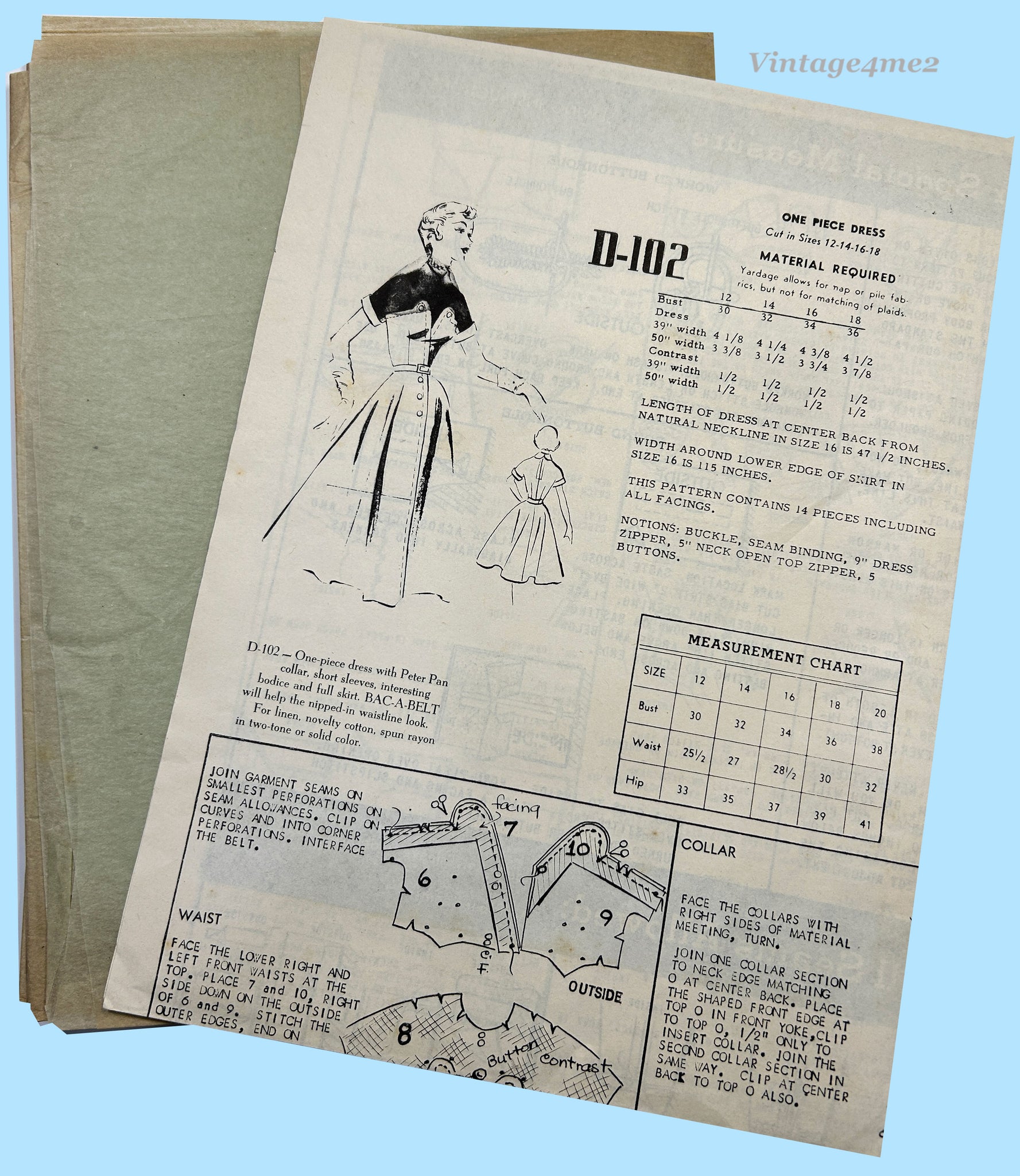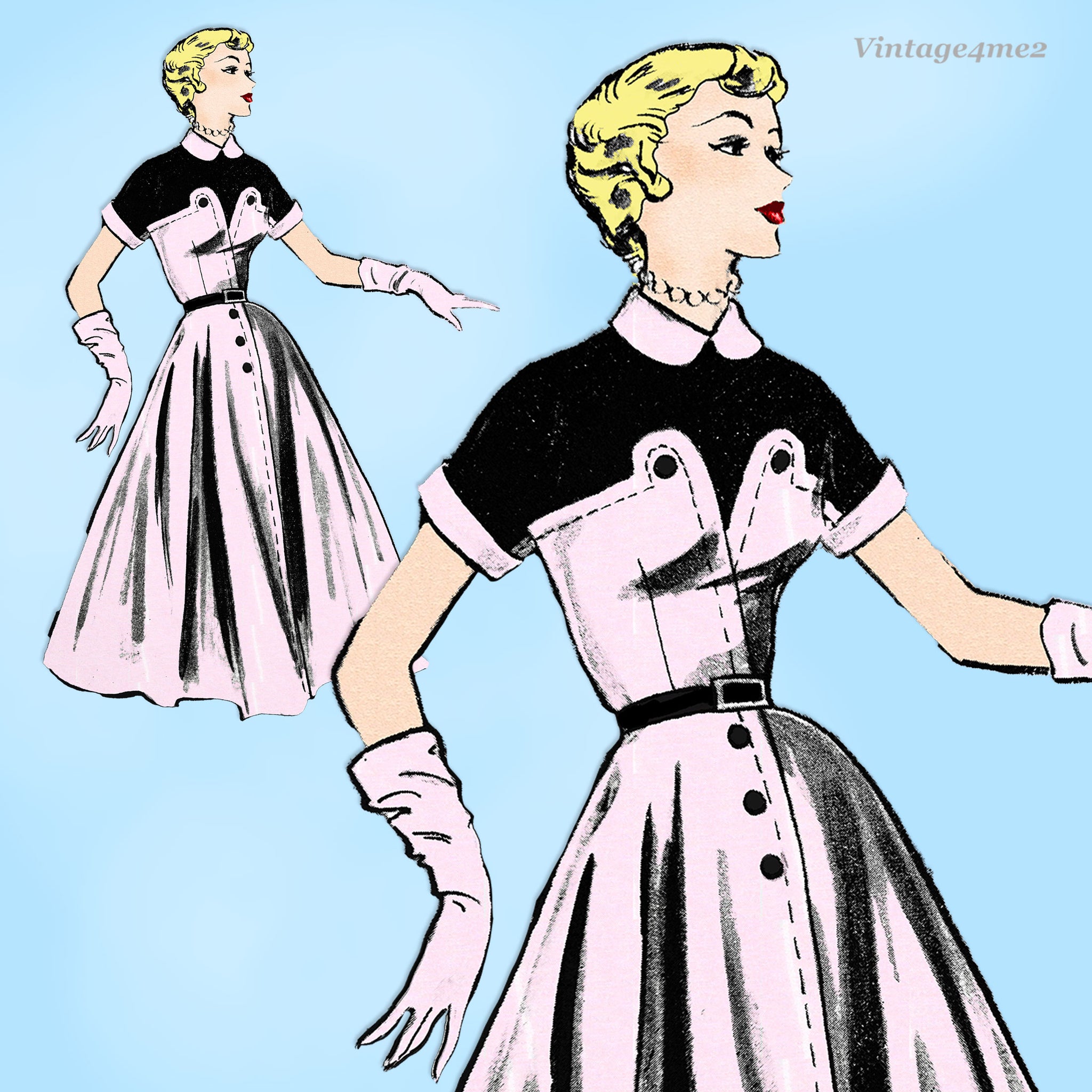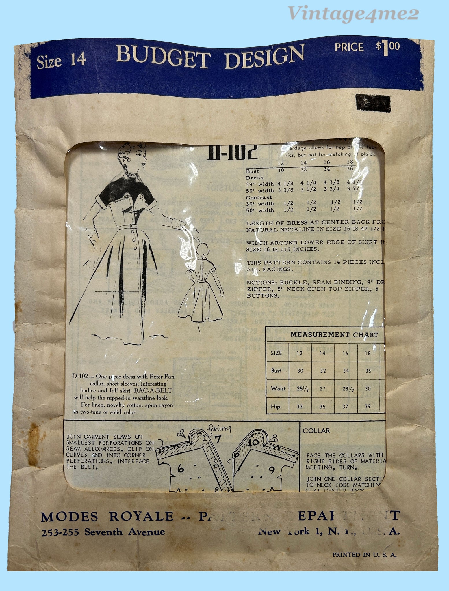 "Modes Royale D-102; ca. 1950s; One Piece Dress. One-piece dress with Peter Pan collar, short sleeves, interesting bodice and full skirt. Bac-A-Belt will help the nipped-in waistline look. For linen, novelty cotton, spun rayon in two-tone or solid colors."
