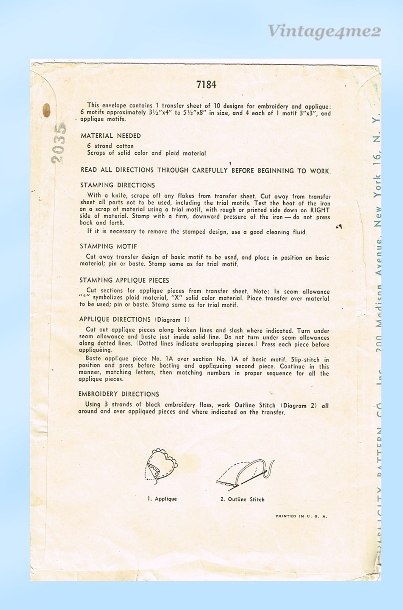 This is a rare embroidery transfer from Simplicity in 1946. This charming transfer uses applique motifs to make tea towels, cafe curtains, placemats or napkins.