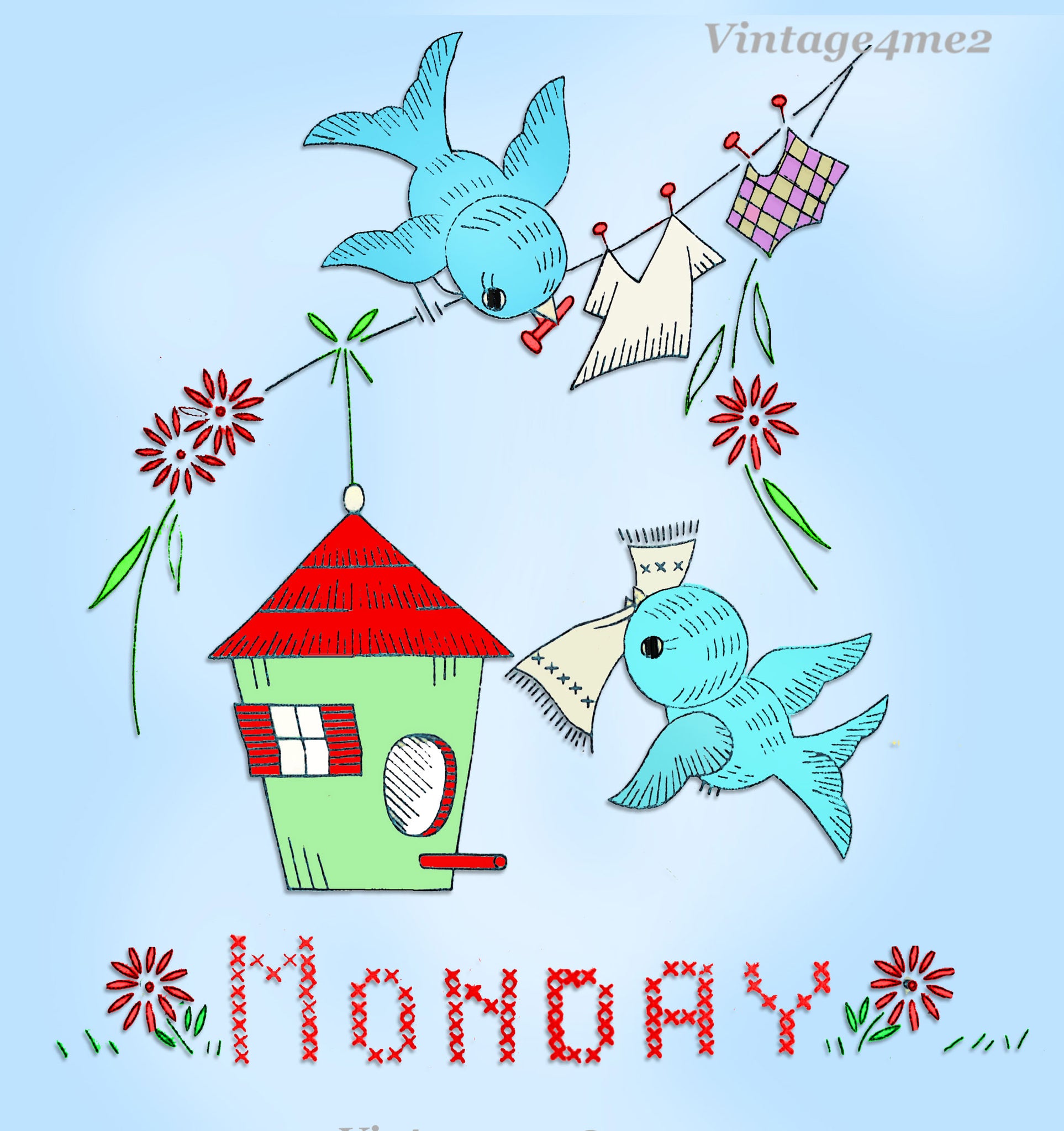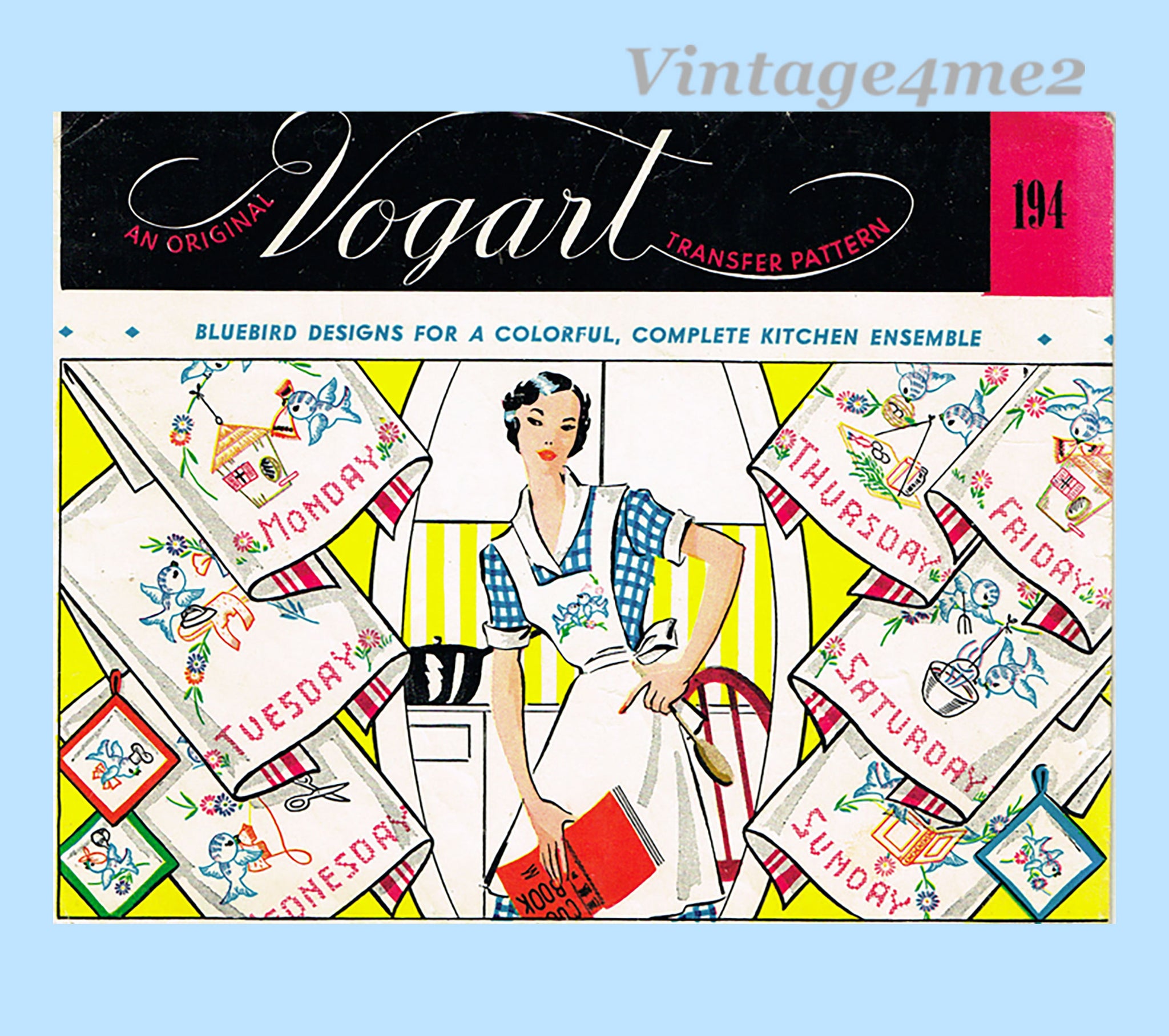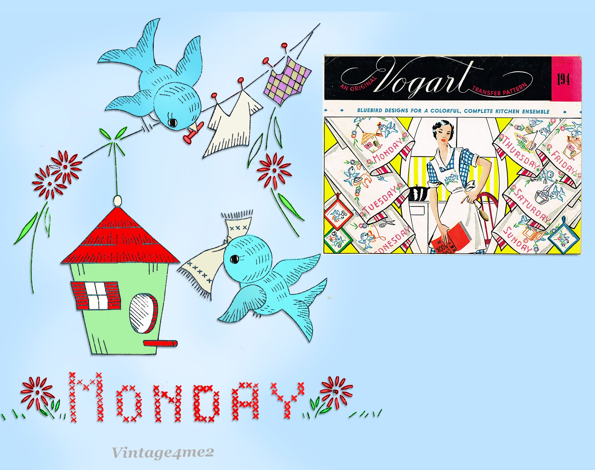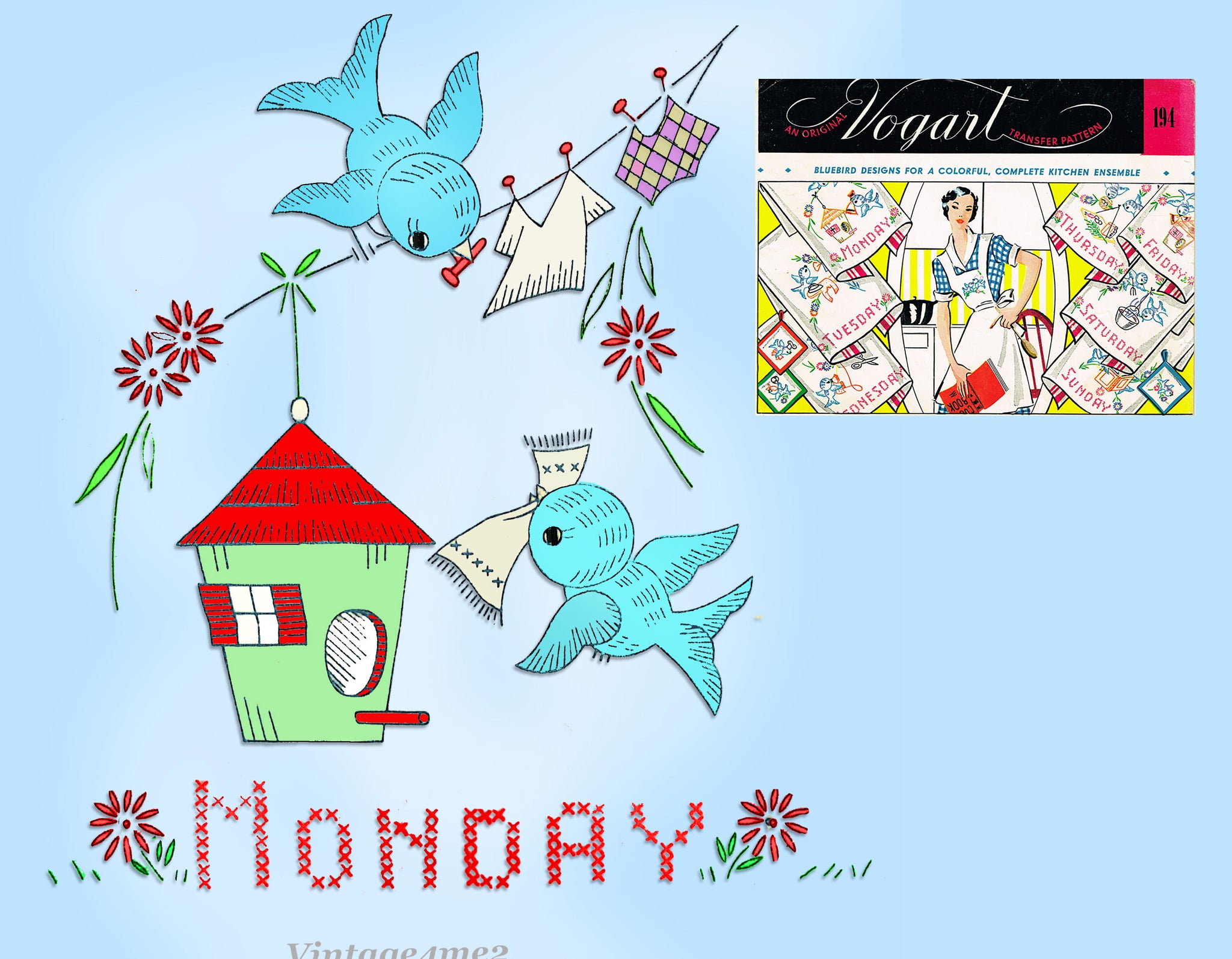 This cute transfer is from Vogart in the 1950s. It is a cute "Day of the Week" design for bird lovers. It has a helpful bird working it's way through the week in a chore a day. It is factory folded and unused and comes in the original 1950s envelope with black top band