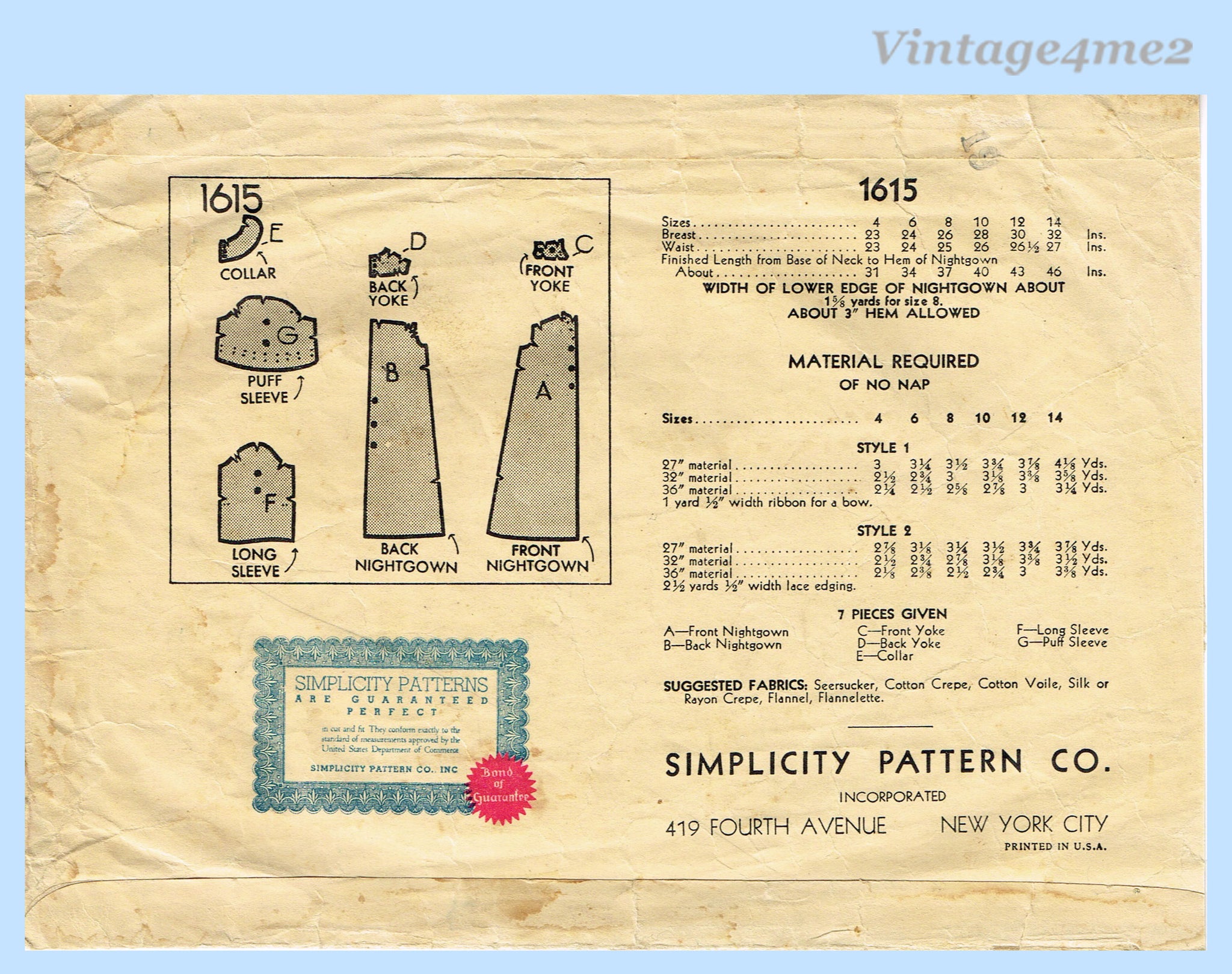 Simplicity 1615: 1930s Sweet Little Girls Nightgown Sz 14 Vintage Sewing Pattern