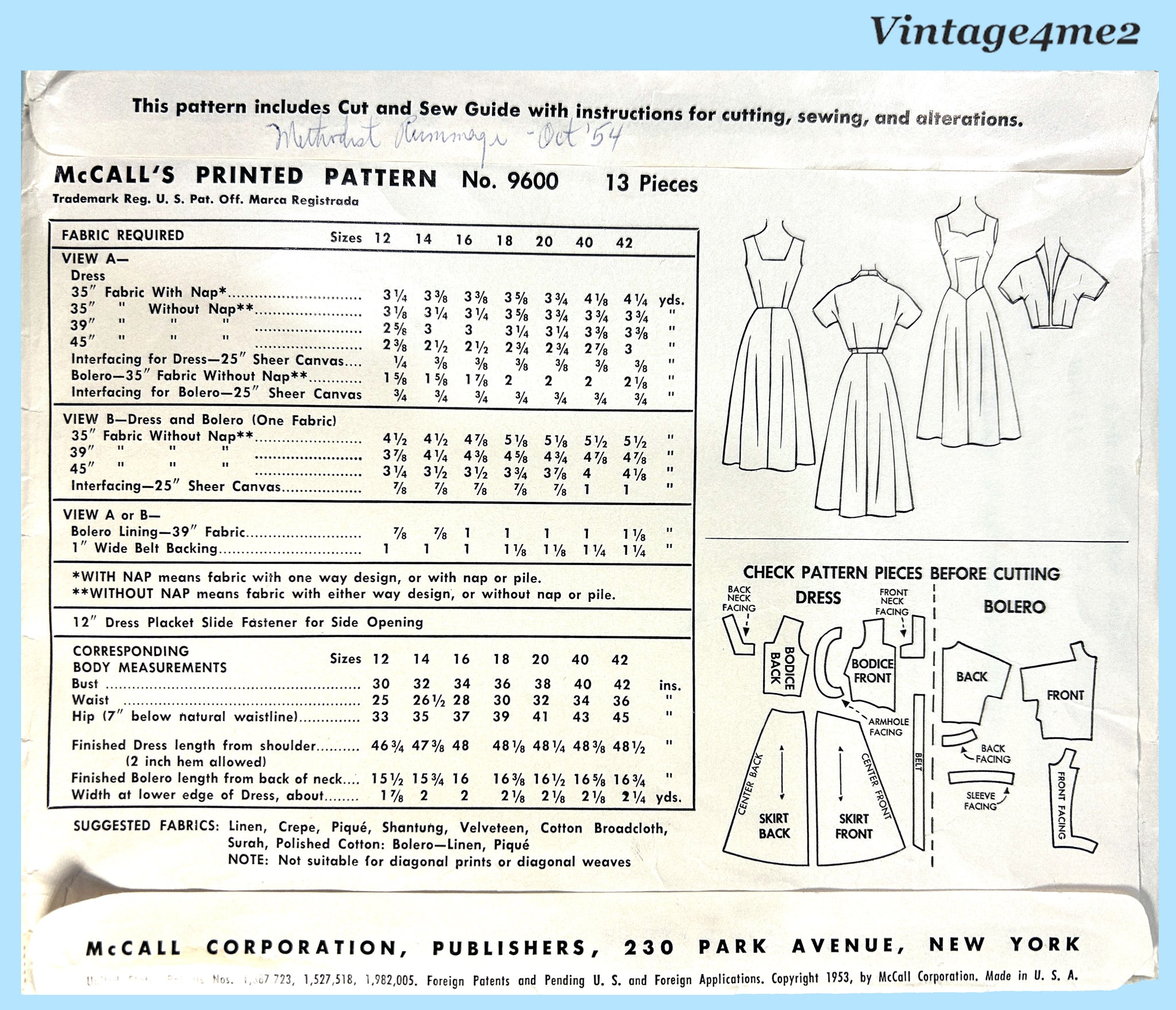 1950s Vintage McCall's Sewing Pattern 9600 Misses Sun Dress & Jacket Sz 32 B