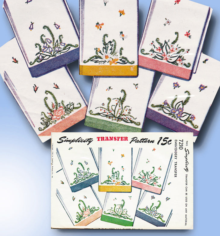 This is a charming Simplicity hot iron transfer dated 1946. It has stylish flower and fern motifs with an artistic flare. They are the perfect size for hand or guest towels. This transfer is factory folded and unused and comes in the original envelope.