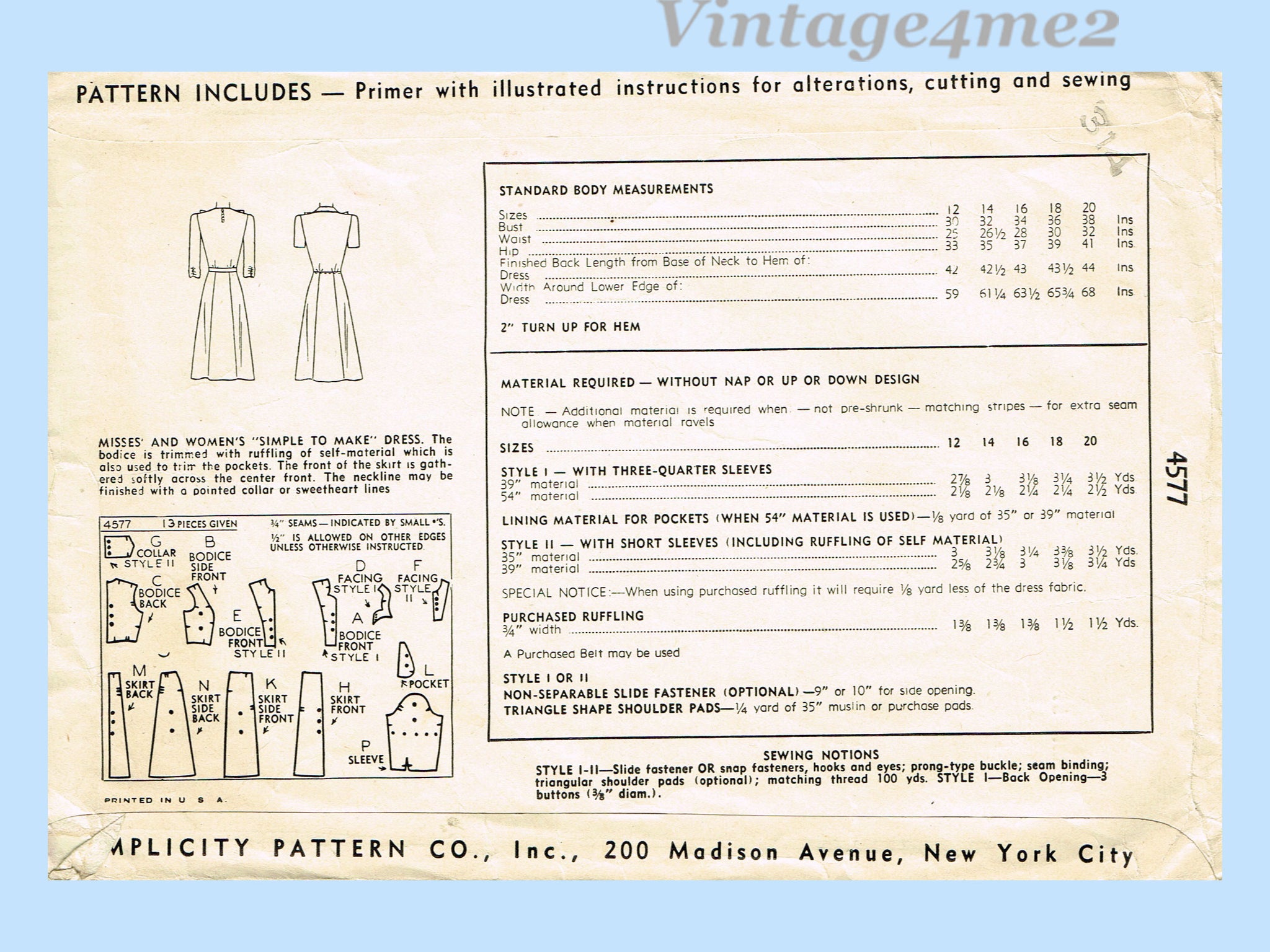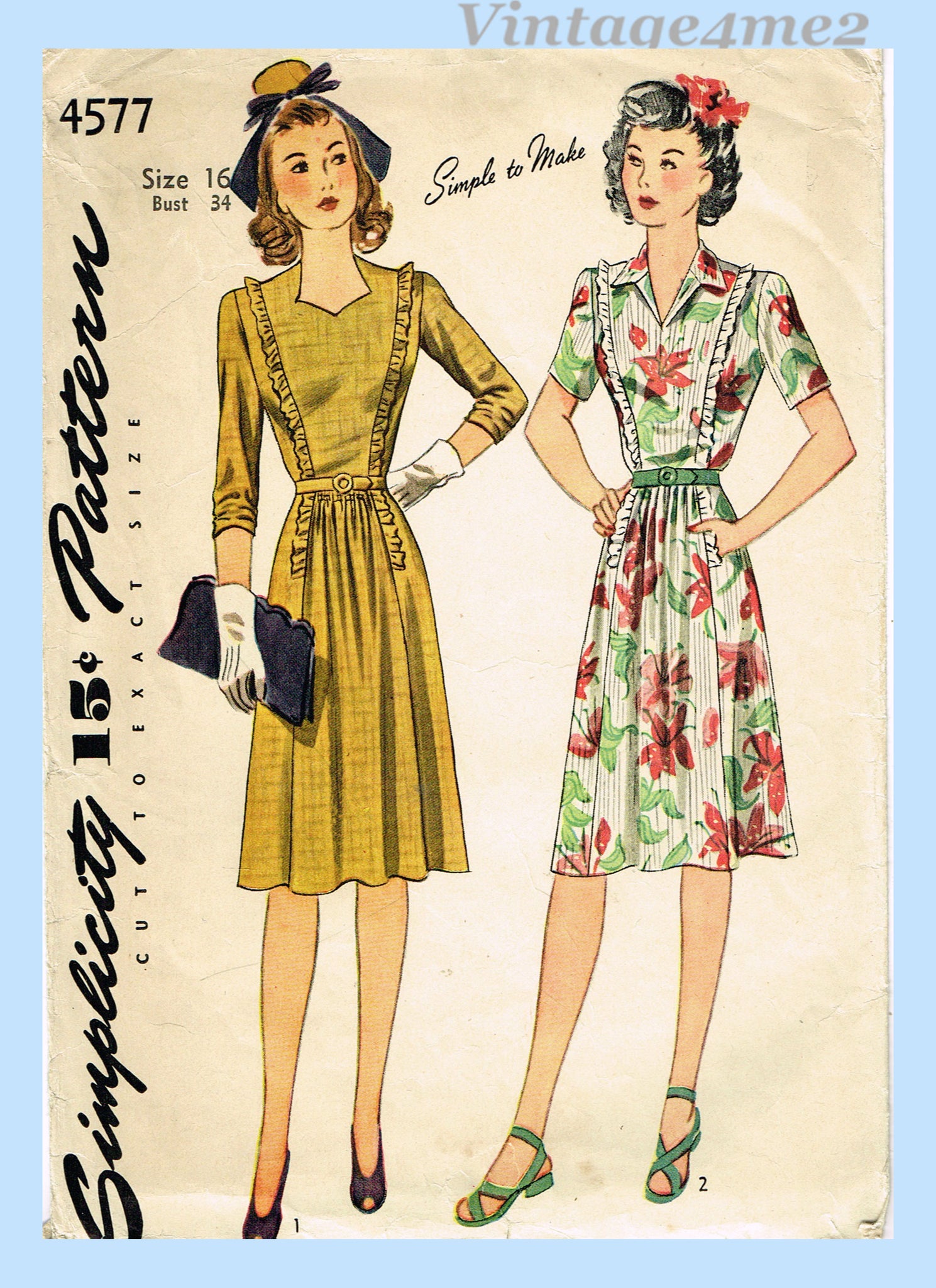Simplicity 4577: 1940s Easy Misses WWII Day Dress Sz 34 B Vintage Sewing Pattern
