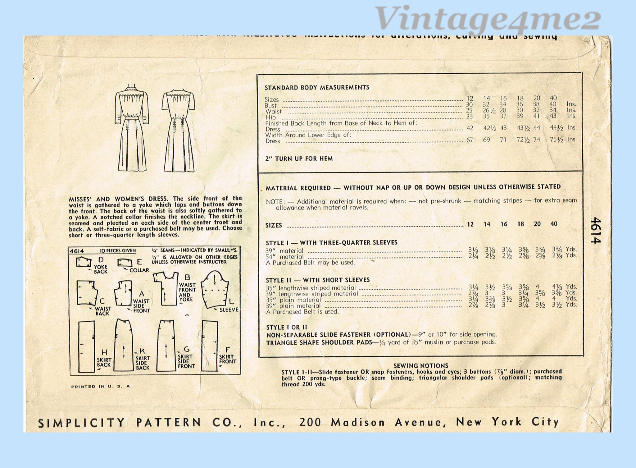 Simplicity 4614: 1940s Misses WWII Street Dress Sz 34 B Vintage Sewing Pattern