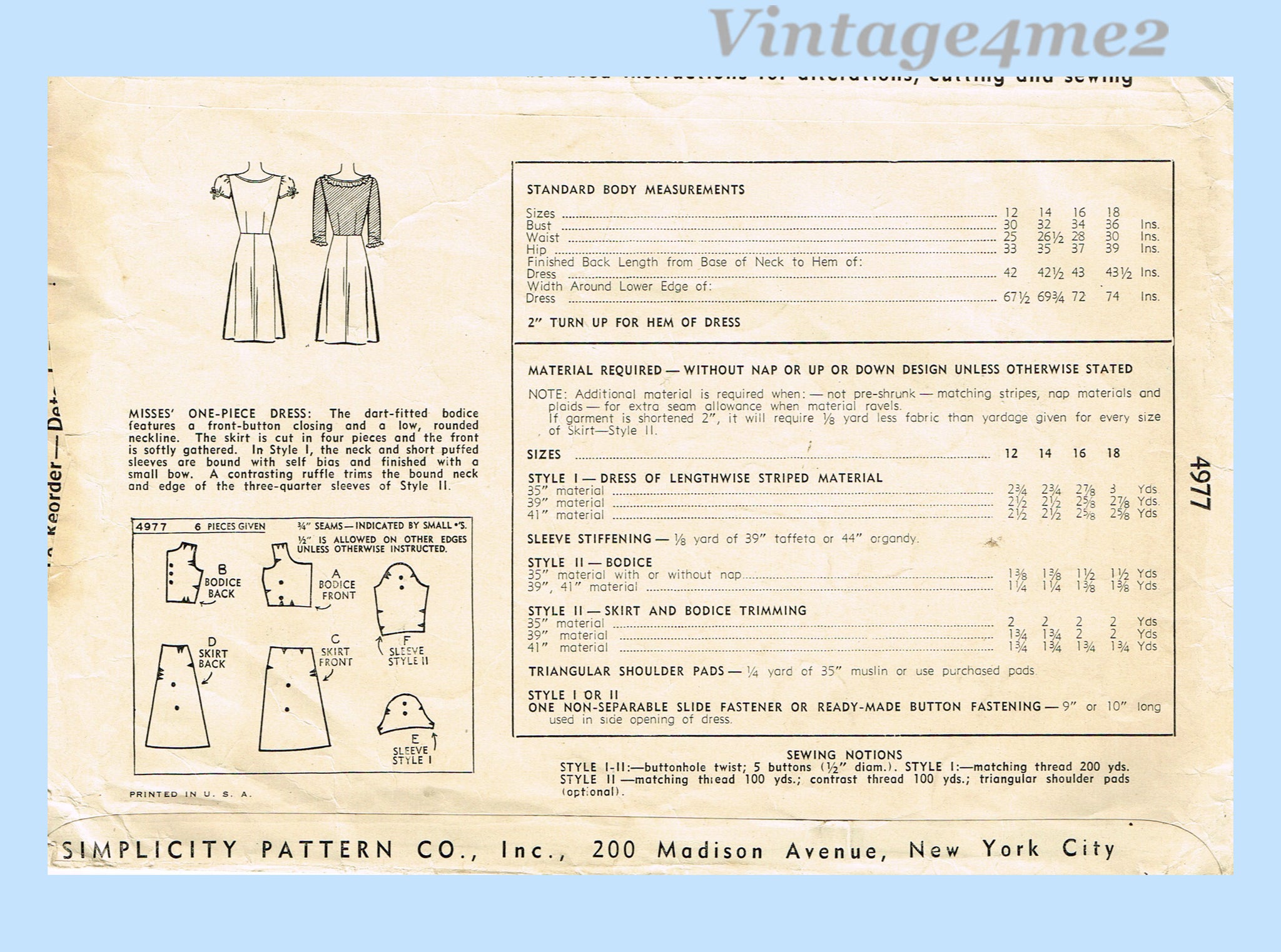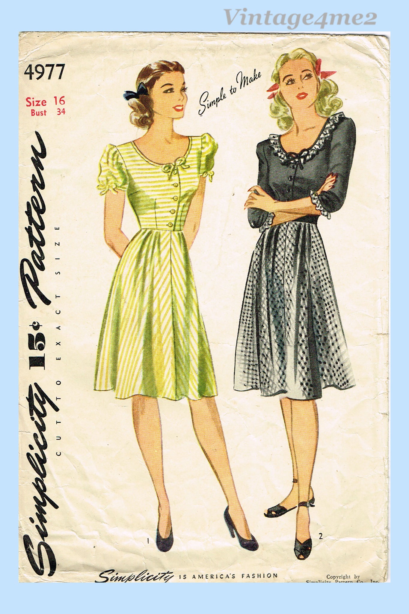 Simplicity 4977: 1940s Uncut Misses Easy WWII Dress 34B Vintage Sewing Pattern