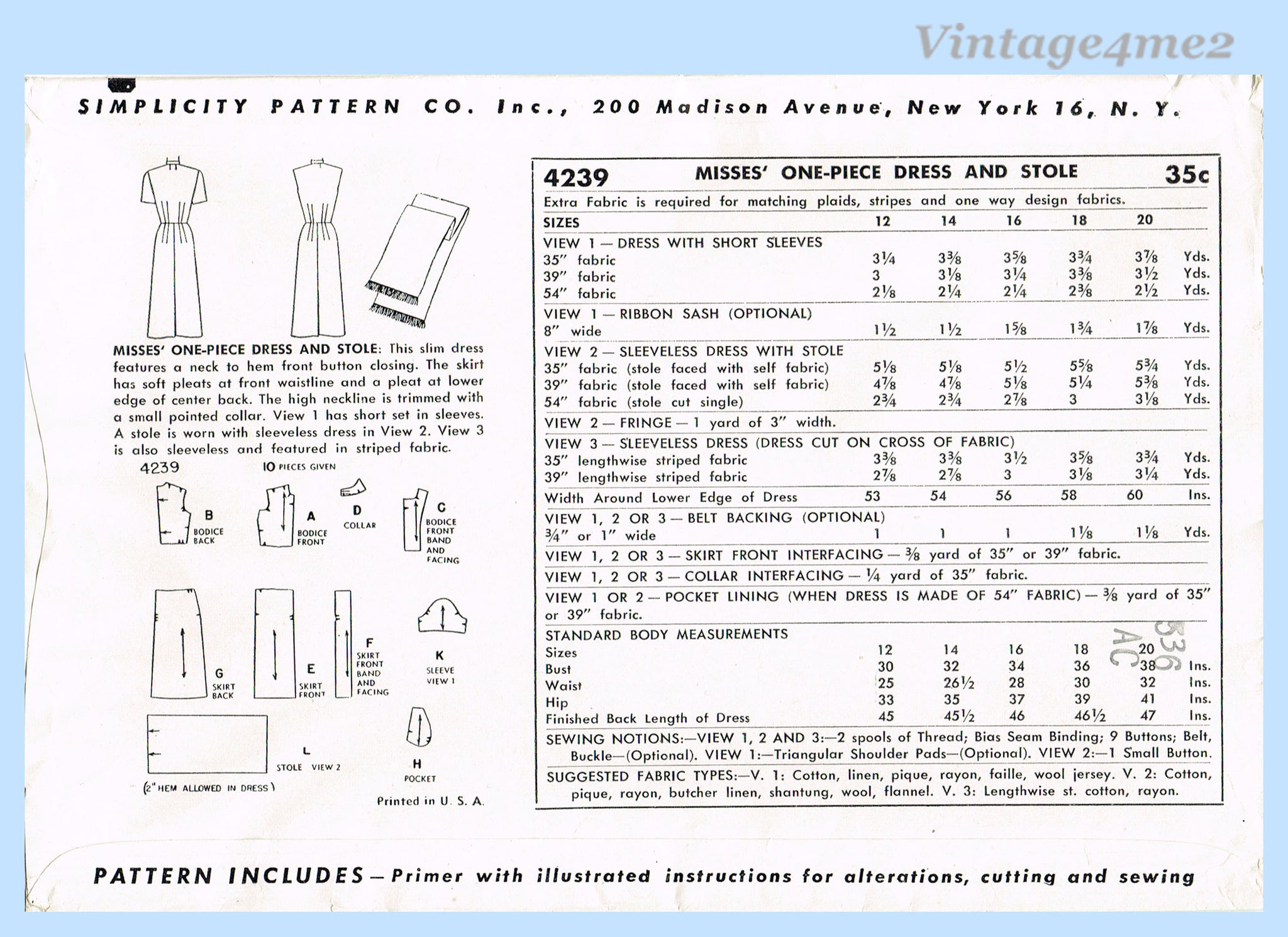 Simplicity 4239: 1950s Uncut Misses Sun Dress & Stole 32B Vintage Sewing Pattern