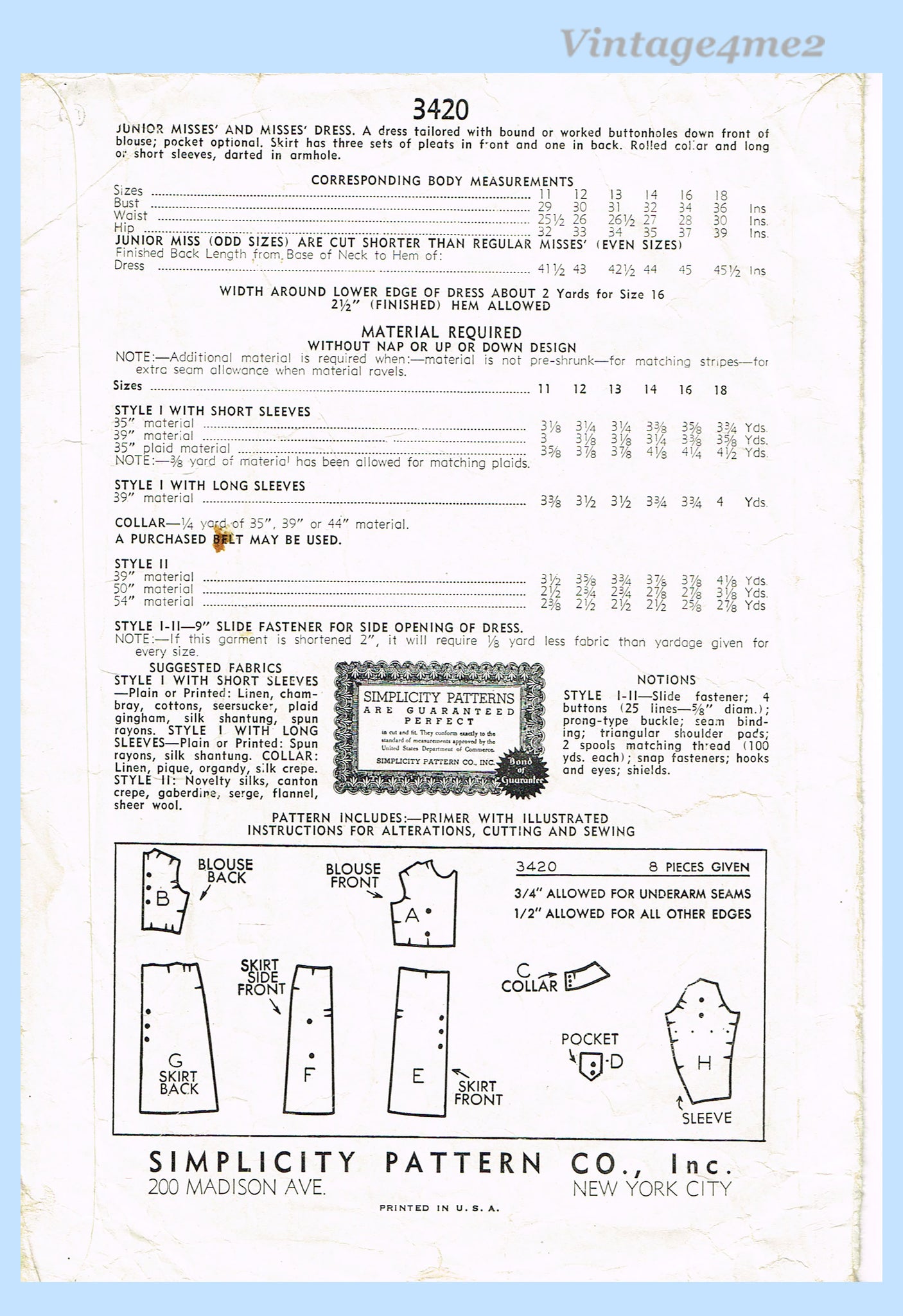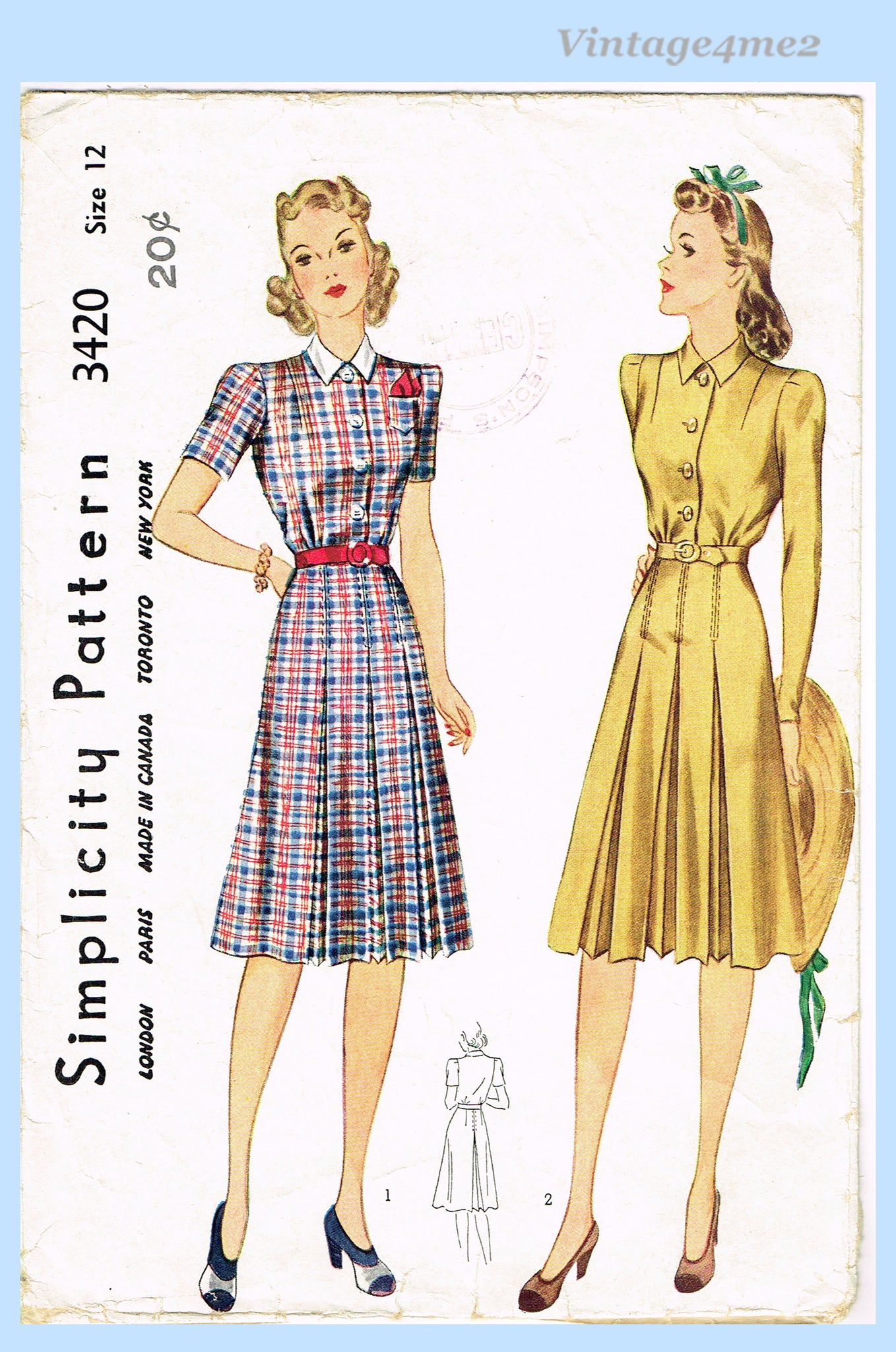 1940s Vintage Simplicity Sewing Pattern 3420 Lovely Misses WWII Dress Sz 30 B