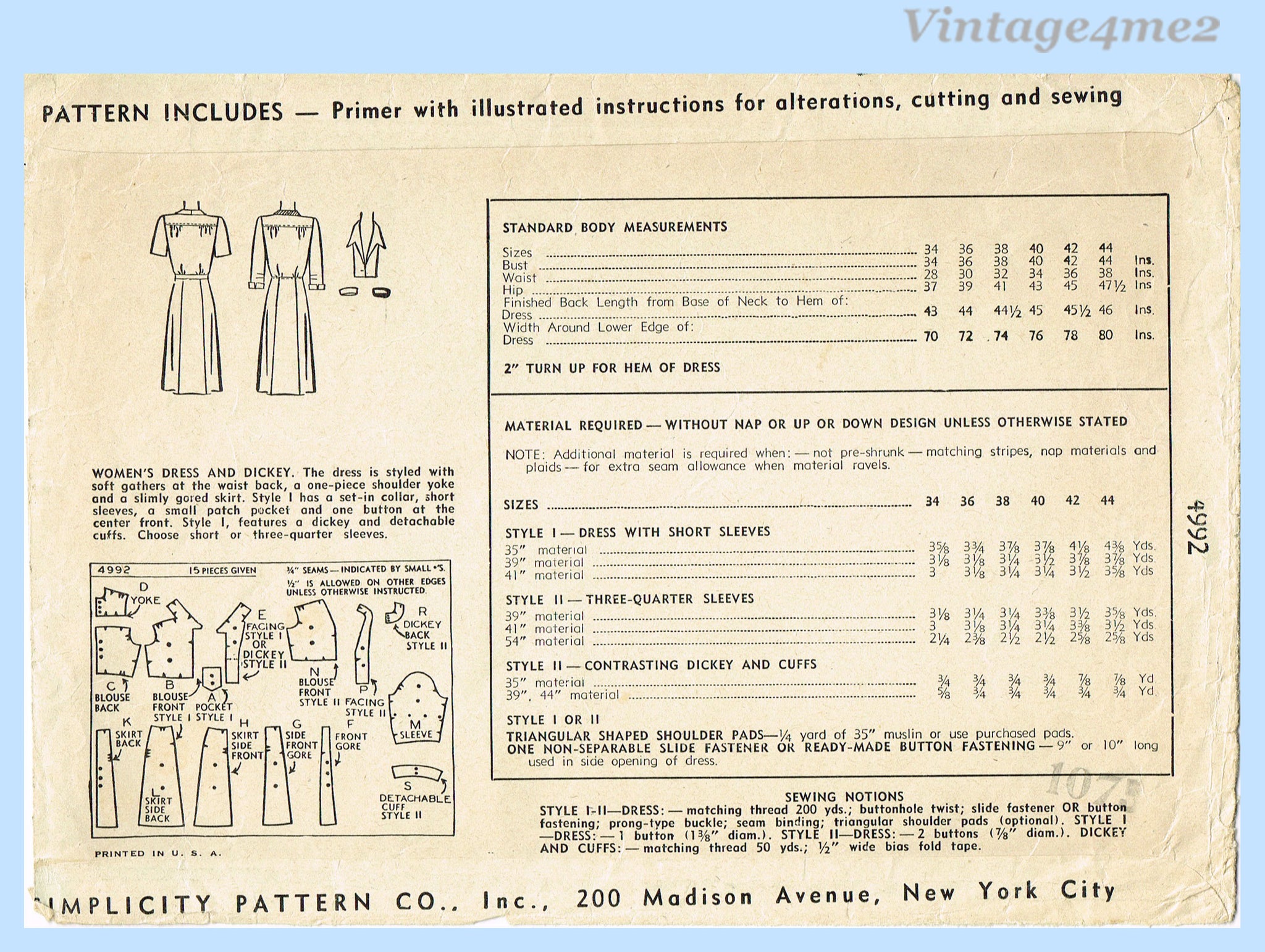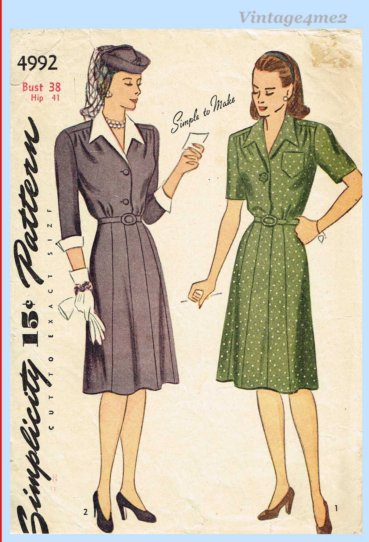 1940s Vintage Simplicity Sewing Pattern 4992 Easy Misses WWII Dress Sz 38 B