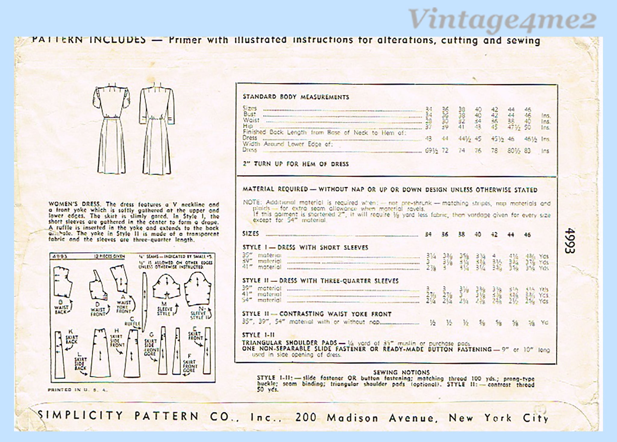 1940s Vintage Simplicity Sewing Pattern 4993 Misses WWII Street Dress Sz 38 B