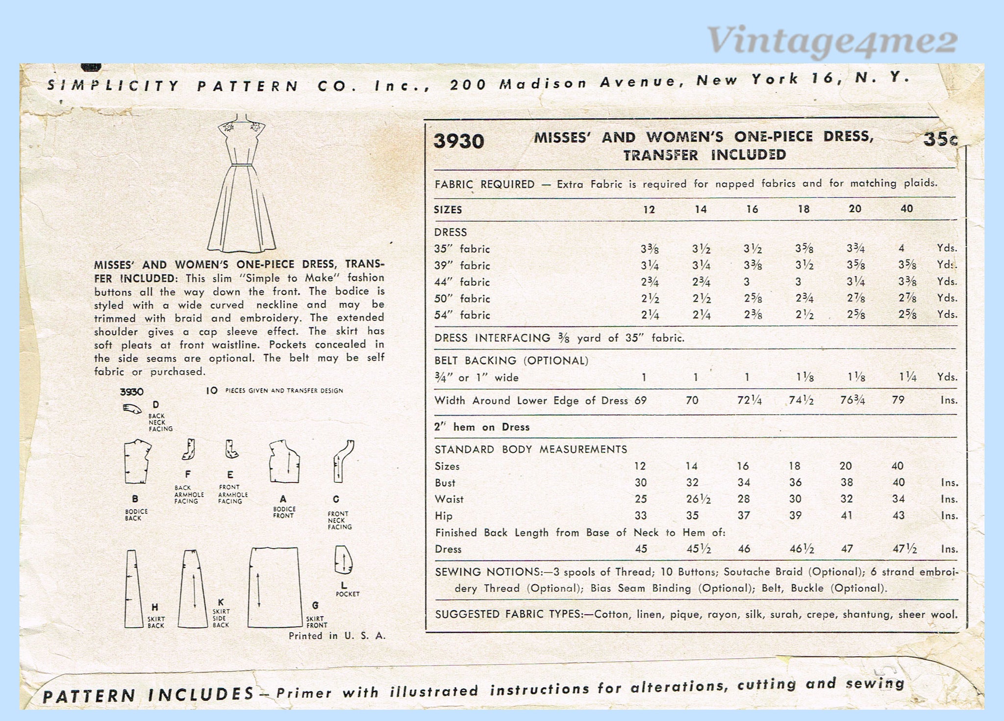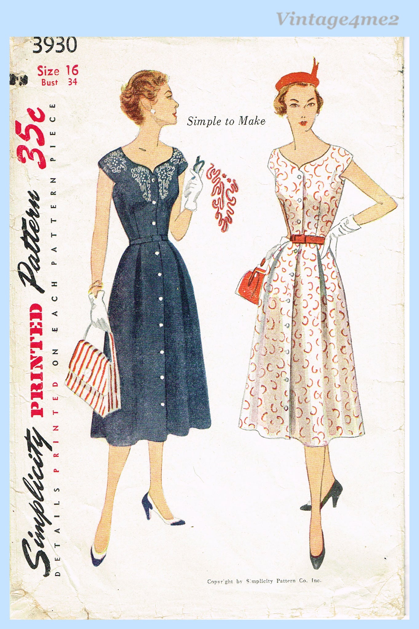 Simplicity 3930: 1950s Misses Embroidered Dress Sz 34 B Vintage Sewing Pattern