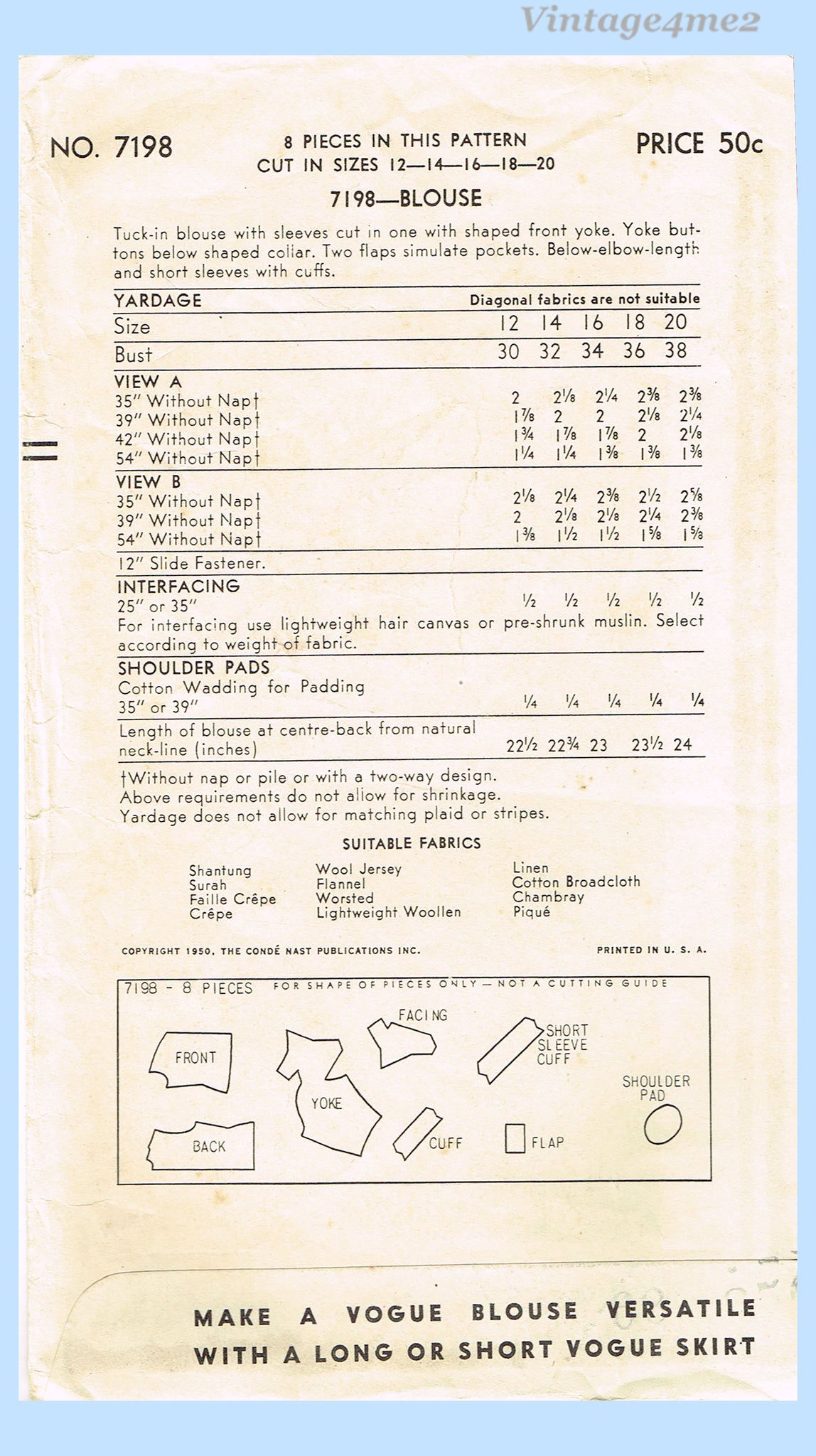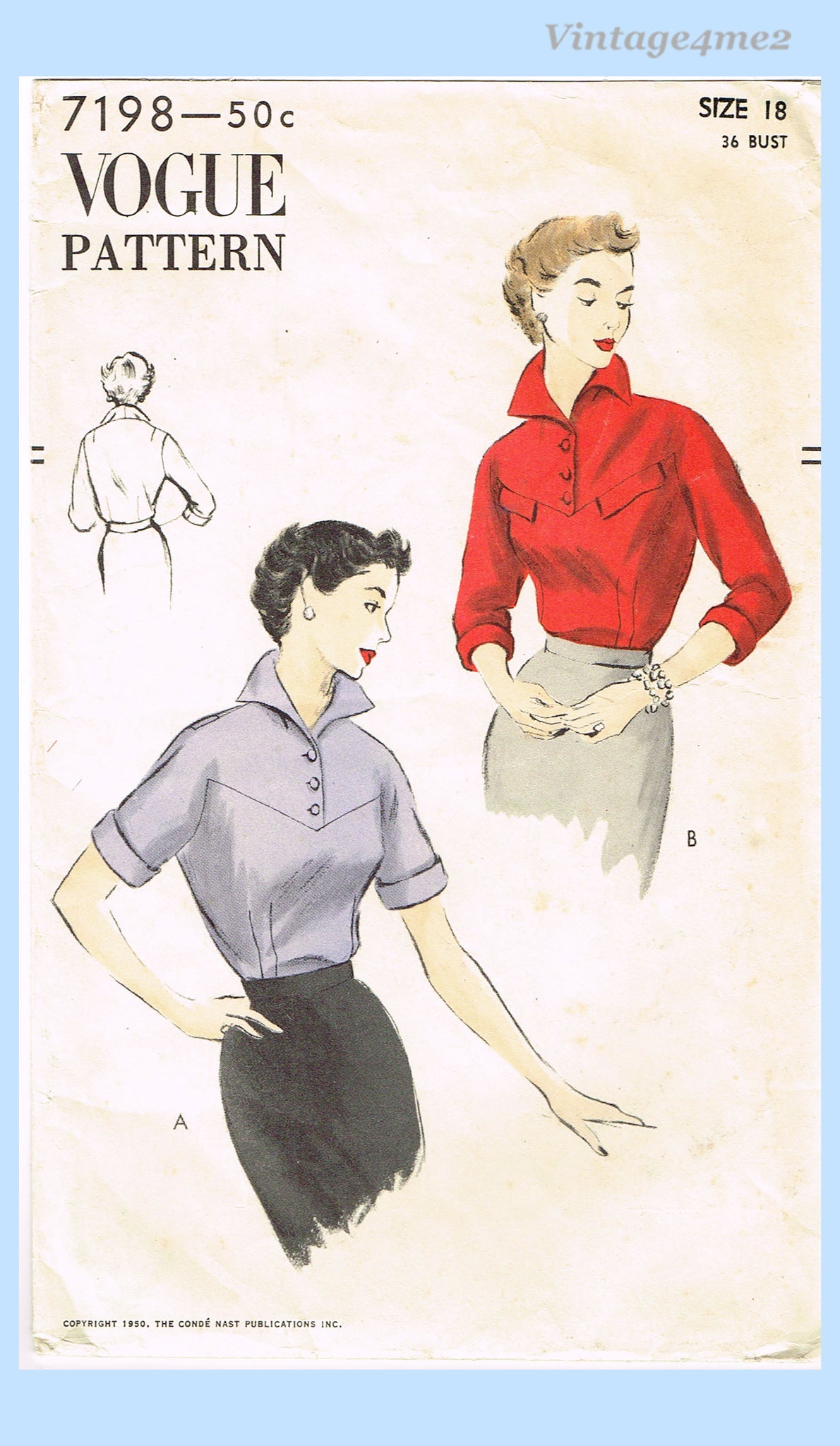 Vogue 7198: 1950s Stunning Misses Blouse Size 36 Bust Vintage Sewing Pattern