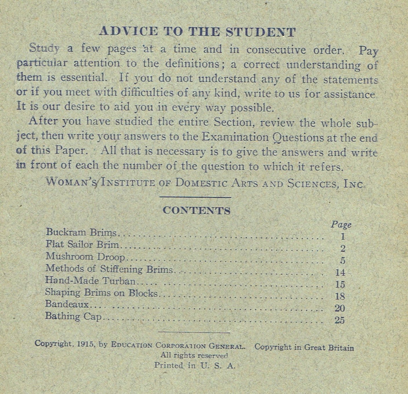 This book is one of a large series of correspondence school textbooks starting in 1916 and going into the late 1920s. These fantastic sewing books were published by the Woman's Institute of Domestic Arts & Sciences founded by Mary Brooks Picken. This book comes from a rare set of Millinery books that are extremely hard to find especially in this condition. Mary Brooks Picken was the most prolific sewing teacher and writer of all time. In addition to this series she also wrote the best how to sew guide book produced by Singer. All told she wrote 96 books on sewing. She also taught "Economics of Fashion" at Columbia University.