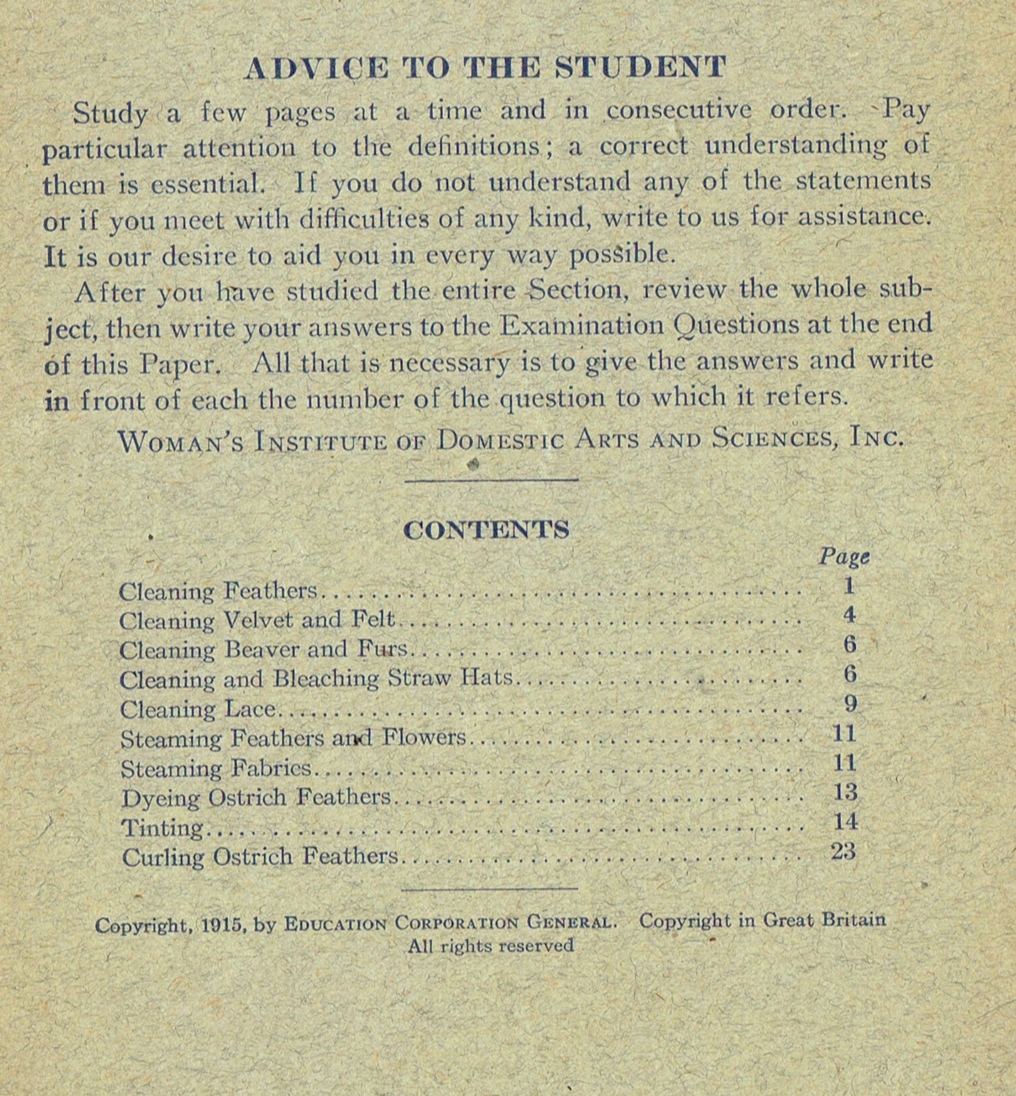This book is one of a large series of correspondence school textbooks starting in 1916 and going into the late 1920s. These fantastic sewing books were published by the Woman's Institute of Domestic Arts & Sciences founded by Mary Brooks Picken. This book comes from a rare set of Millinery books that are extremely hard to find especially in this condition. Mary Brooks Picken was the most prolific sewing teacher and writer of all time. In addition to this series she also wrote the best how to sew guide book produced by Singer. All told she wrote 96 books on sewing. She also taught "Economics of Fashion" at Columbia University.