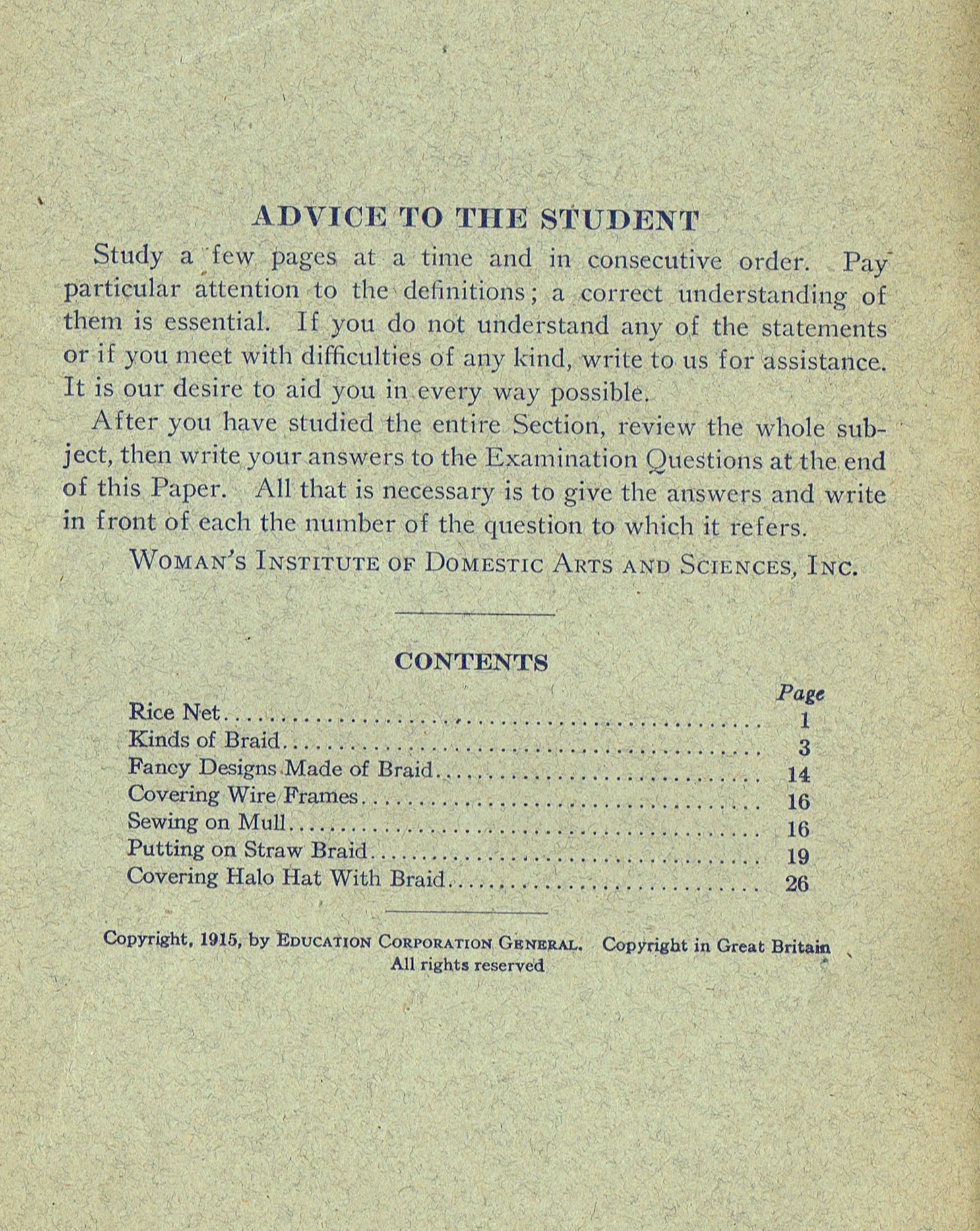 This book is one of a large series of correspondence school textbooks starting in 1916 and going into the late 1920s. These fantastic sewing books were published by the Woman's Institute of Domestic Arts & Sciences founded by Mary Brooks Picken. This book comes from a rare set of Millinery books that are extremely hard to find especially in this condition. Mary Brooks Picken was the most prolific sewing teacher and writer of all time. In addition to this series she also wrote the best how to sew guide book produced by Singer. All told she wrote 96 books on sewing. She also taught "Economics of Fashion" at Columbia University.