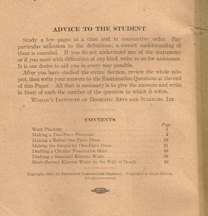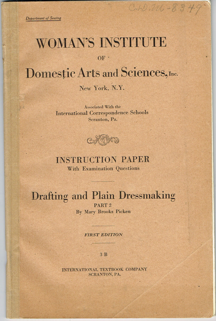 This book is one of a large series of correspondence school textbooks starting in 1915 and going into the late 1920s. These fantastic sewing books were published by the Woman's Institute of Domestic Arts & Sciences founded by Mary Brooks Picken. Mary Brooks Picken was the most prolific sewing teacher and writer of all time. In addition to this series she also wrote the best how to sew guide book produced by Singer. All told she wrote 96 books on sewing. She also taught "Economics of Fashion" at Columbia University.