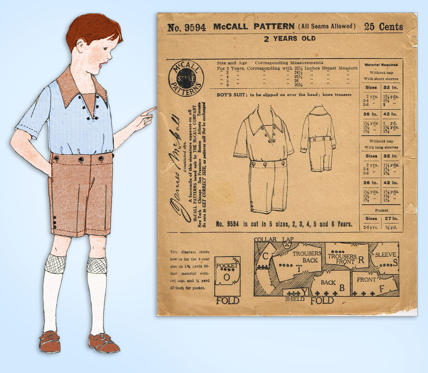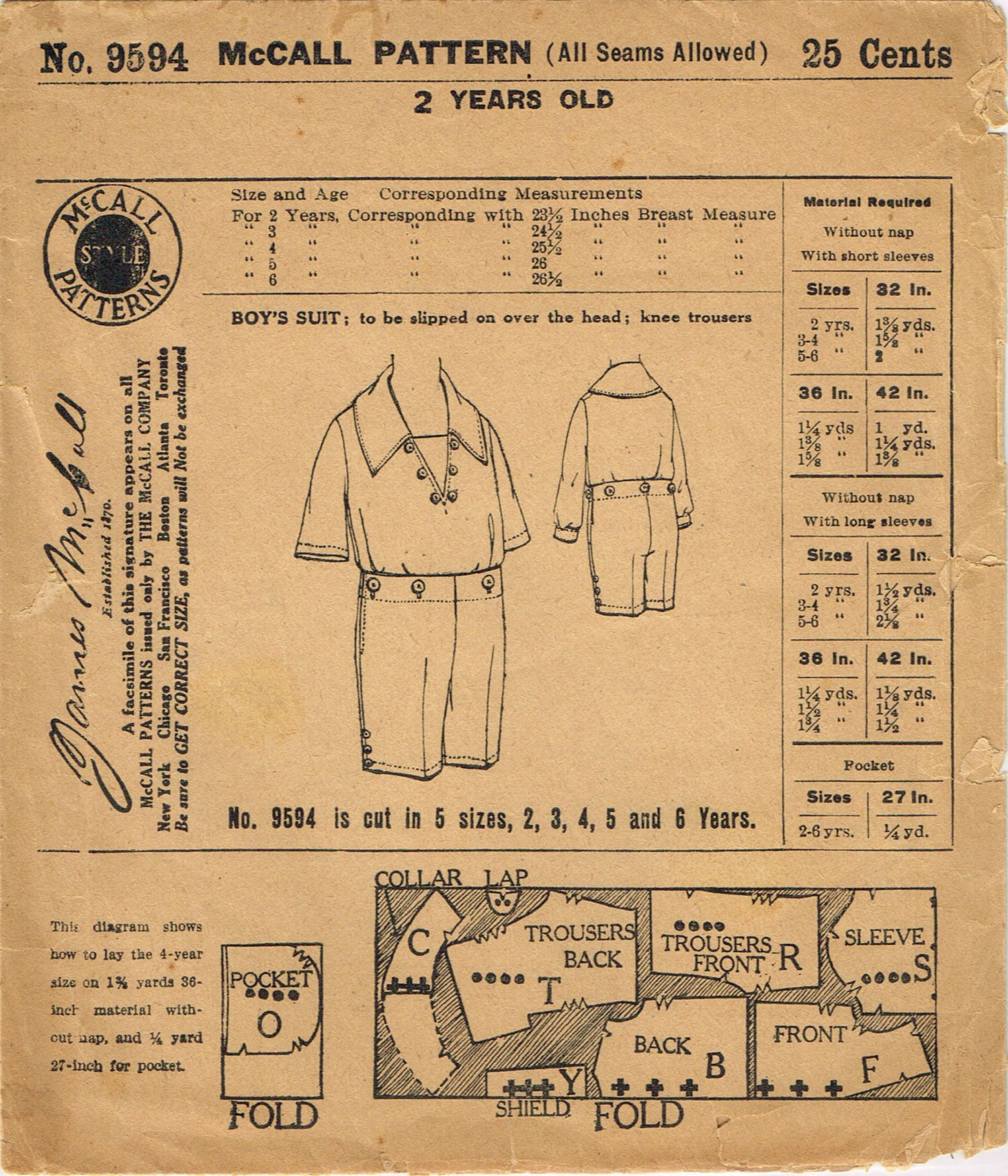 1920s Antique McCall Sewing Pattern 9594 Toddler Boys 2 Pc Trouser Suit Size 2