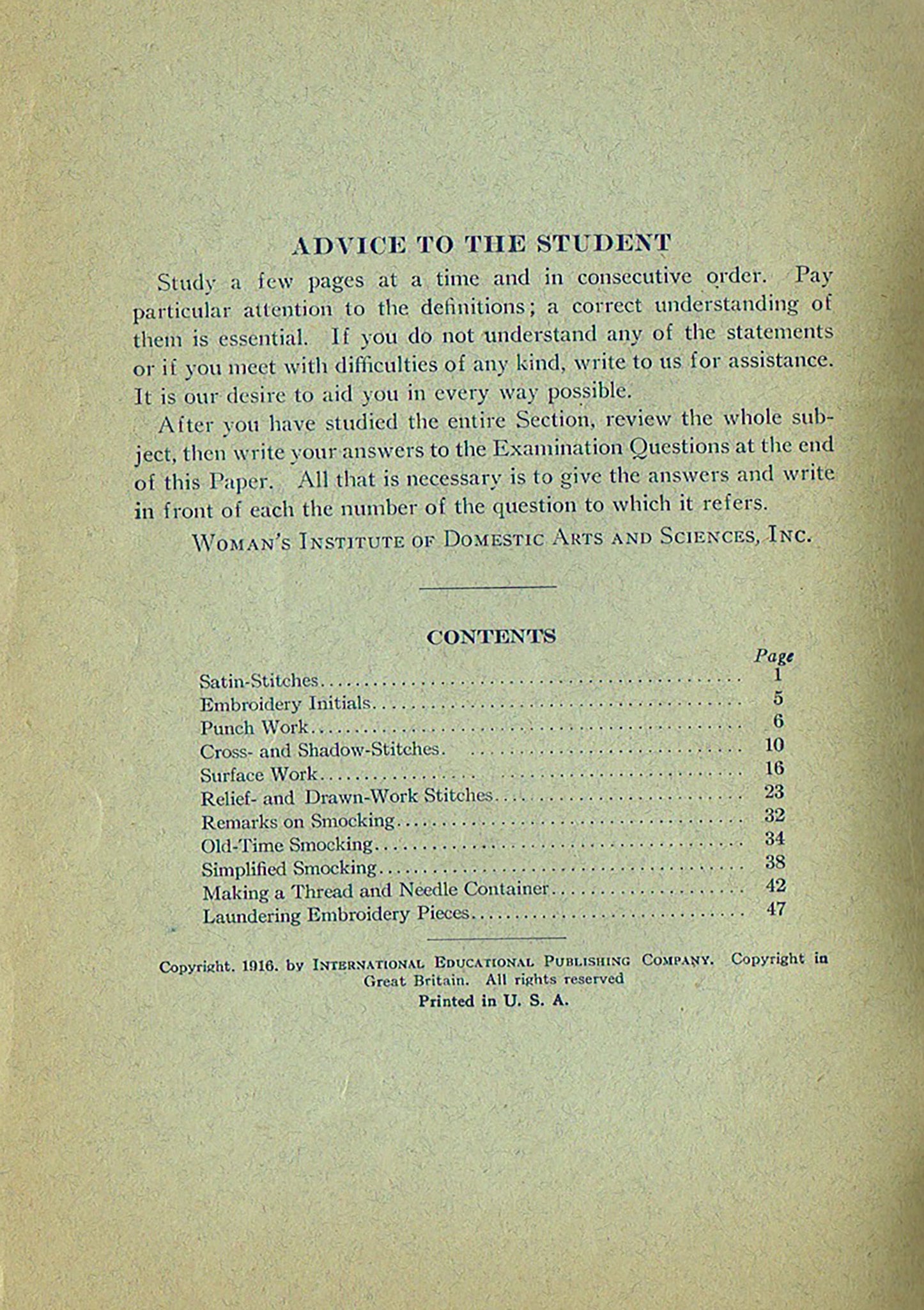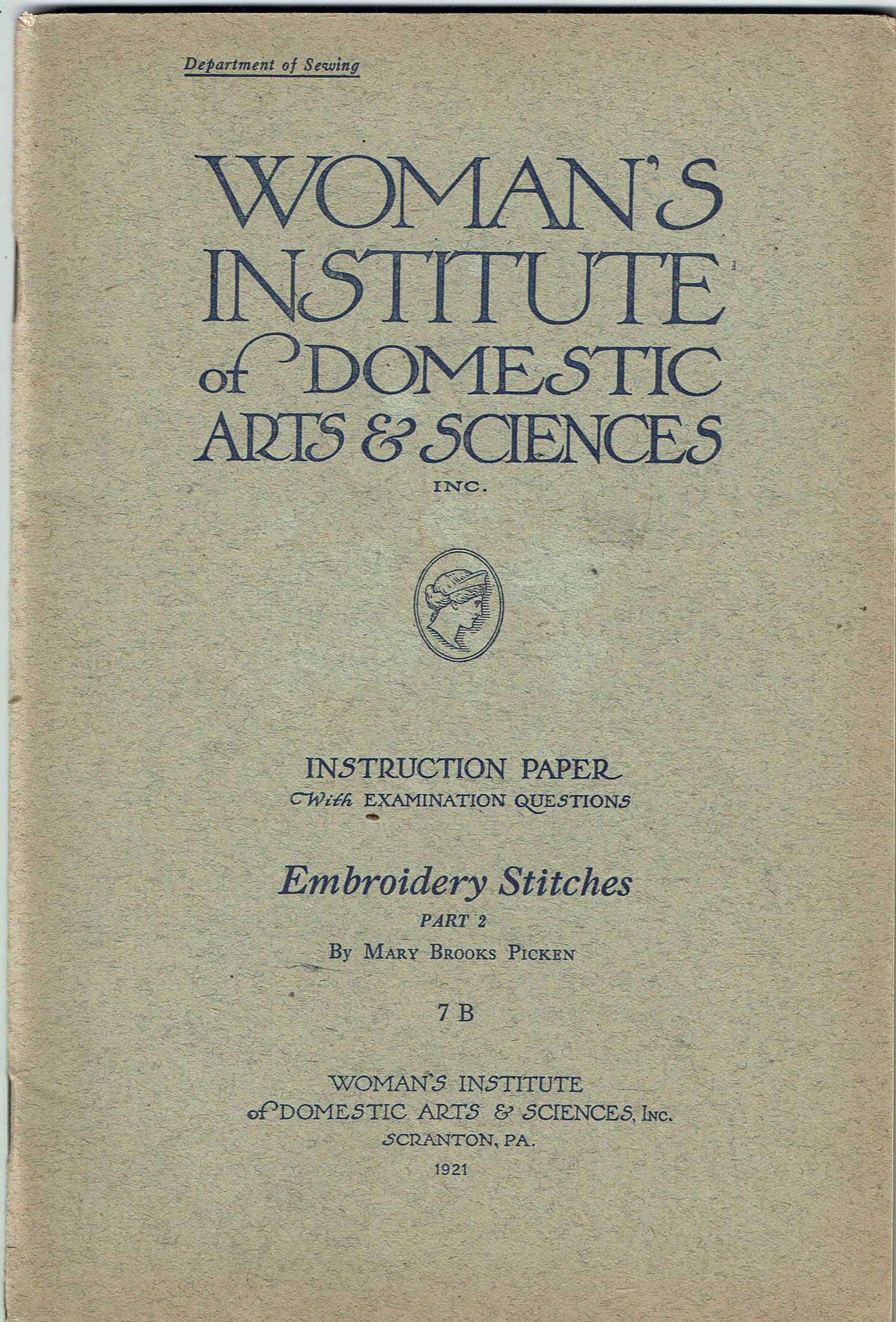 This book is one of a large series of correspondence school textbooks starting in 1916 and going into the late 1920s. These fantastic sewing books were published by the Woman's Institute of Domestic Arts & Sciences founded by Mary Brooks Picken. Mary Brooks Picken was the most prolific sewing teacher and writer of all time. In addition to this series she also wrote the best how to sew guide book produced by Singer. All told she wrote 96 books on sewing. She also taught "Economics of Fashion" at Columbia University.