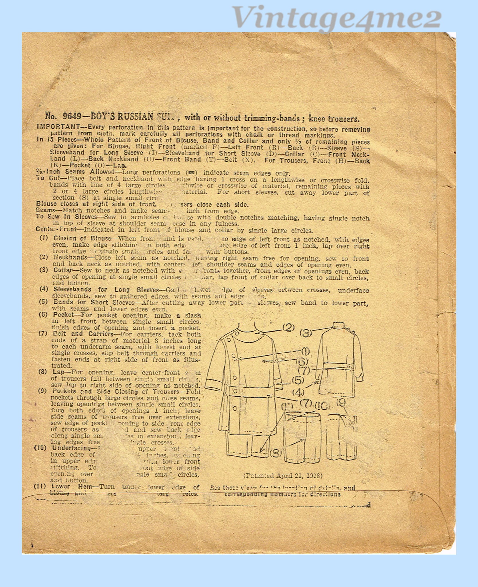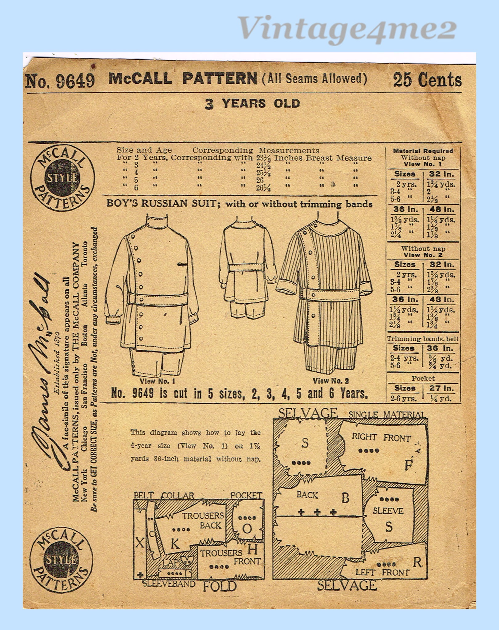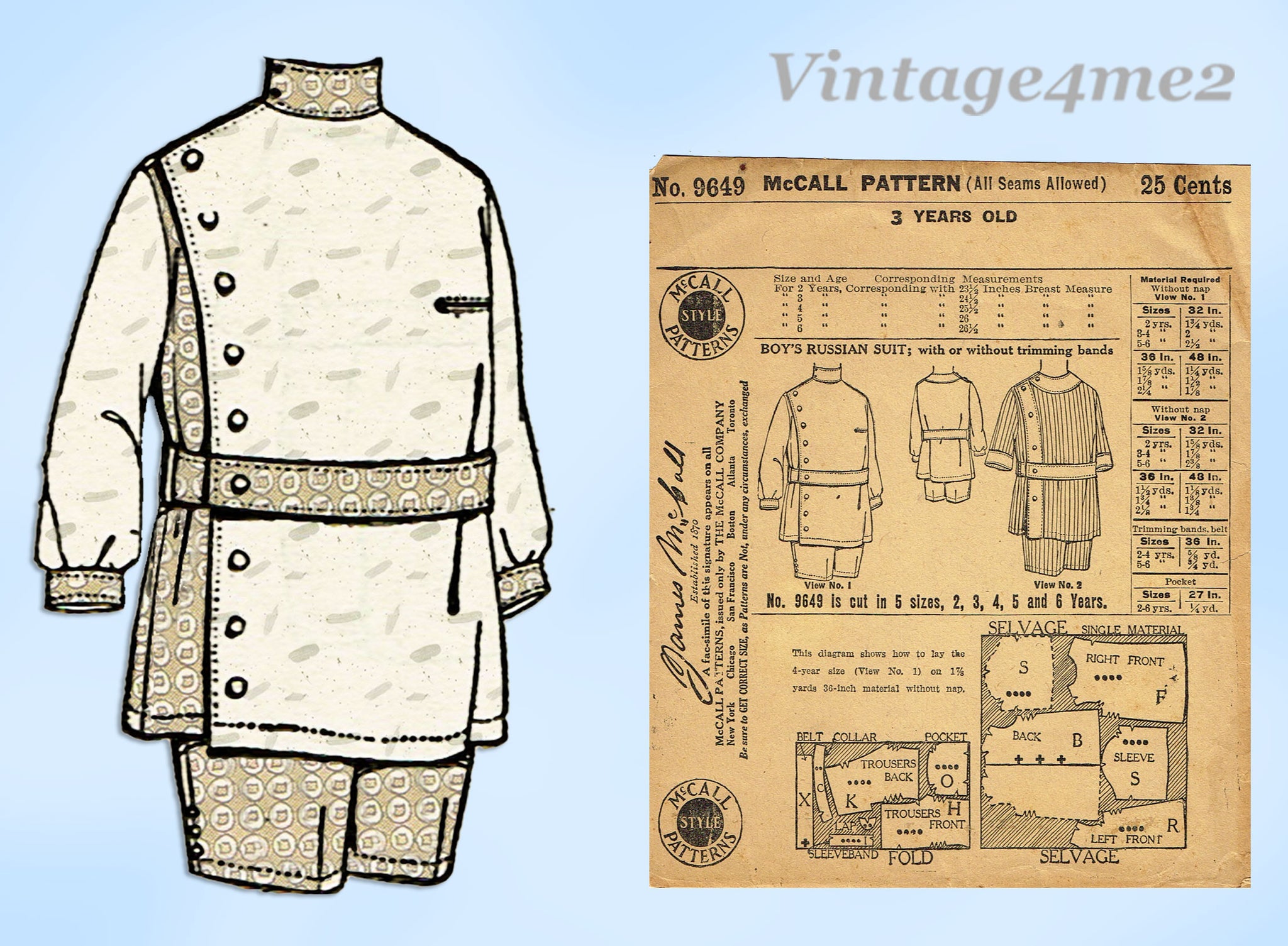 1920s Vintage McCall Pattern 9649 Sweet Toddler Boys Russian Suit Size 3