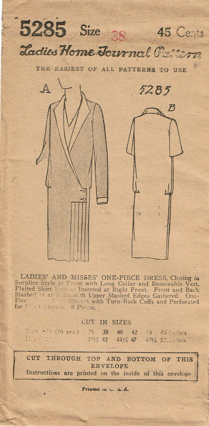 1920s VTG Ladies Home Journal Sewing Pattern 5285 Uncut Misses Flapper Dress 38B