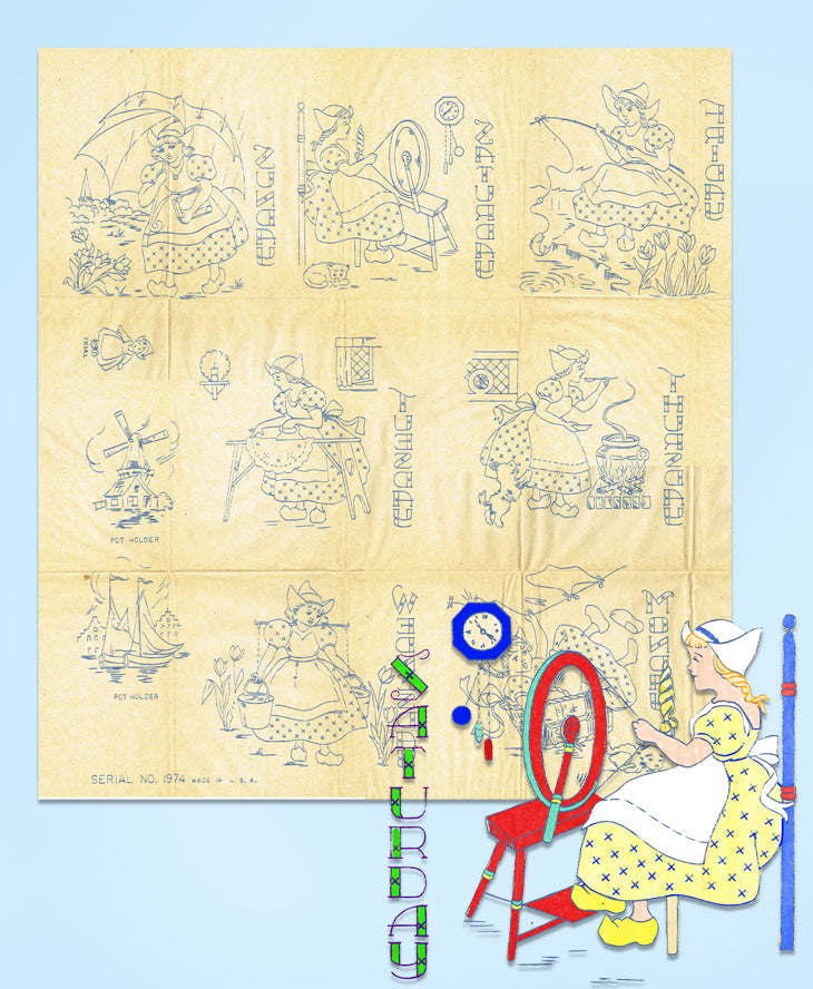 This is a very charming Day of the Week transfer from Betty Burton in the 1930s or 1940s. This transfer is rare and I am really lucky to have found some extremely cute and rare transfers (be sure to check my store). This is a "chore of the day" design with a dutch gal working her way through the week. The condition is uncut and unused and very nice.