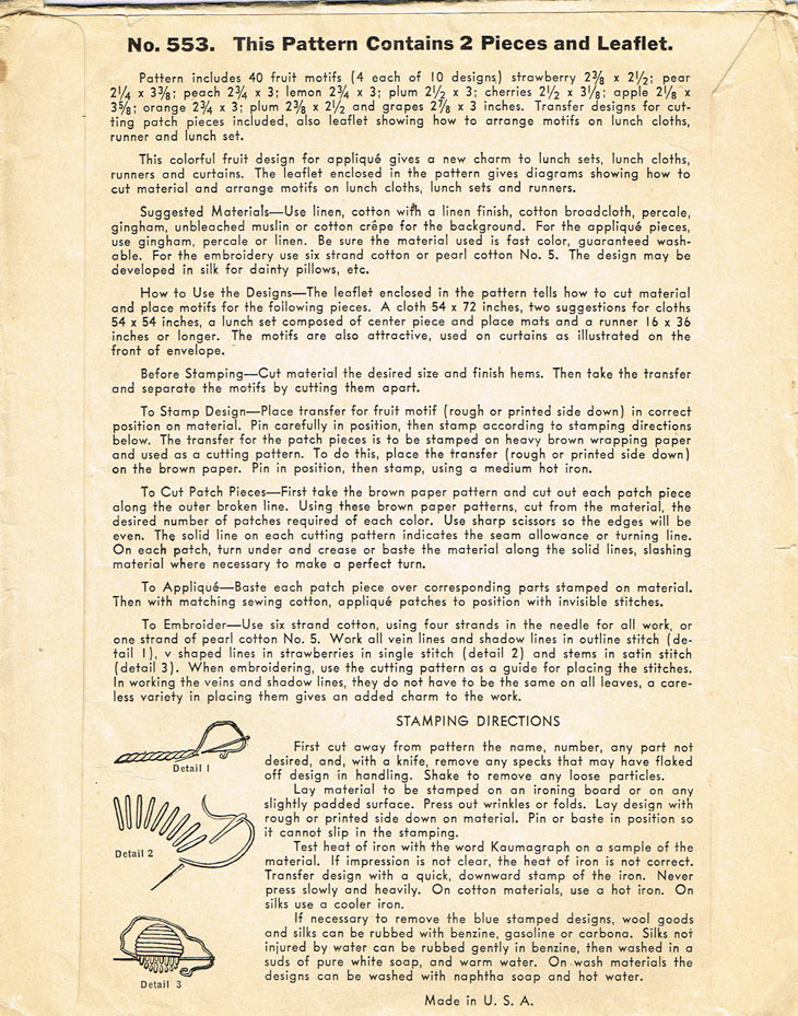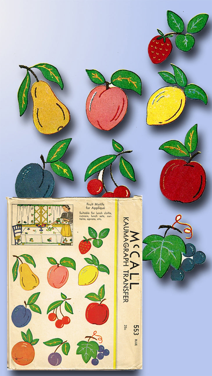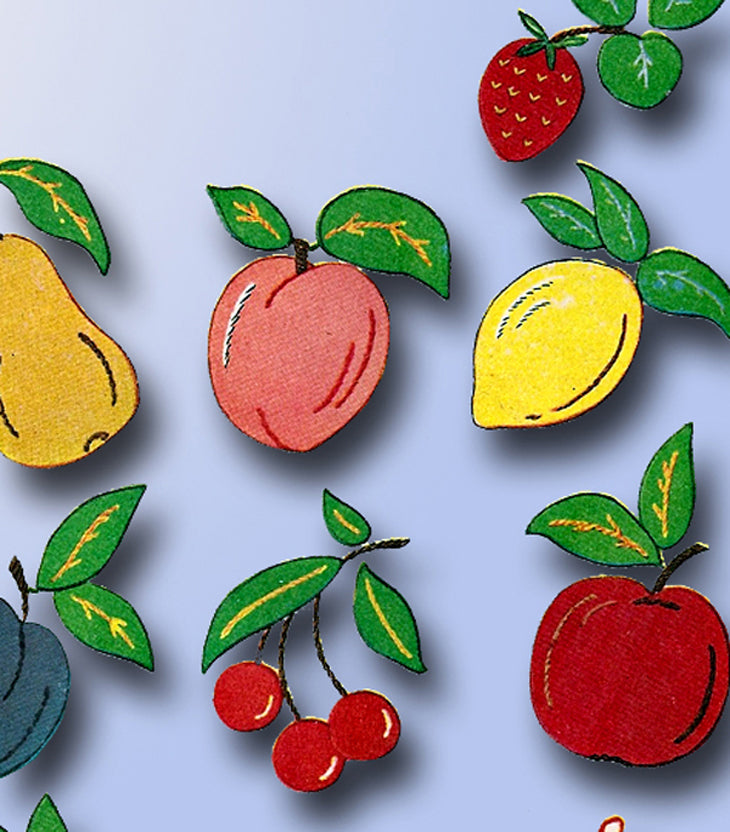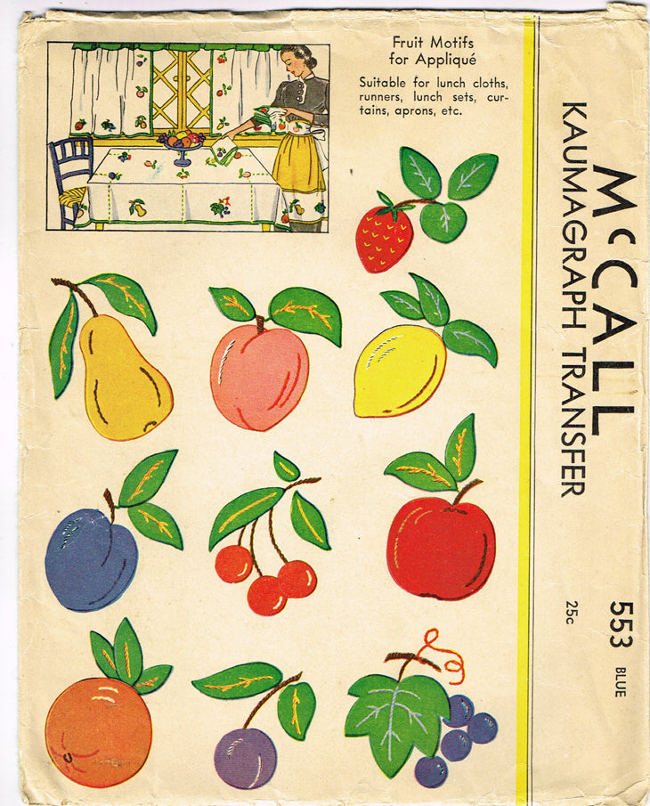 This is a lovely embroidery transfer from McCall in 1938.  This transfer has classic applique fruit motifs that are perfect for vintage kitchen decor.  They are done in applique and are great for tea towels, curtains, lunch cloths and more.