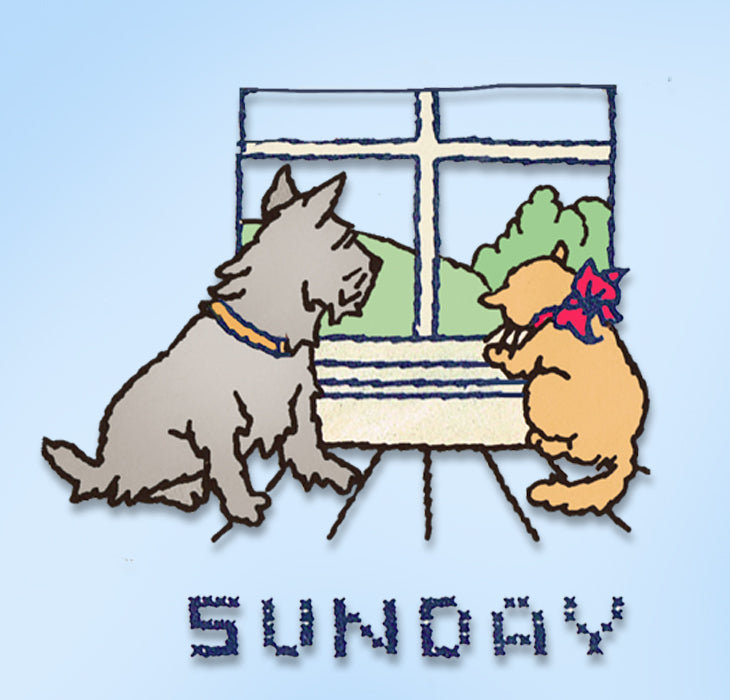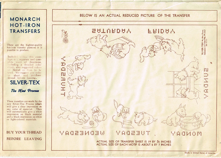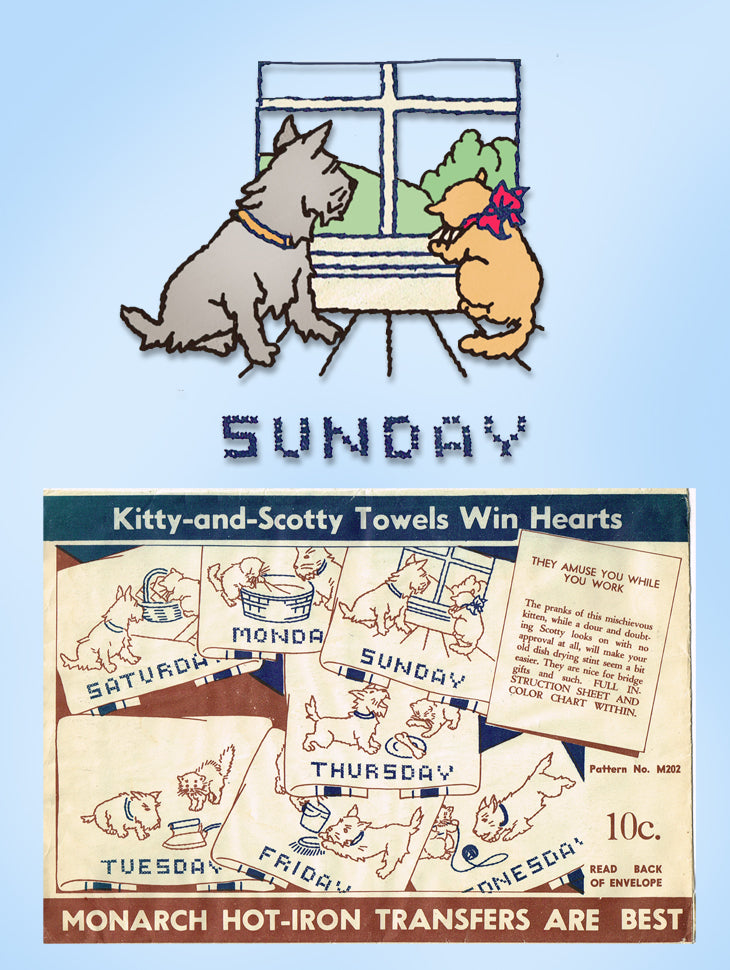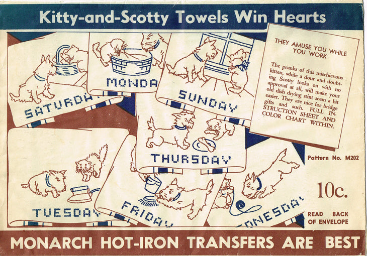 This is a lovely embroidery transfer from Monarch in the 1930s. This transfer has charming Chore of the Day motifs with a cute Scottie Dog and Kitten. It makes a set of seven day by day designs.