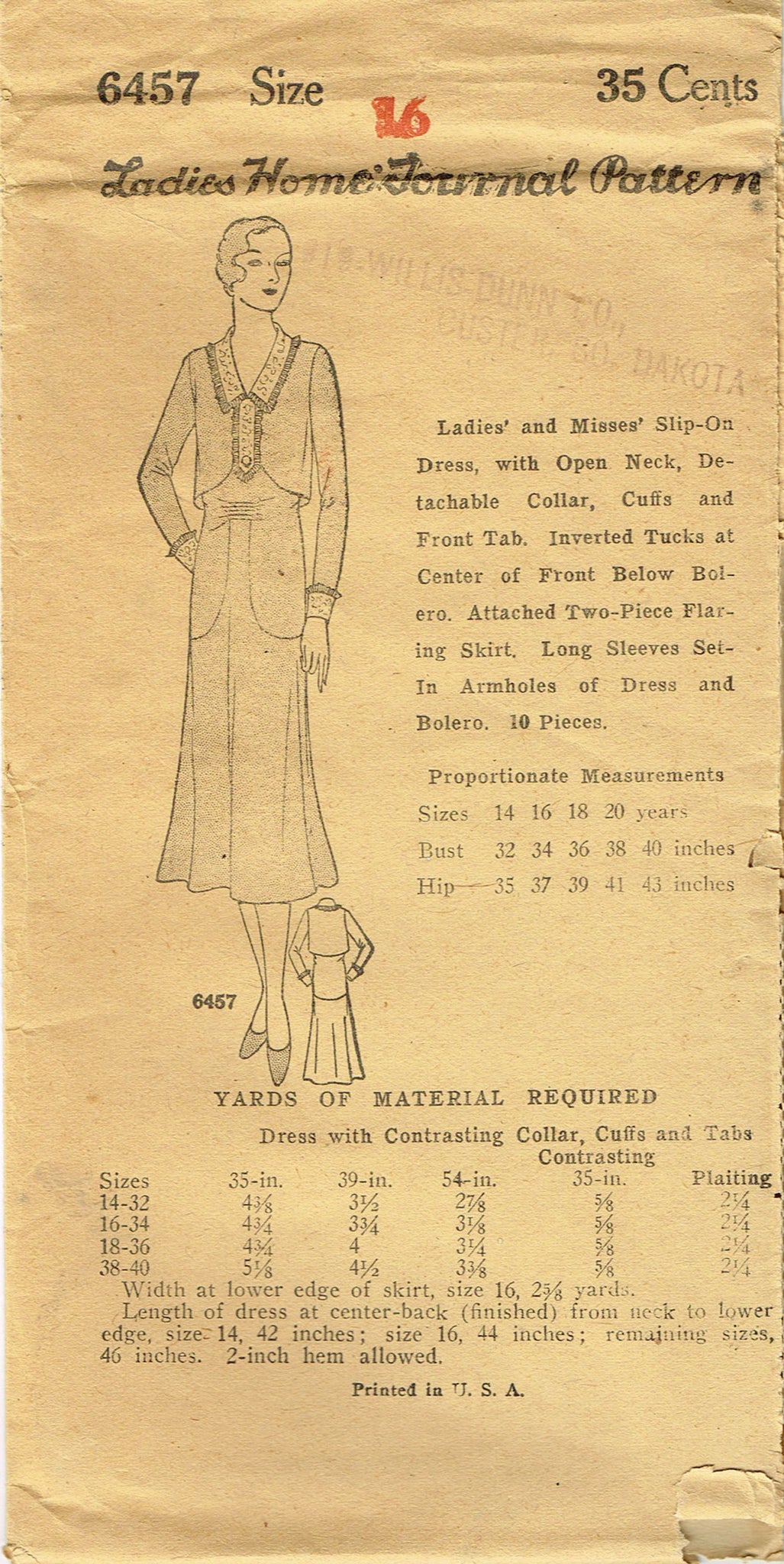 1930s VTG Ladies Home Journal Sewing Pattern 6457 Uncut Misses Street Dress 34 B