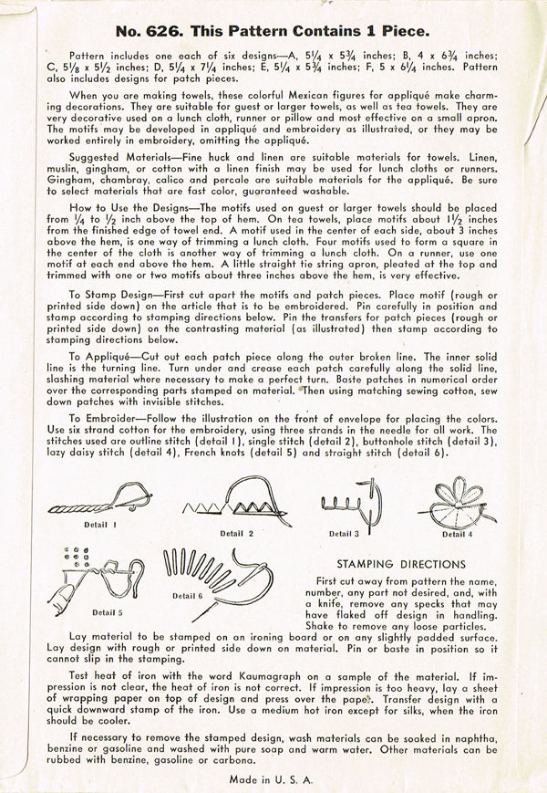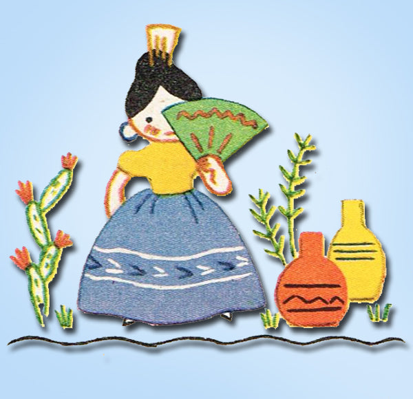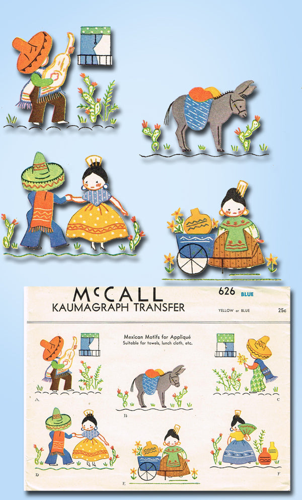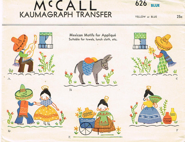 This is an extremely rare embroidery transfer from McCall in 1938.  These cute south of the border designs use applique for a charming affect.