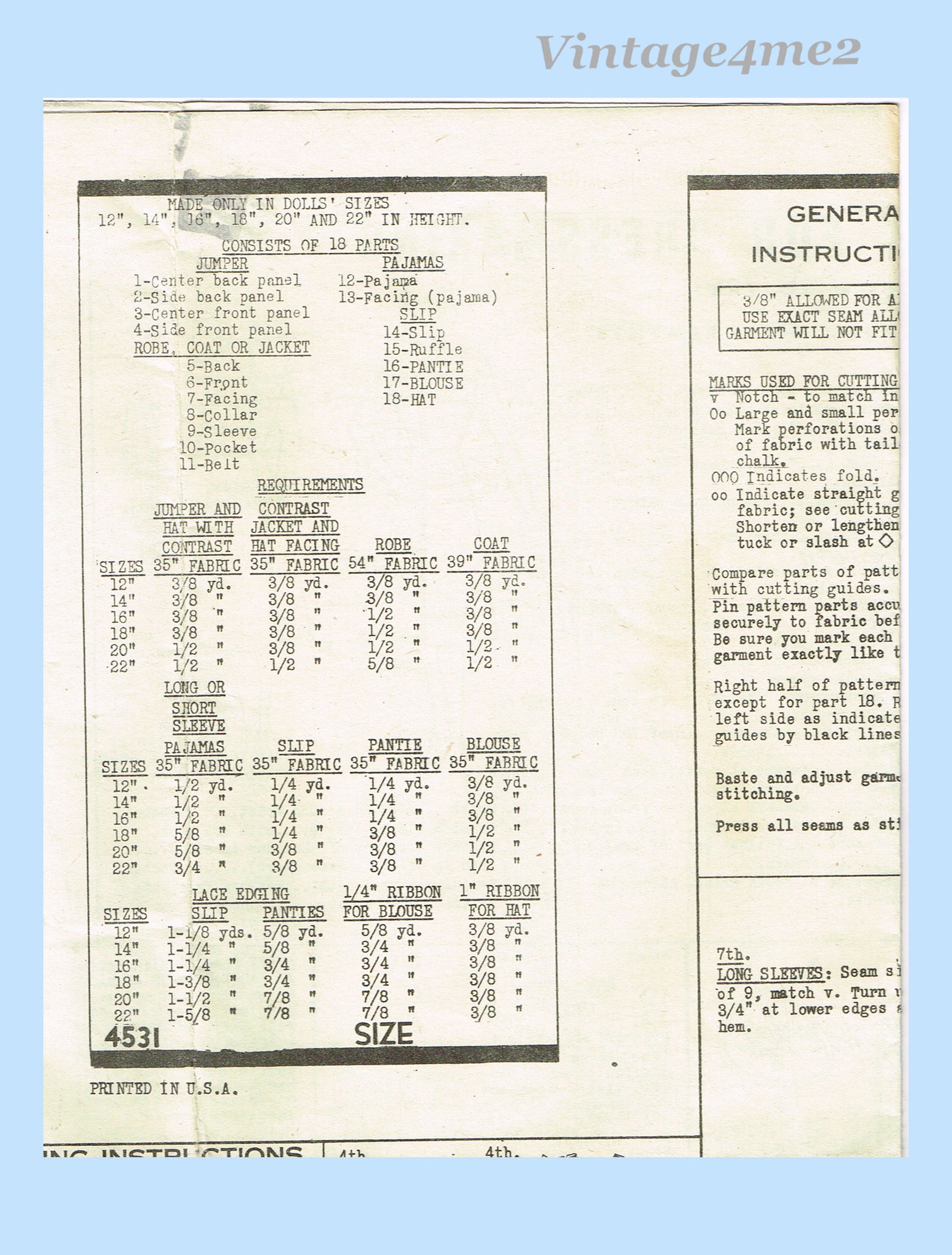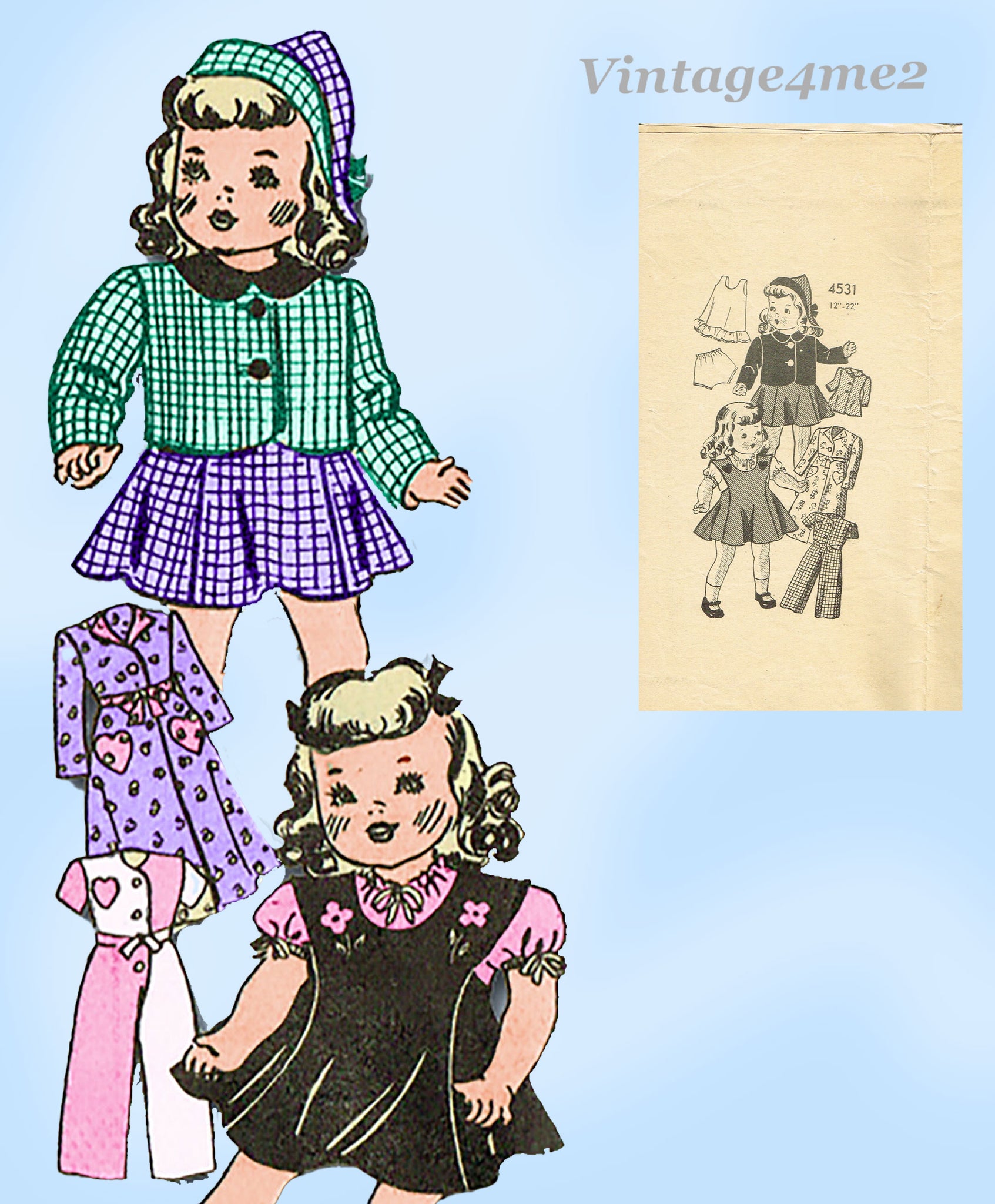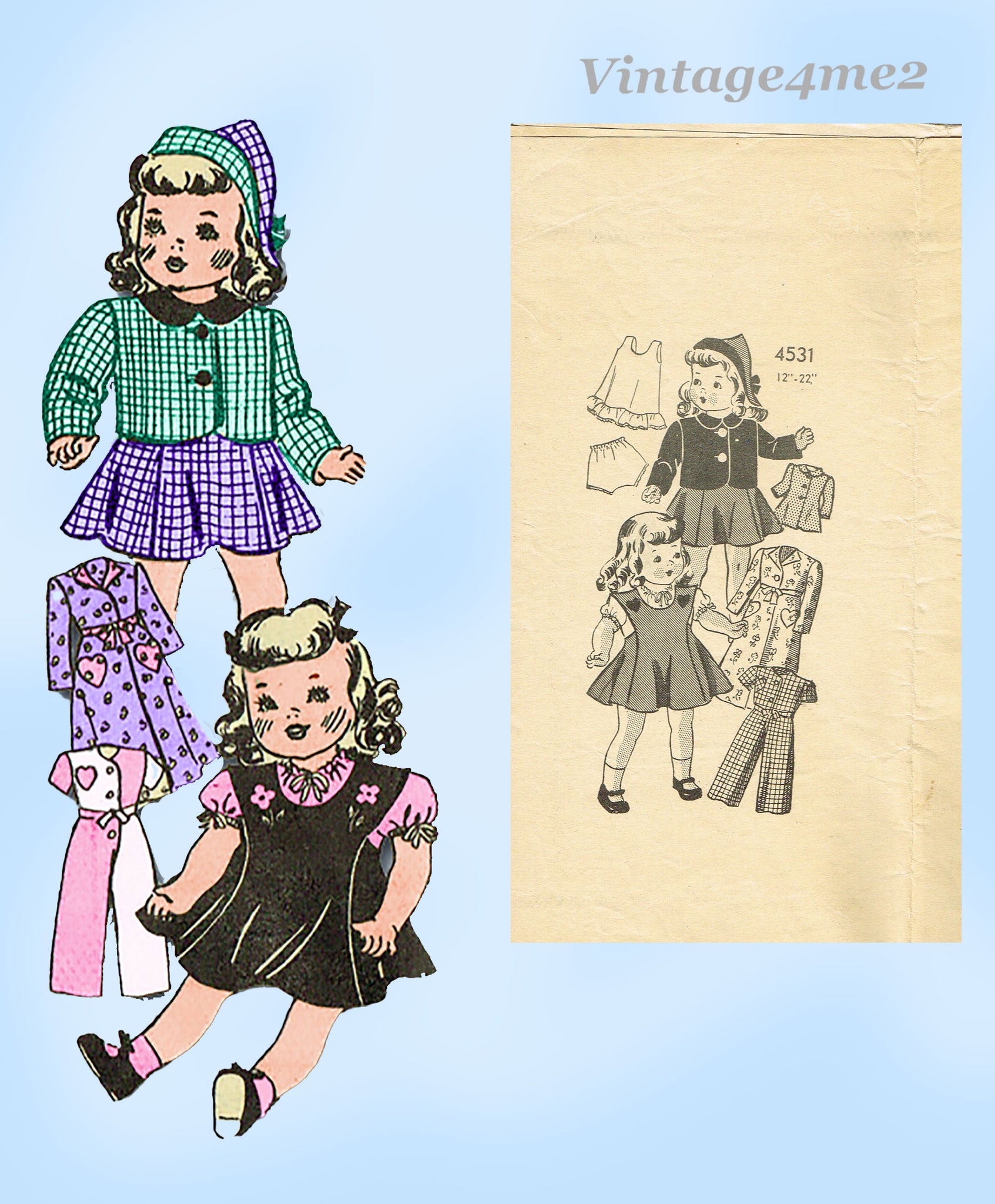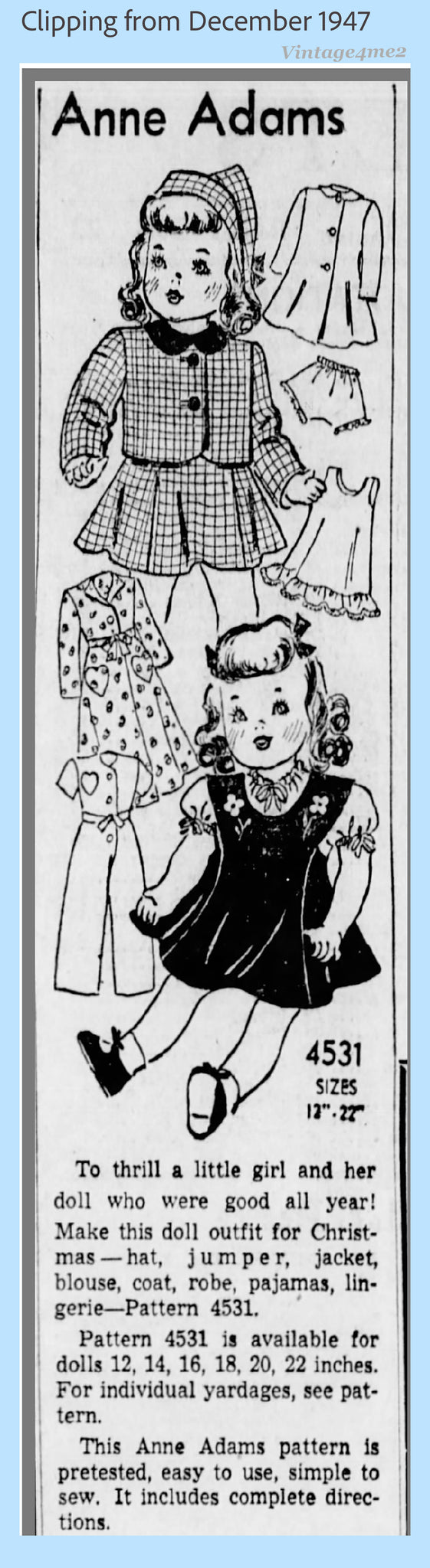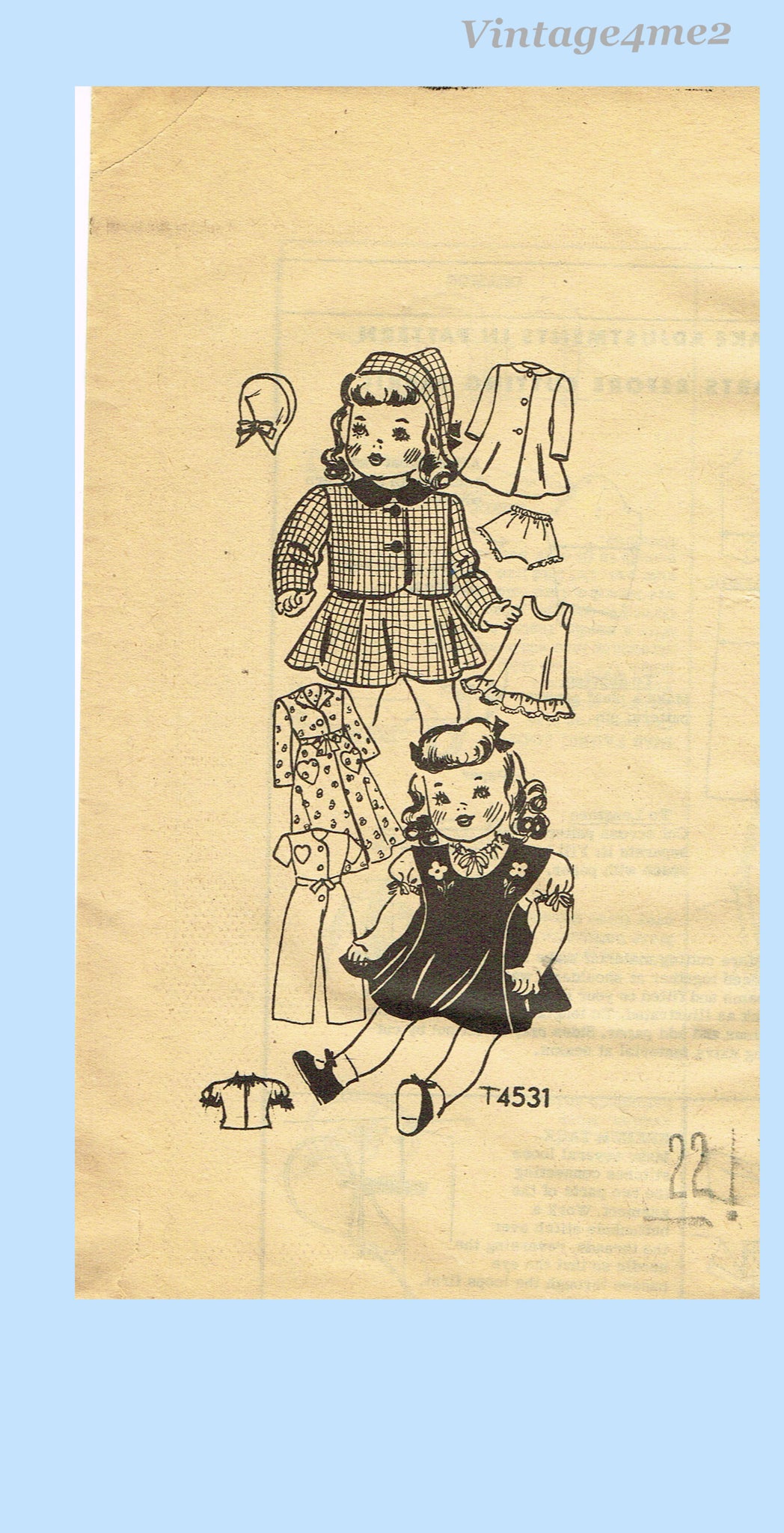 1940s Original Vintage Anne Adams Sewing Pattern 4531 Rare 22in Doll Clothes Set