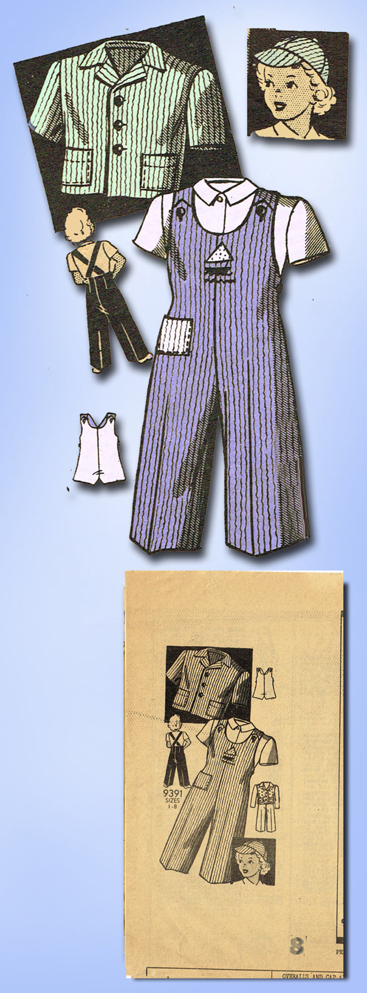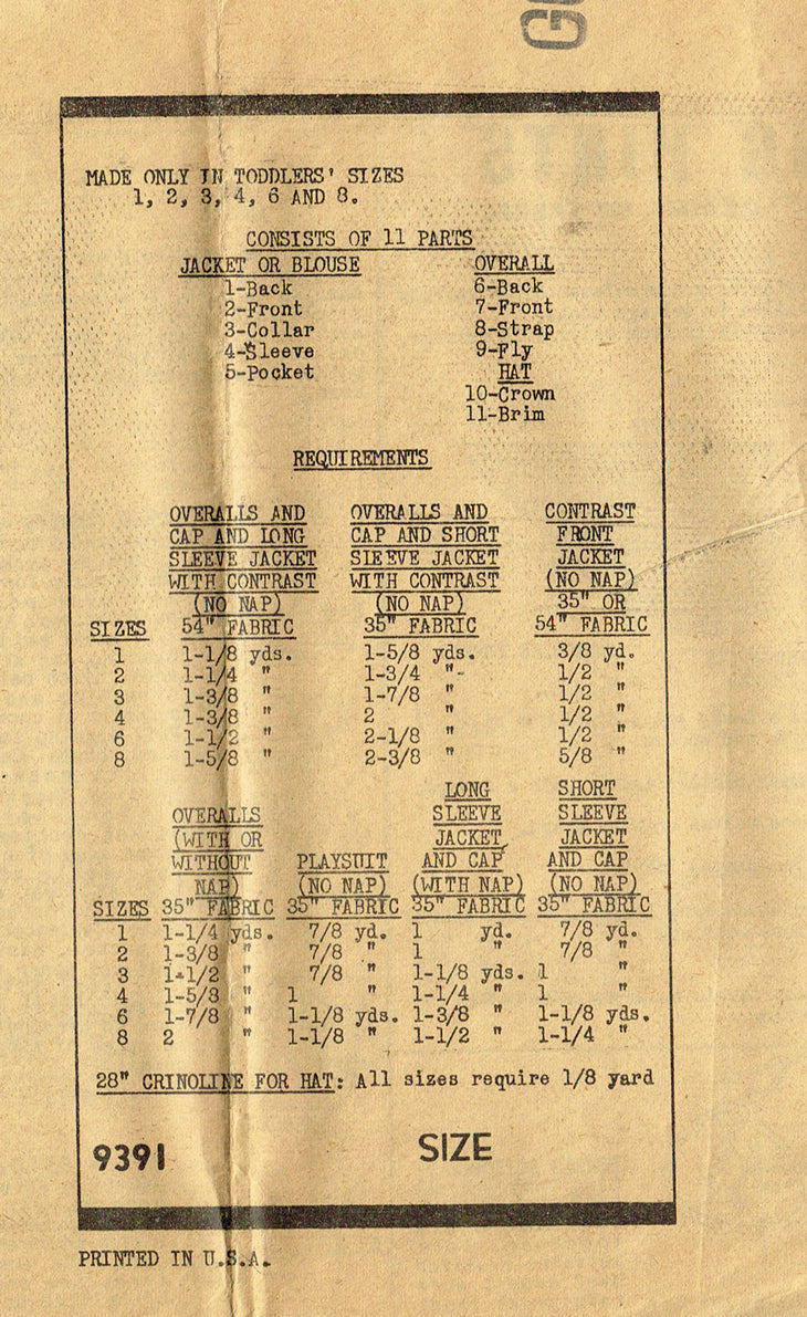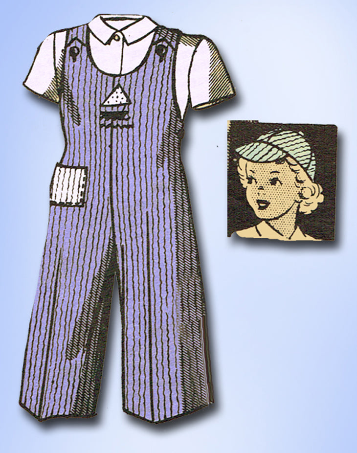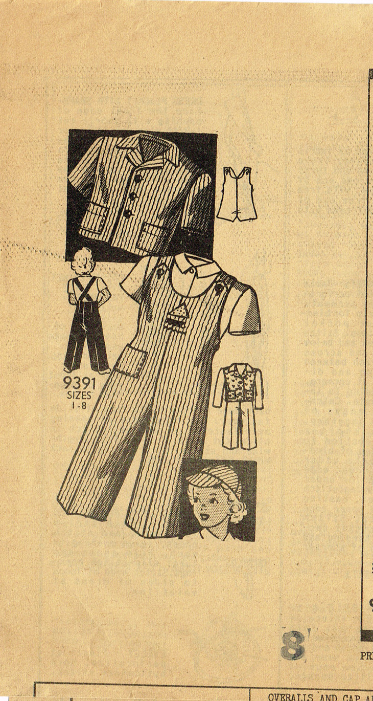 1940s Original Vintage Marian Martin Pattern 9391 Girls Overalls Jacket Hat Sz 8