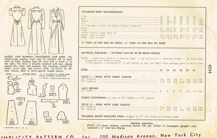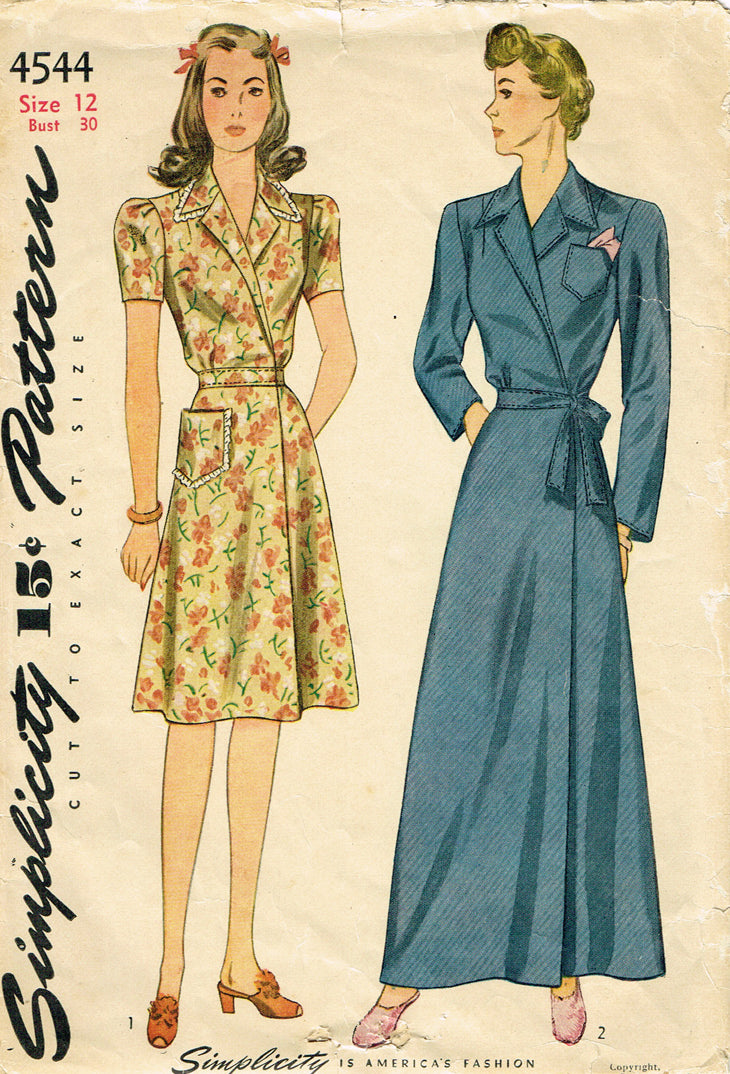 1940s Original Vintage Simplicity Pattern 4544 WWII Misses Housecoat Sz 30 Bust