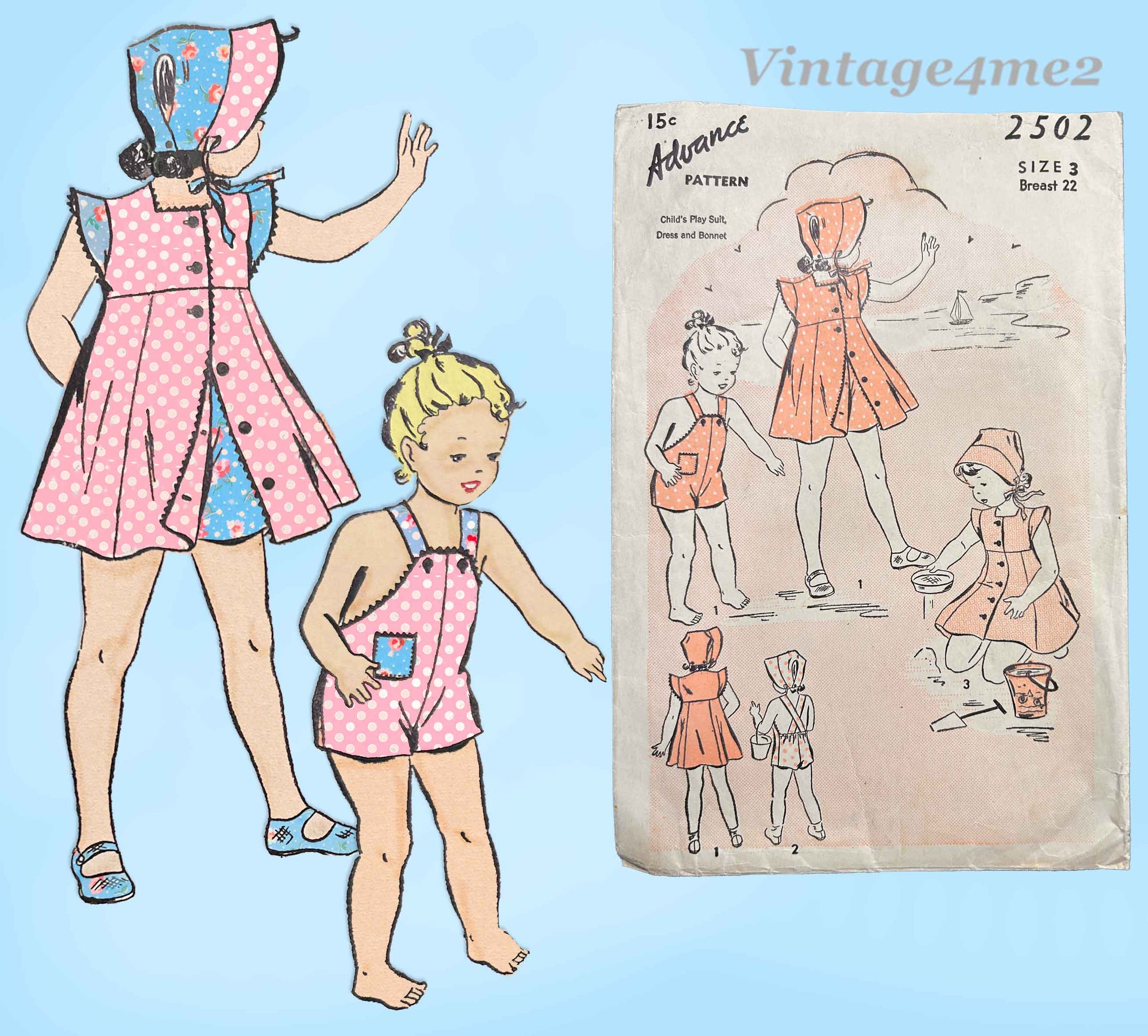 1940s Vintage Advance Sewing Pattern 2502 Cute Toddler Girls WWII Sunsuit Size 3