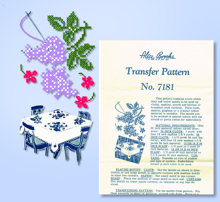 This is a wonderful  transfer from Alice Brooks in the 1940s.  It has Lilacs that are perfect for trimming a table cloth for a breakfast nook or other casual settings.  This transfer is uncut and unused and in nice condition.