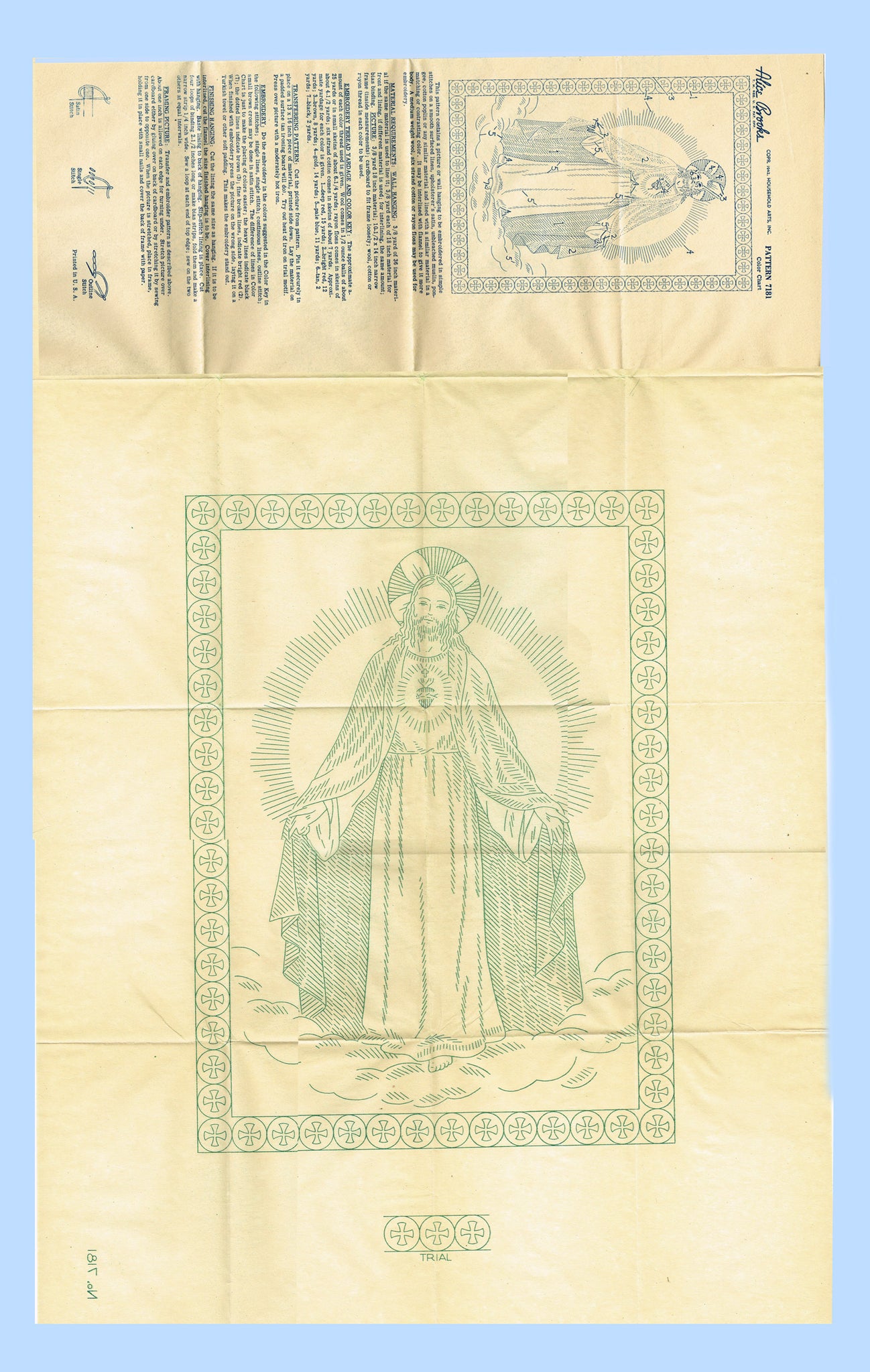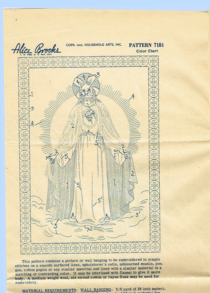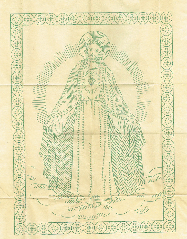 This is a wonderful transfer from Alice Brooks embroidery transfer from the 1940s. This transfer has one big beautiful picture of the "Sacred Heart of Jesus". This transfer is uncut and unused. It is nice condition.