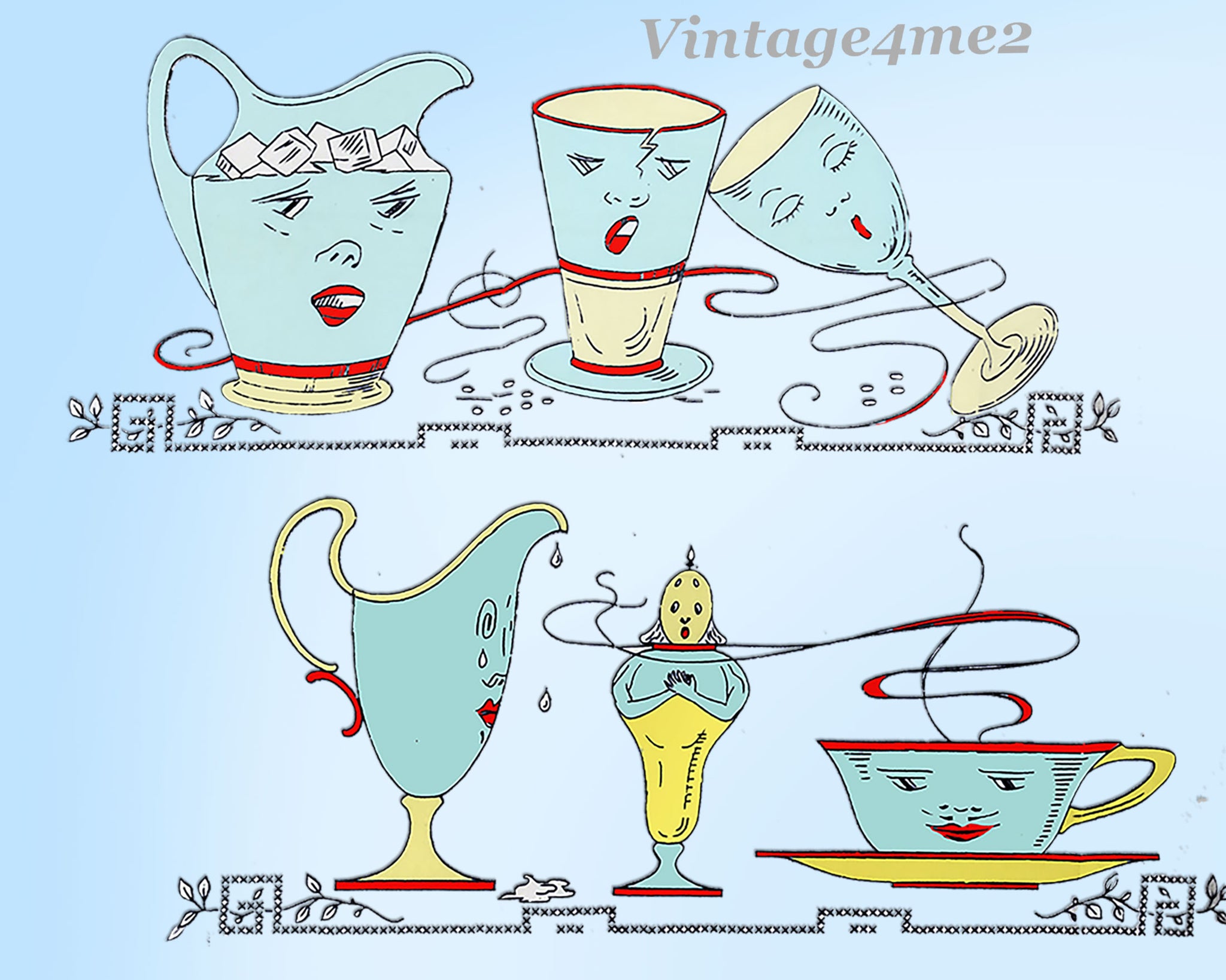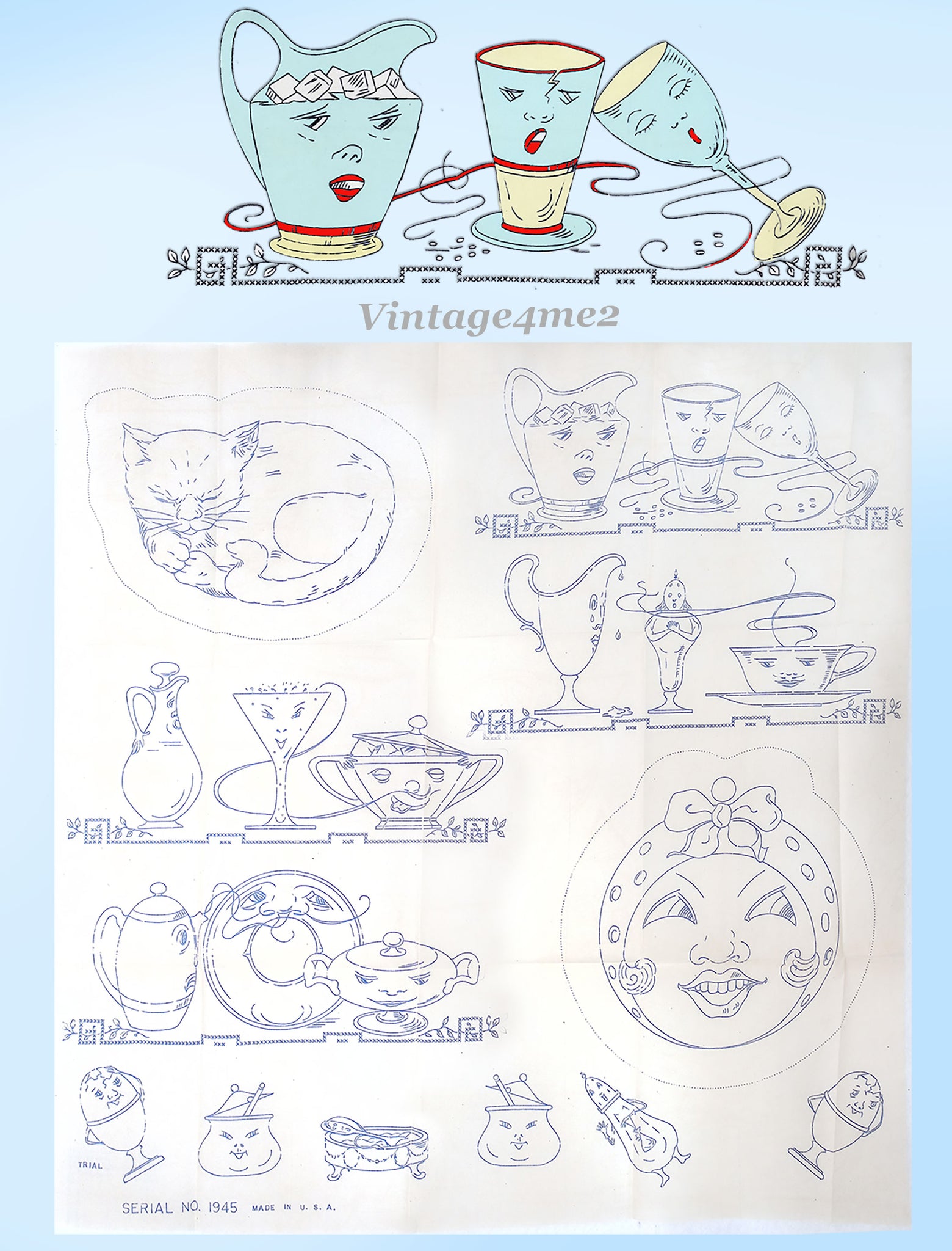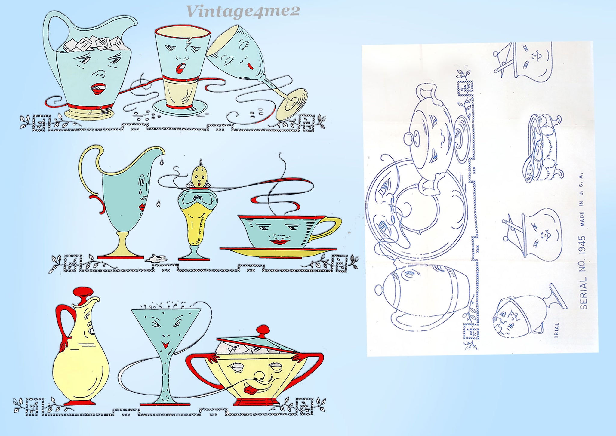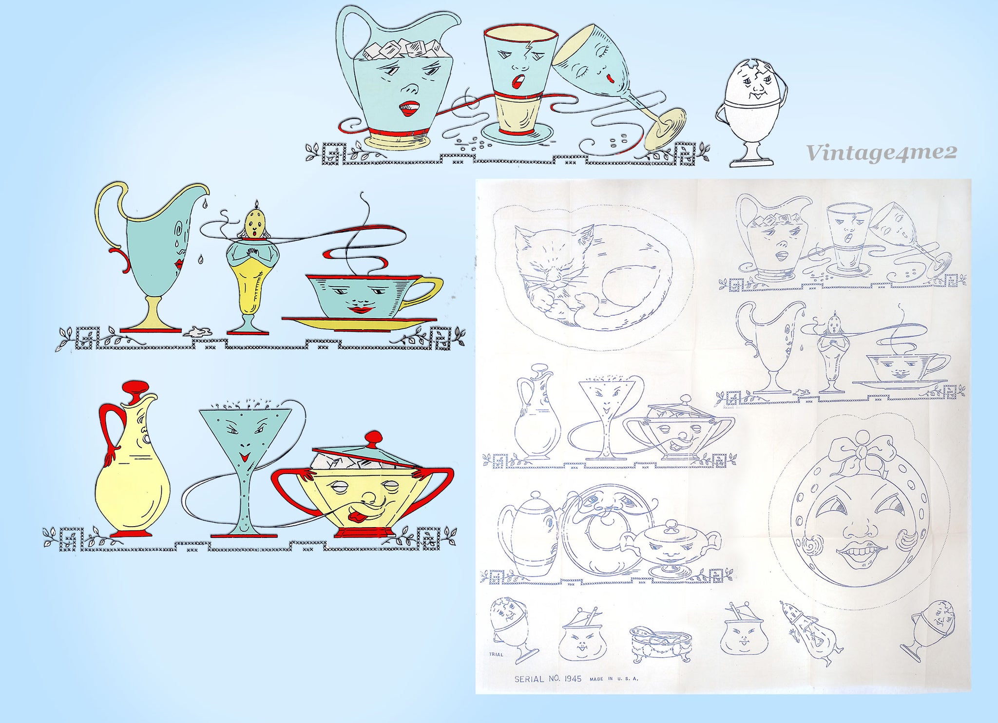 This is an amazing transfer from Betty Burton in the later 1930a or early 1940s featuring anthropomorphic dishes, cocktail glasses and other kitchen helpers. Finding this uncut transfer is a real treat. I love the style of these astonishing fellows and gals.