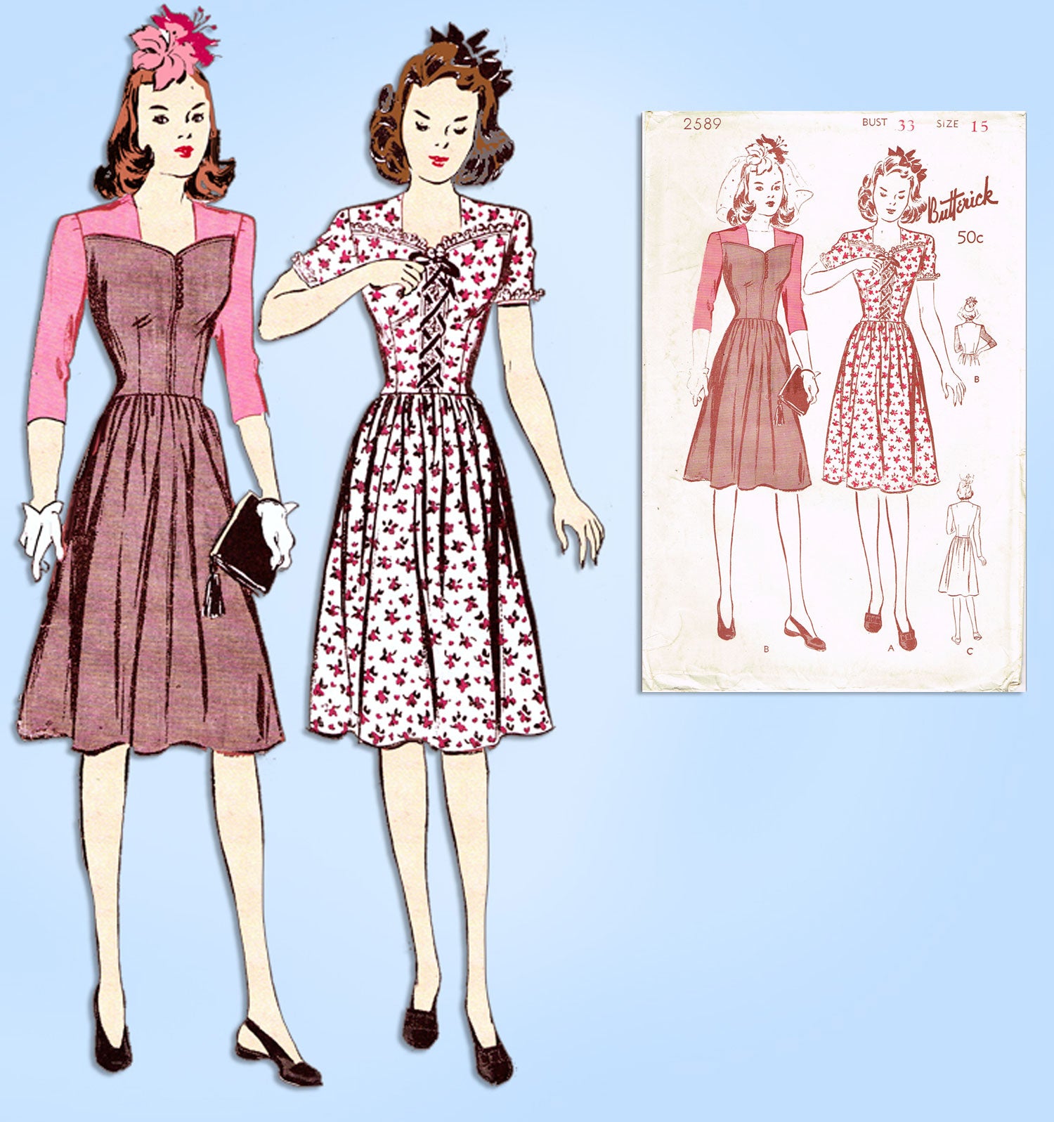 1940s Vintage Butterick Sewing Pattern 2589 Uncut WWII Dress w Laced Bodice 33B