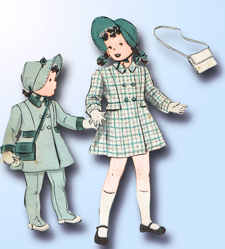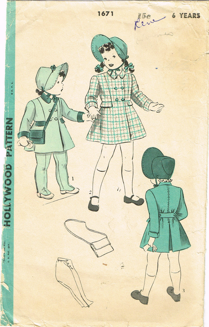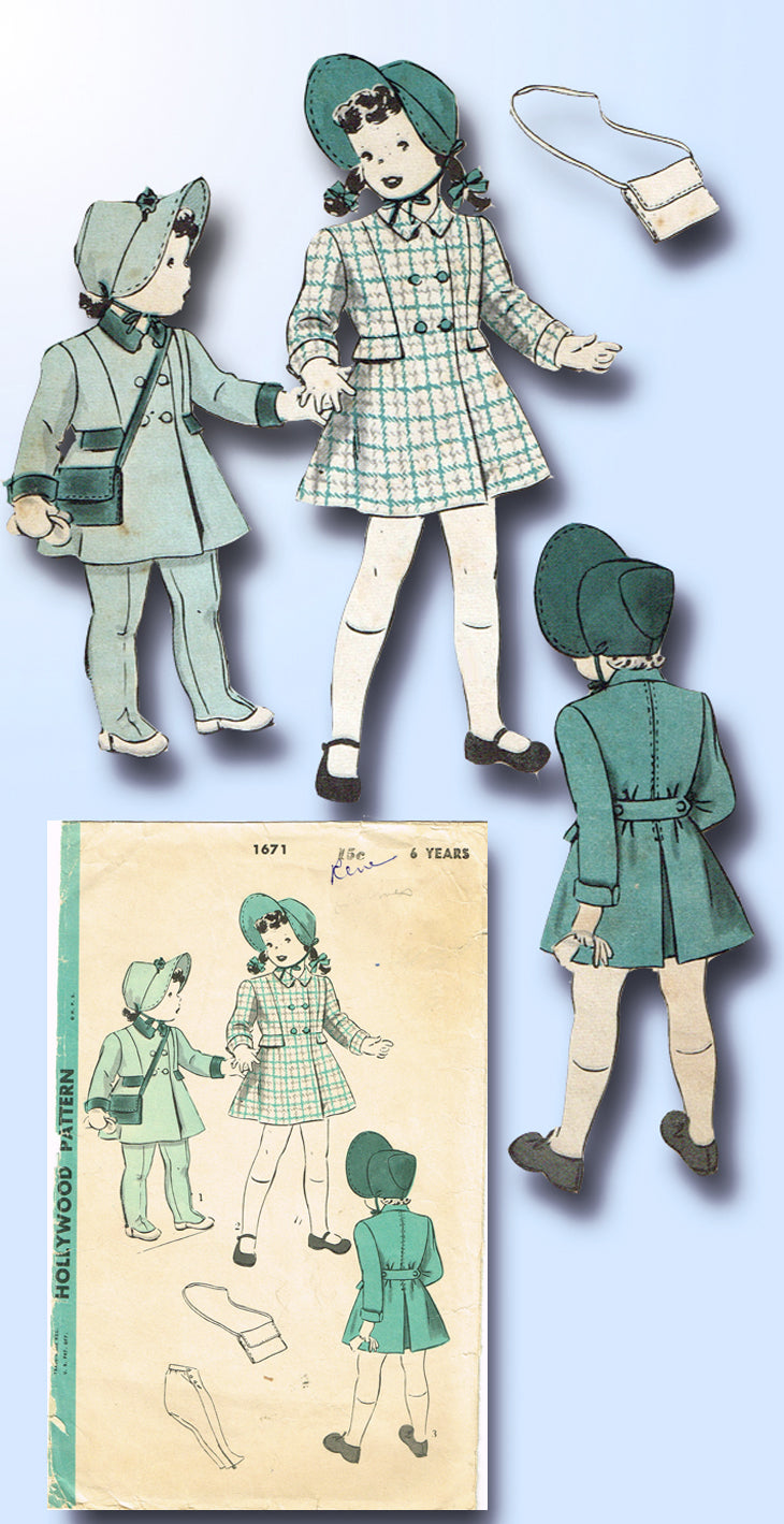 1940s Vintage Hollywood Sewing Pattern 1671 WWII Toddler Girls Coat & Bonnet Sz6