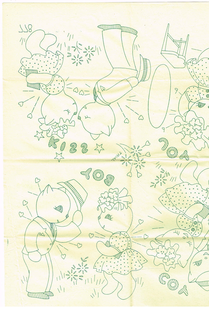 This is a very cute transfer from Alice Brooks Mail Order Transfers in the 1950s. This transfer is so sweet, I call this tea towel style "Romance" because it features two kittens through the stages of their relationship.
