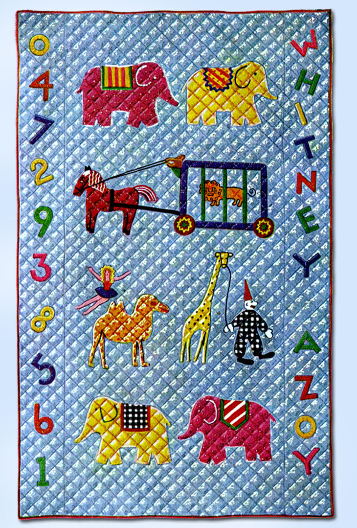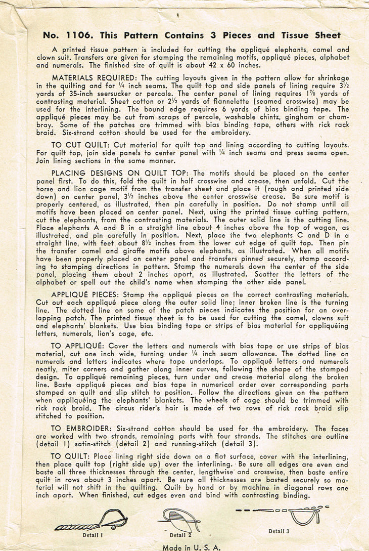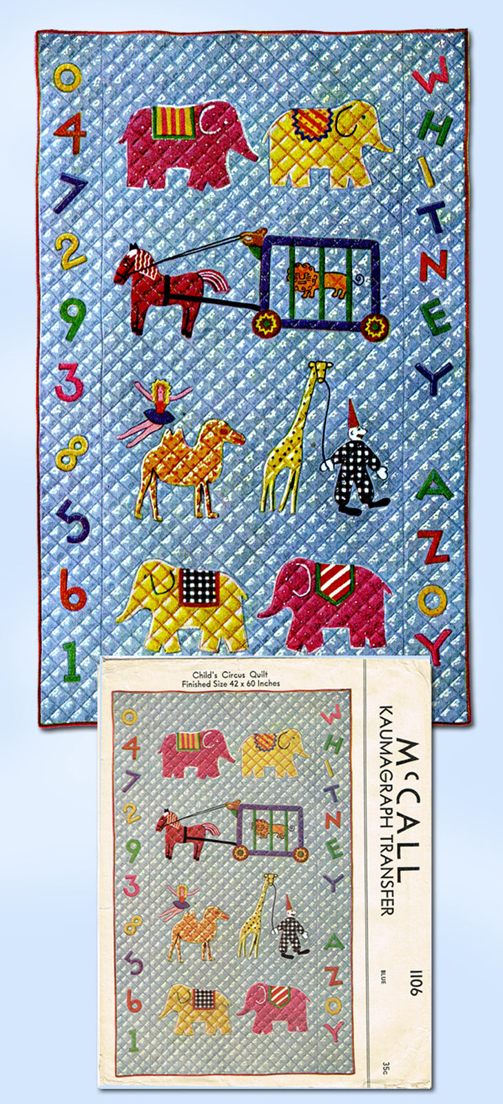 This transfer has the cutest applique motifs with circus animals and more.  It even has letters and numbers to spell a name to trim the edges of the quilt.  It is a really unique and playful take on the typical crib quilt.  This quilt is a little larger than a crib quilt, I think it would fit a toddler bed or maybe a twin.  It measures 42 x 60 inches.  This transfer is factory folded and unused. It comes with the original envelope.