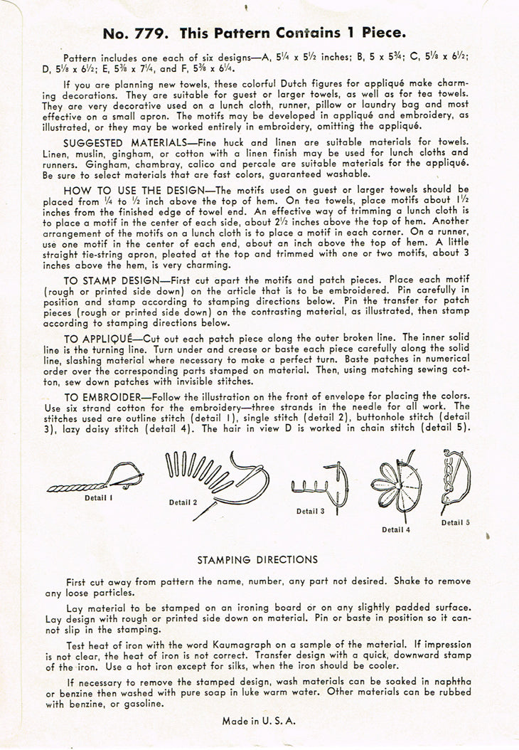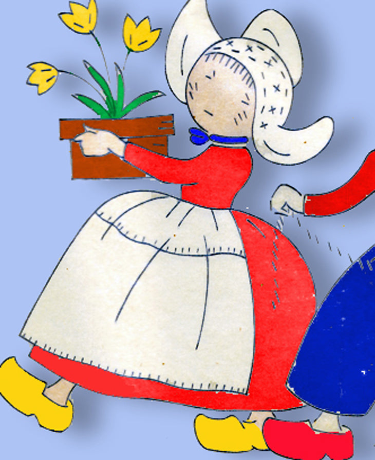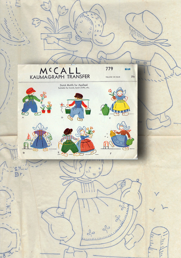 This is a very rare embroidery transfer from McCall in 1940. This one has a really cute dutch couple that you mostly see from the back. They are done in applique and are great for tea towels, curtains, lunch cloths and more.
