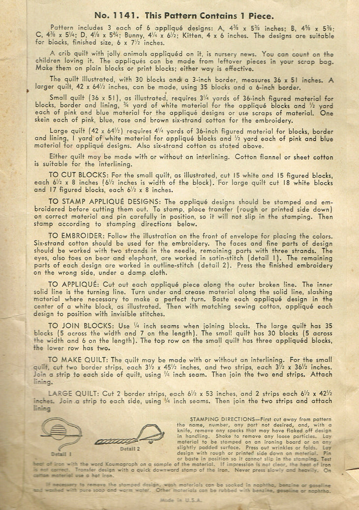 This transfer has darling applique animal motifs for a baby's crib quilt.  This WWII transfer is perfect for making a quilt from scraps of fabric. This transfer is uncut and unused but has extra wrinkles from storage.  It comes with the original envelope.