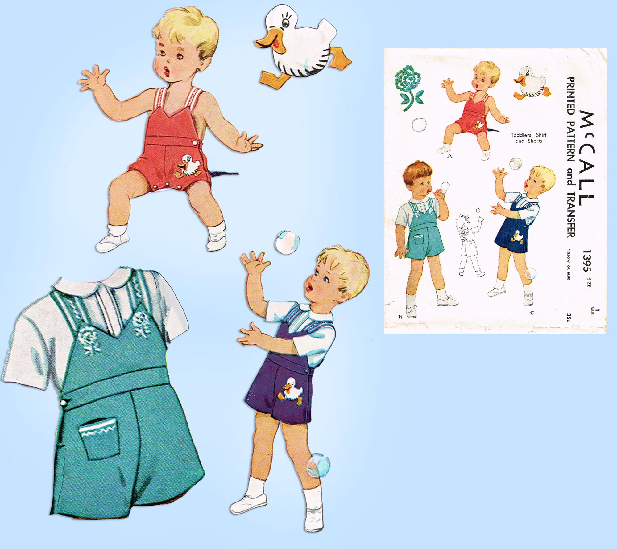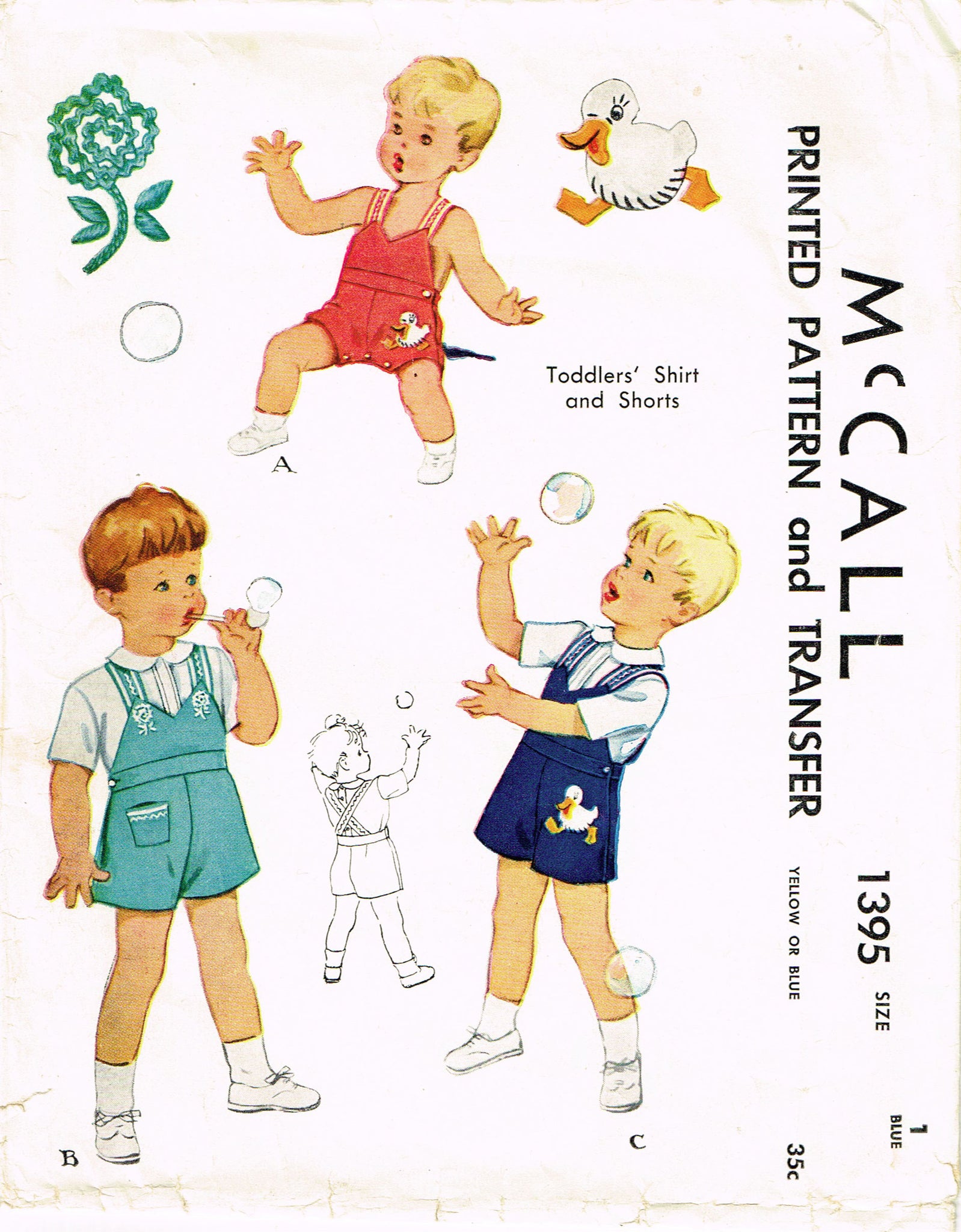 1940s Vintage McCall Sewing Pattern 1395 Toddler Boys Ducky Romper & Blouse Sz 1