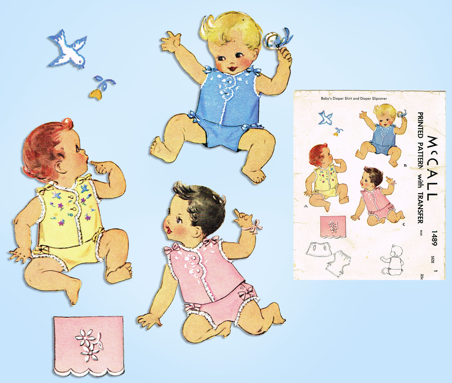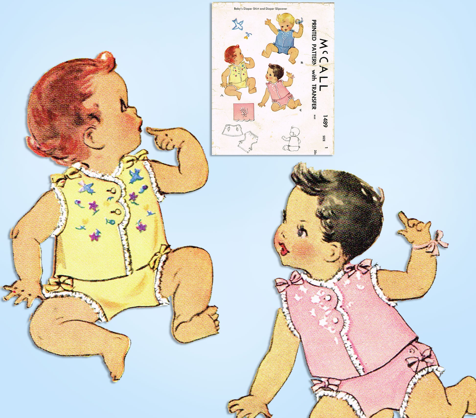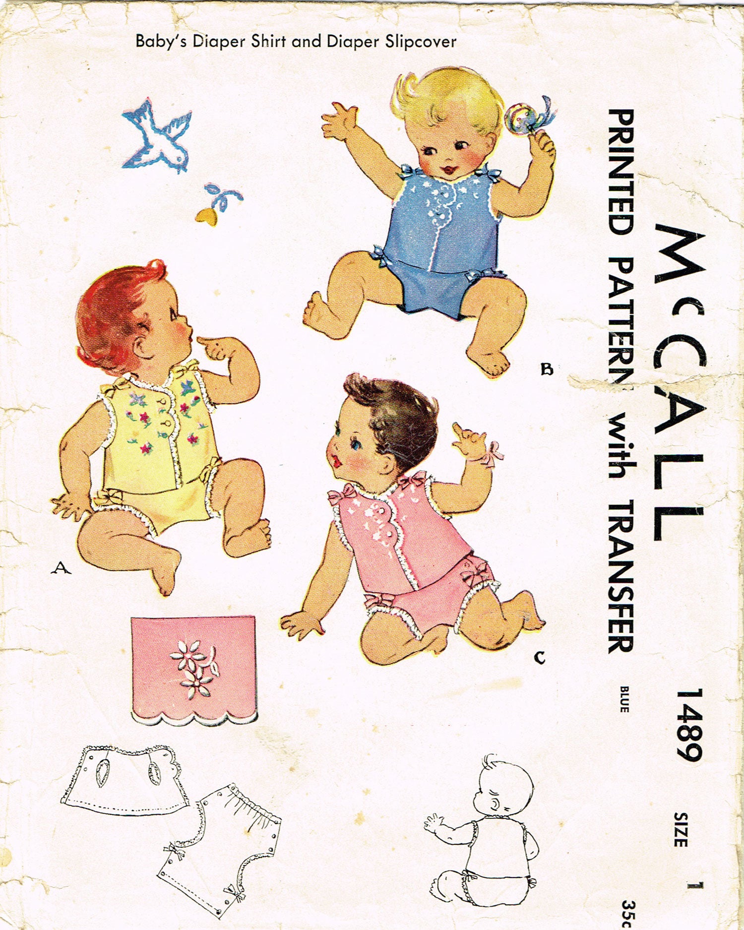 1940s Vintage McCall Sewing Pattern 1489 Embroidered Baby Shirt & Diaper Cover 1