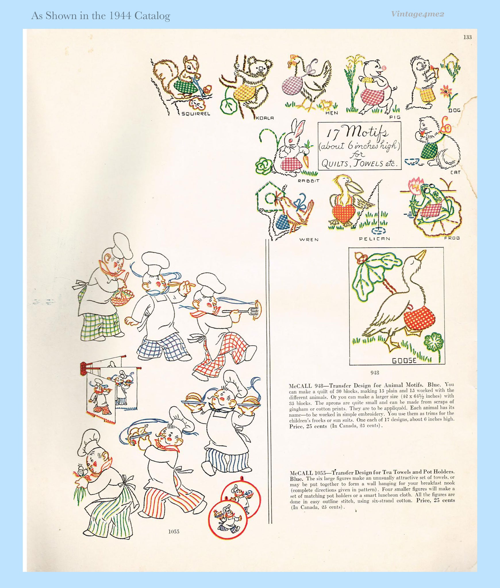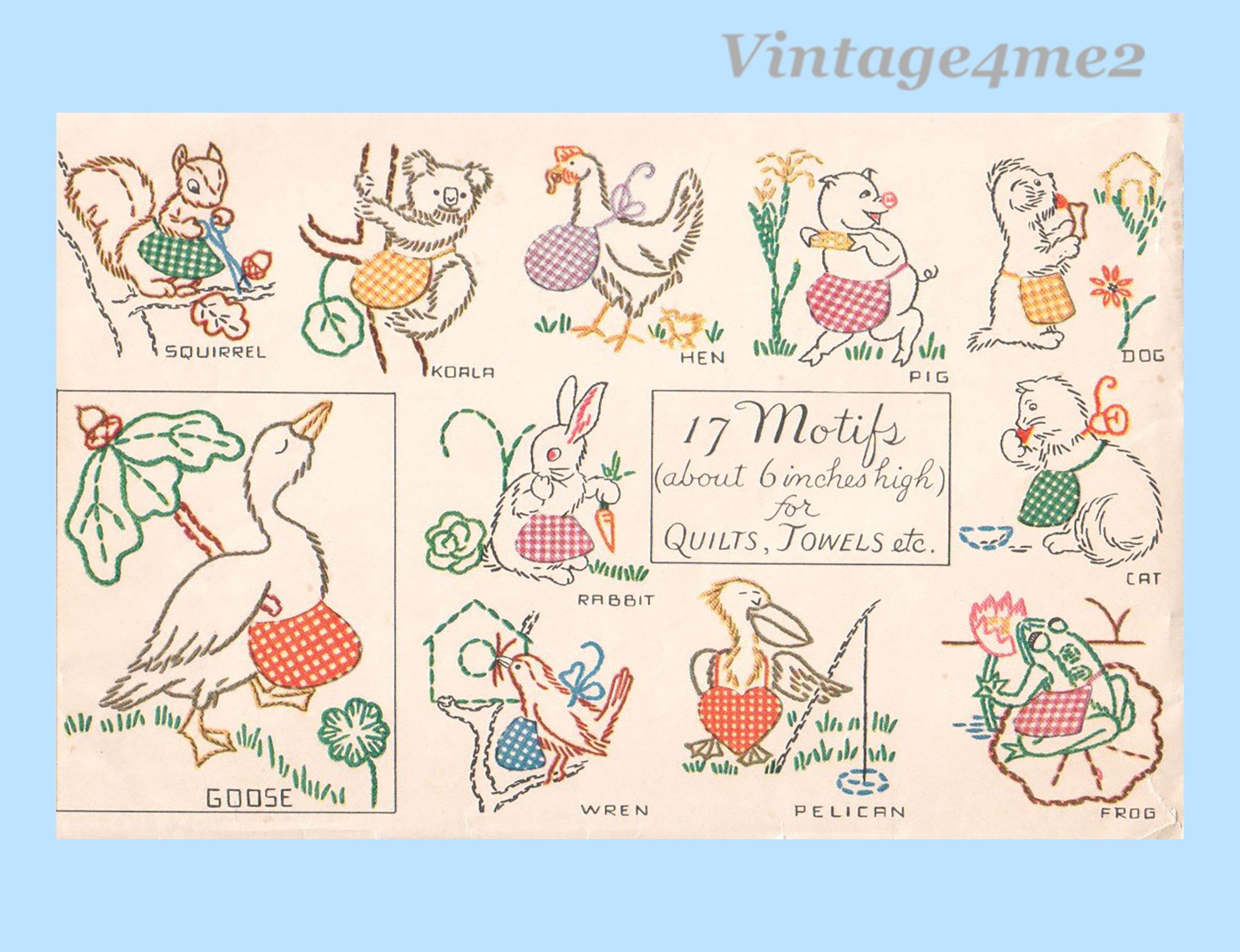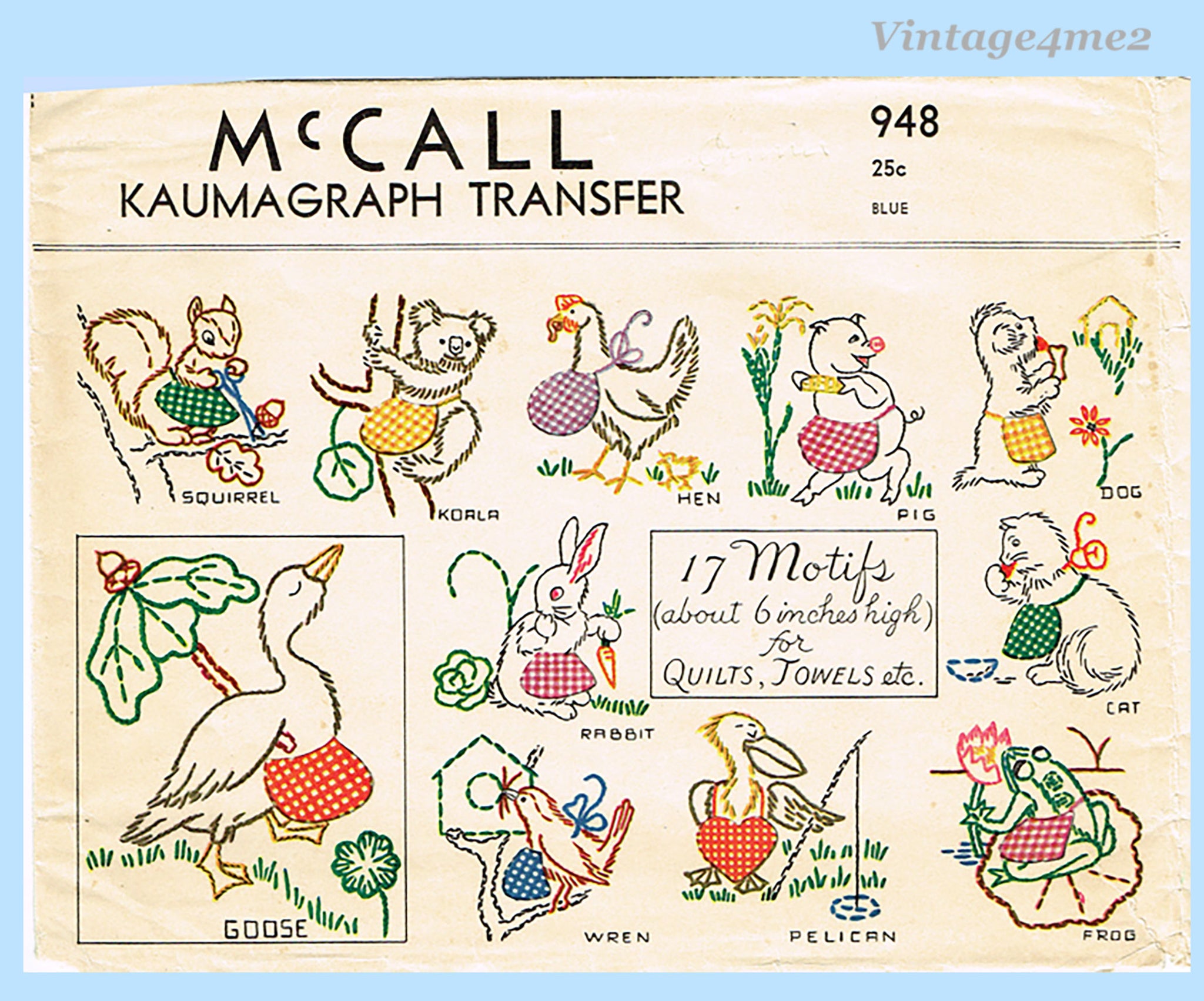 This is a honey of a vintage transfer...It is from McCall in 1942. It has animal motifs with human like accessories like aprons and purses. They are ideal for baby crib quilts and clothes. There are 17 motifs measuring about 6 inches tall.