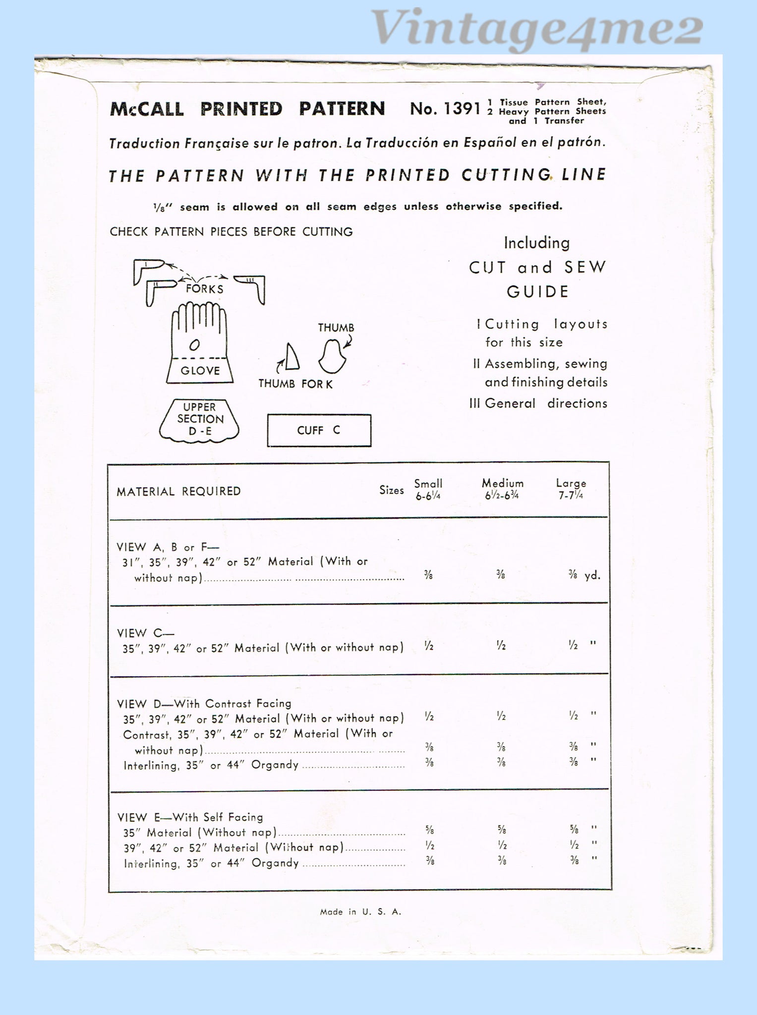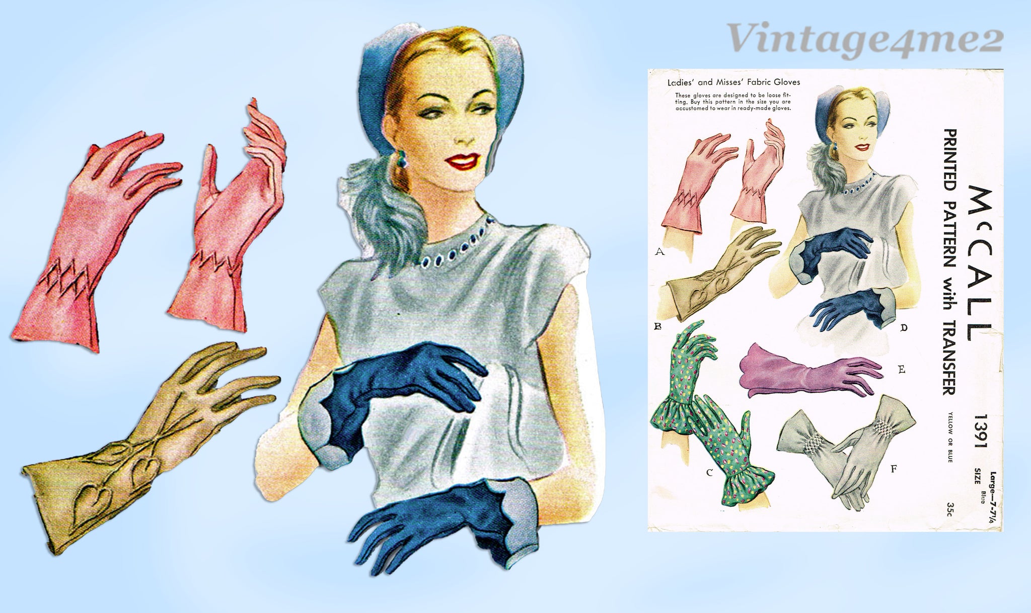 1940s Vintage McCalls Sewing Pattern 1391 Uncut Misses Set of Gloves Size Large