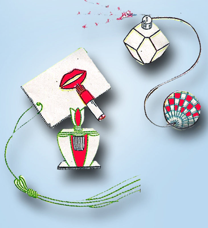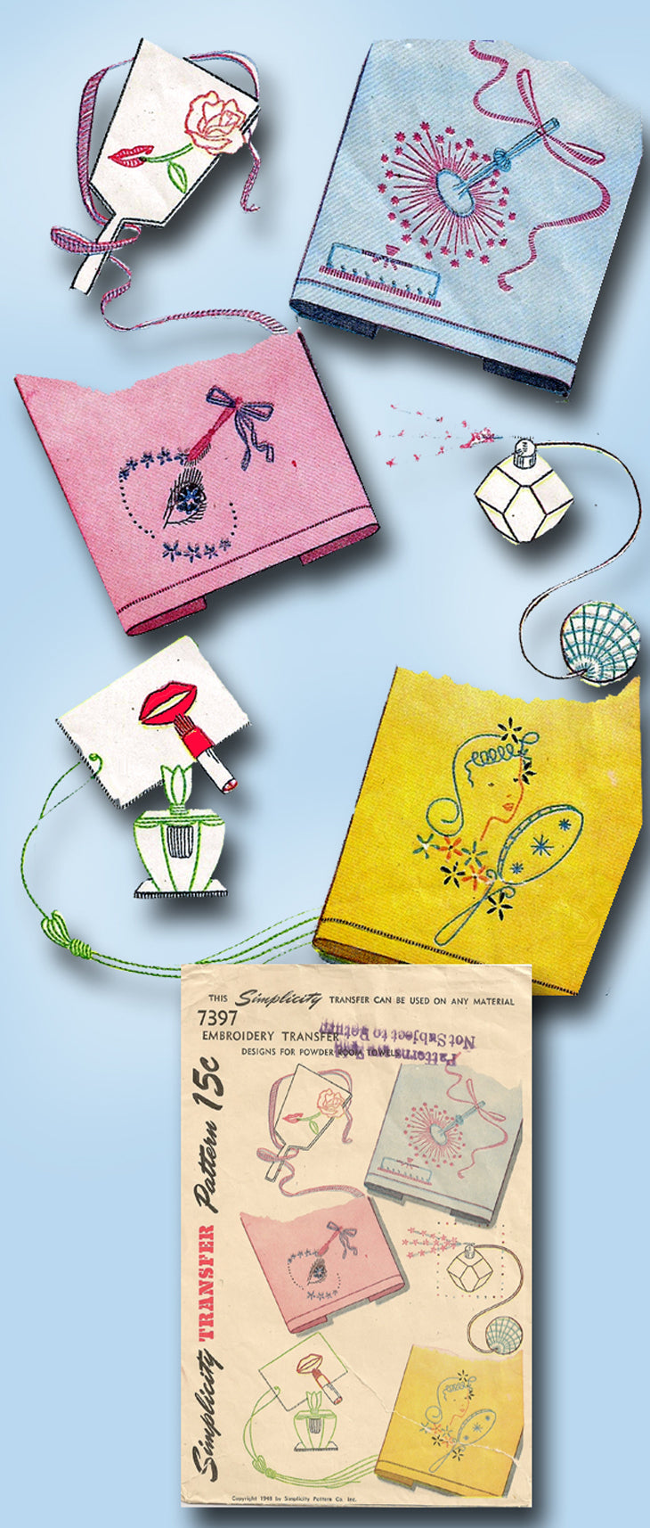 This is a charming Simplicity hot iron transfer dated 1948.  It has fun motifs for powder room tea towels, there are lipstick, perfume and other makeup motifs.  It is really unusual.  They are the perfect size for hand or guest towels.  This transfer is factory folded and unused and comes in the original envelope.