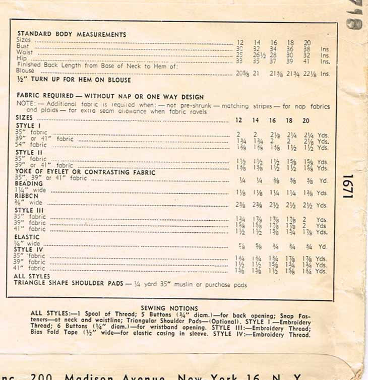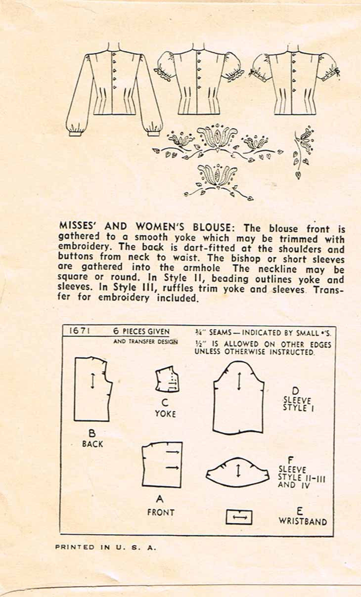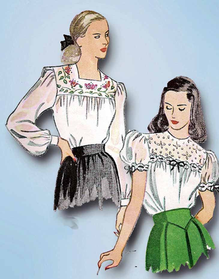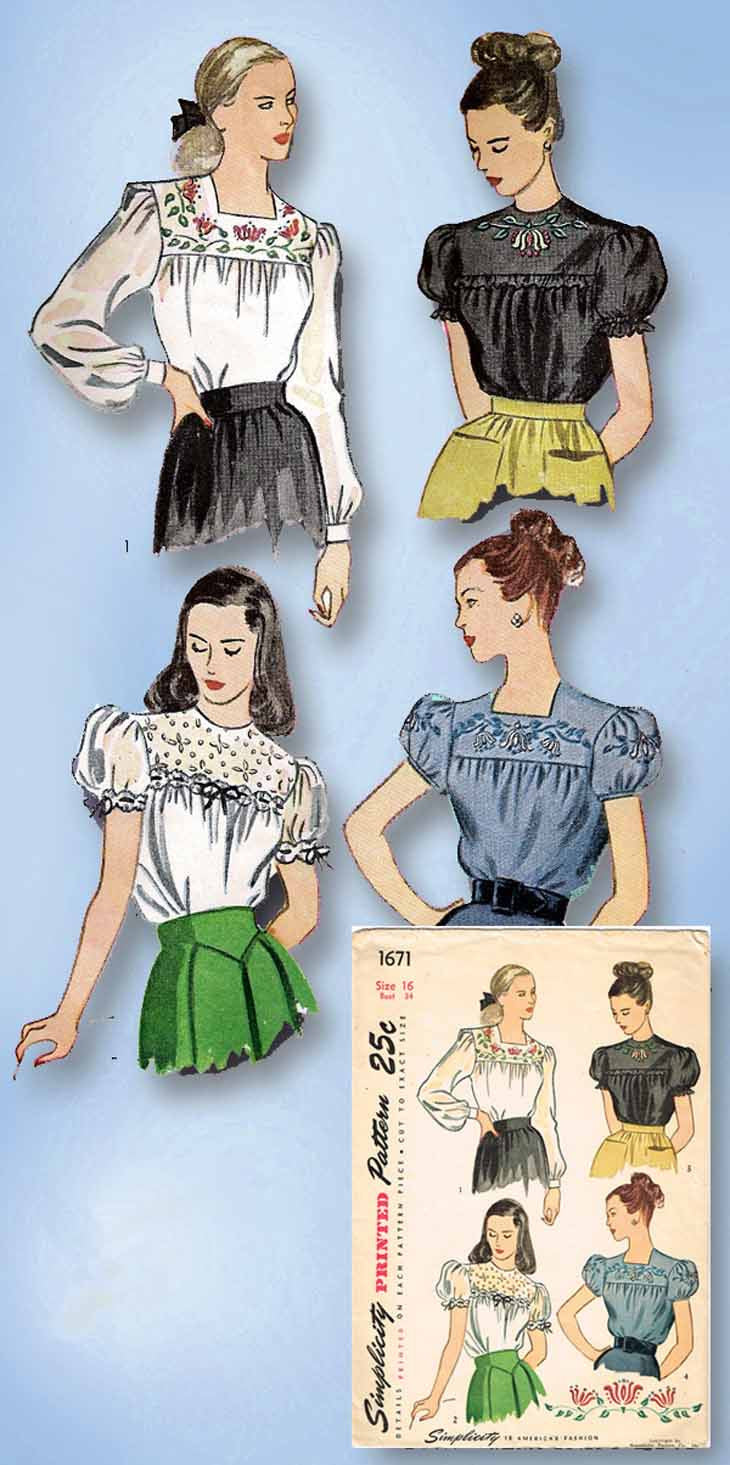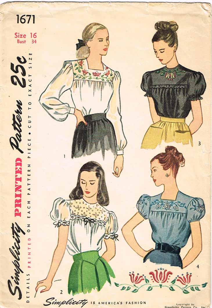 1940s Vintage Simplicity Sewing Pattern 1671 WWII Misses Embroidered Blouse Sz16